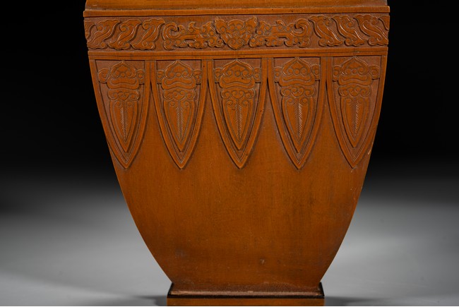 Qing Dynasty period. Of ovoid form supported on a short splayed foot, rising to a waisted neck, the body carved with bands of archaistic scrolls and plantain leaves, the neck decorated with ruyi shaped bands.