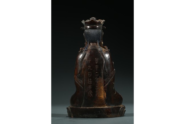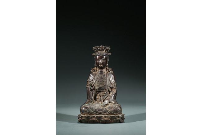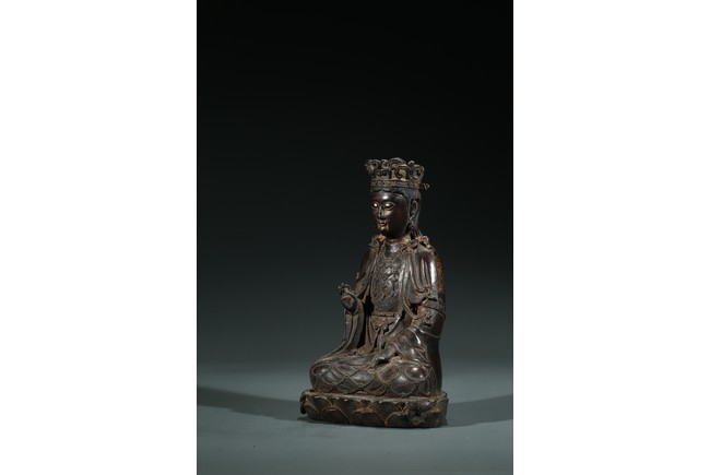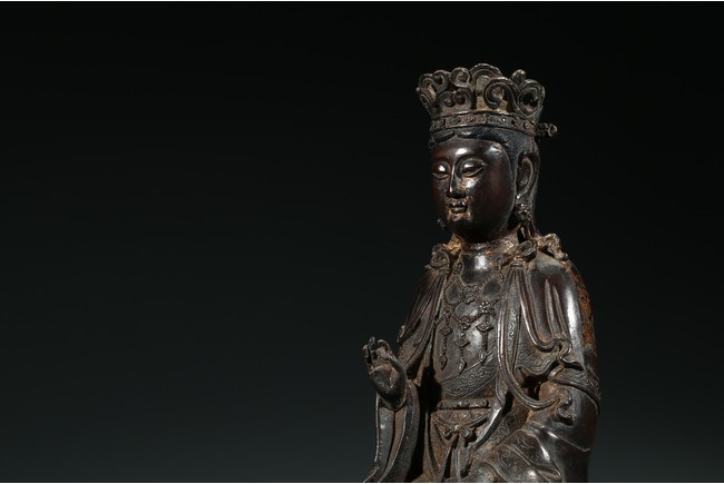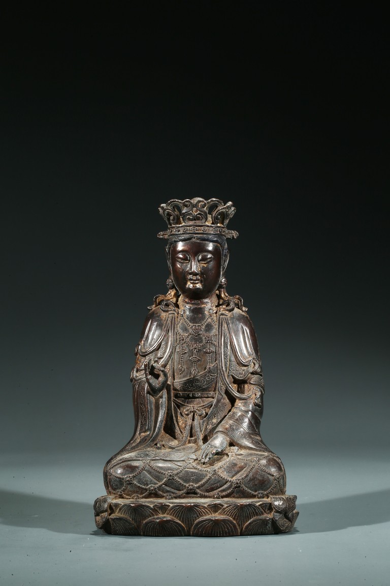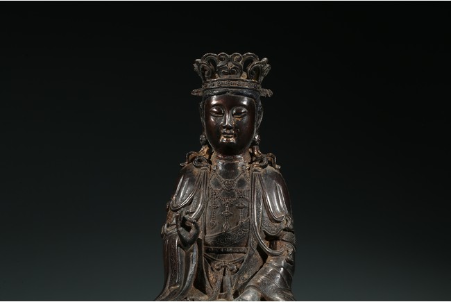 菩薩圓潤的面龐,始終微笑的臉頰令人望之而心安。微閉的眼神,那樣的柔和、慈祥,似乎可以化解芸芸眾生的一切苦難。左手置於膝前,右手拇指和中指輕拈,姿勢優美自然,栩栩如生。菩薩上身著雙領式通肩袈裟,胸部配飾瓔珞釧環,下身著高束腰長裙,衣紋處理採用了漢地傳統雕刻技法,自然流暢,生動寫實。整體做工精細,形態端莊,雕刻細緻入微,時代風格鮮明,為明代漢地造像。