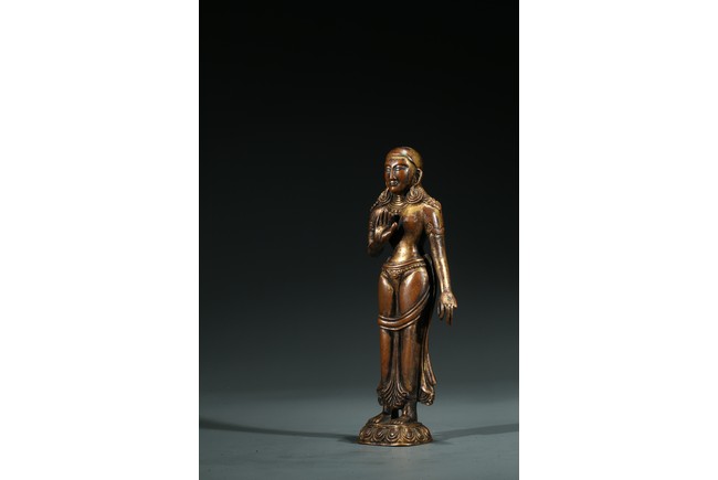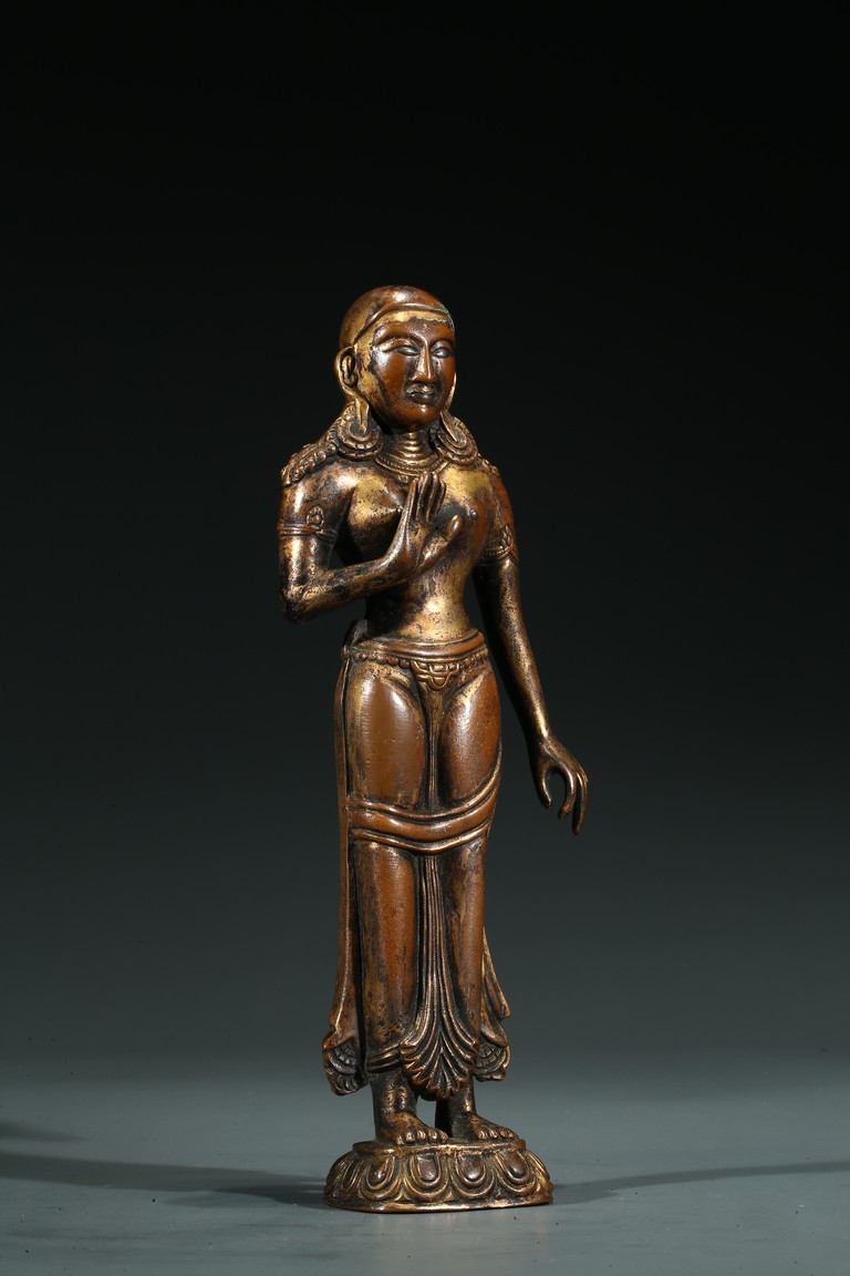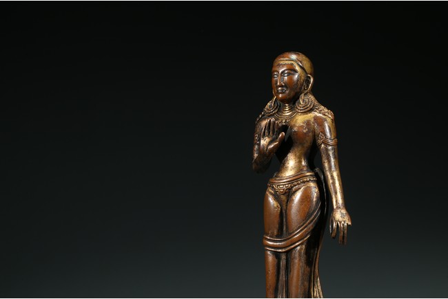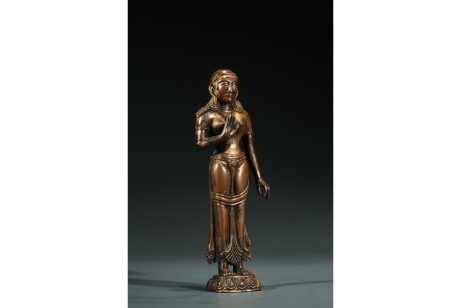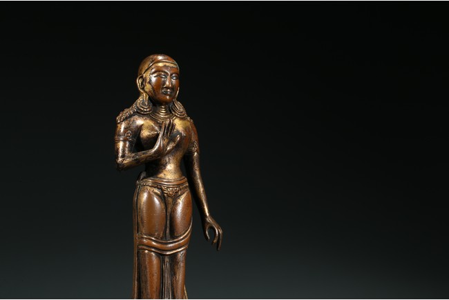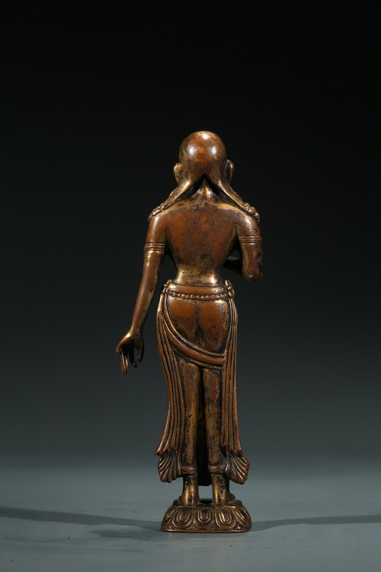 此觀音面容慈祥,雙目嵌銀眼,肩胸飽滿結實,其手指彎曲自然、柔軟,彷彿肌肉富有彈性,彰顯工藝技術的不凡。合金銅質溫潤細膩,局部還殘留鎏金,材質與工藝均為上乘,在把握造像整體神韻的同時,注重每一處細節的刻畫,可見匠師制像時的虔誠用心,法相莊嚴華美。