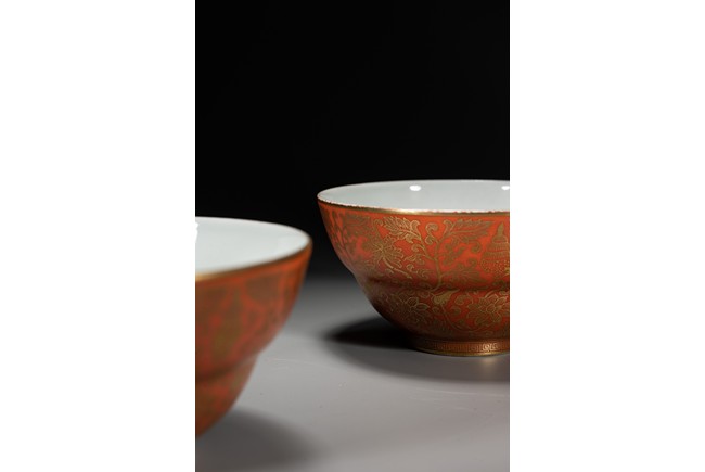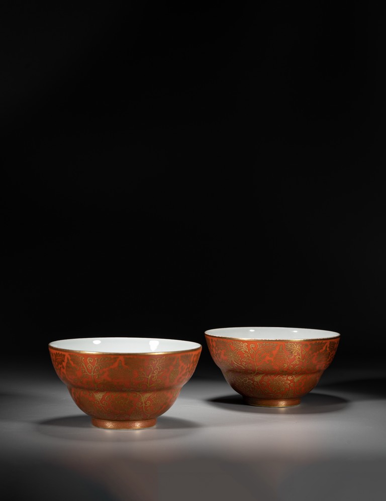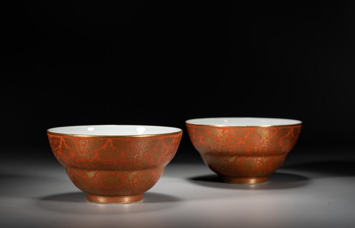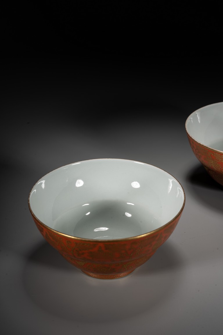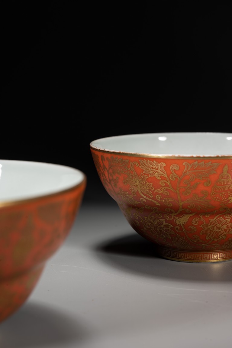 Each bowl finely decorated around the exterior with leafy flowers in gilt against coral red ground, base inscribed with reign mark.