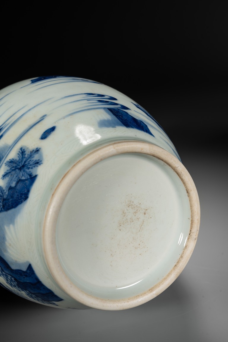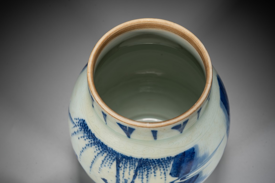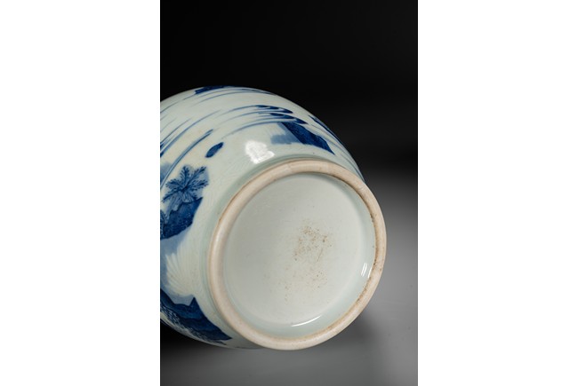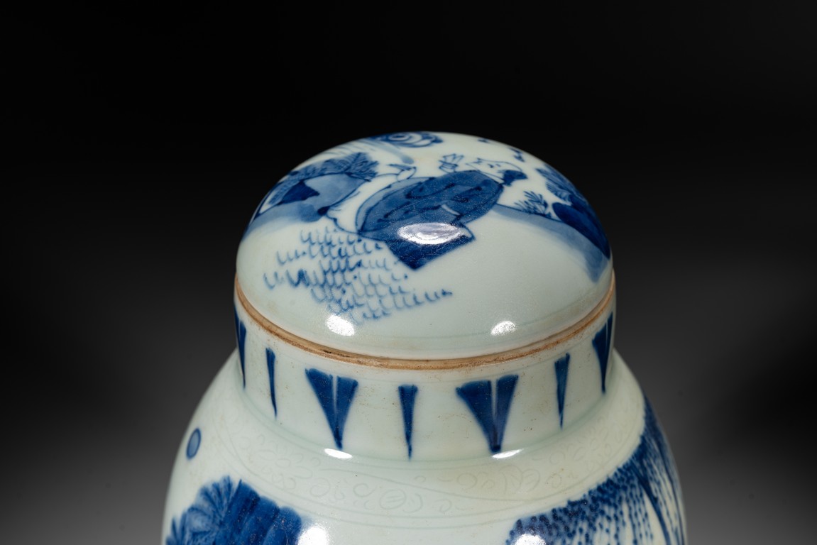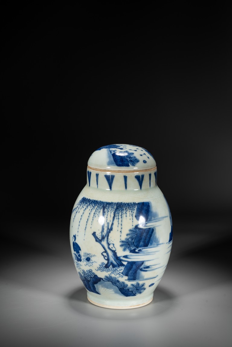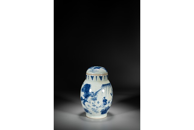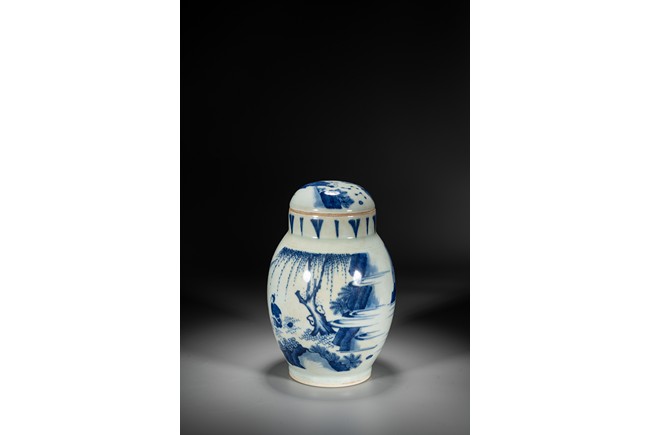 直口,口無釉,帶蓋,溜肩,長圓形腰鼓腹,圈足,此罐以其型狀似蓮子而得名“蓮子罐”,器身繪有青花通景人物故事圖,口沿、肩及圈足上部皆有暗刻花紋,罐底光素。整體胎體厚重,施釉均勻細潤,青花色澤艷麗,由淺到深層次豐富,繪畫技藝嫻熟,出神入化,人物繪畫飄逸自然,顯得超然脫俗。