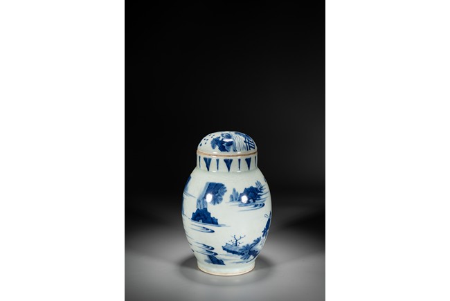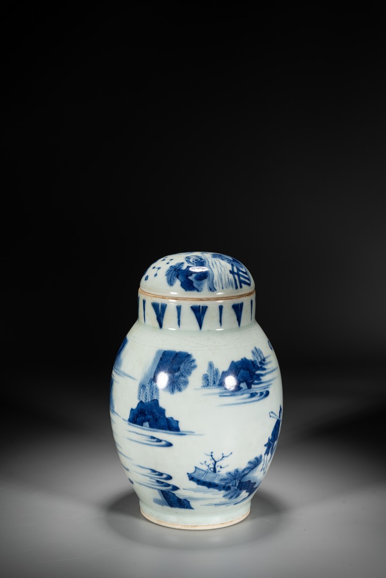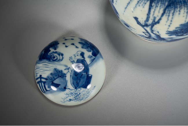 The body finely decorated in blue and white with artisan figures in a garden scene, the cover further decorated with a seated figure, base glazed.