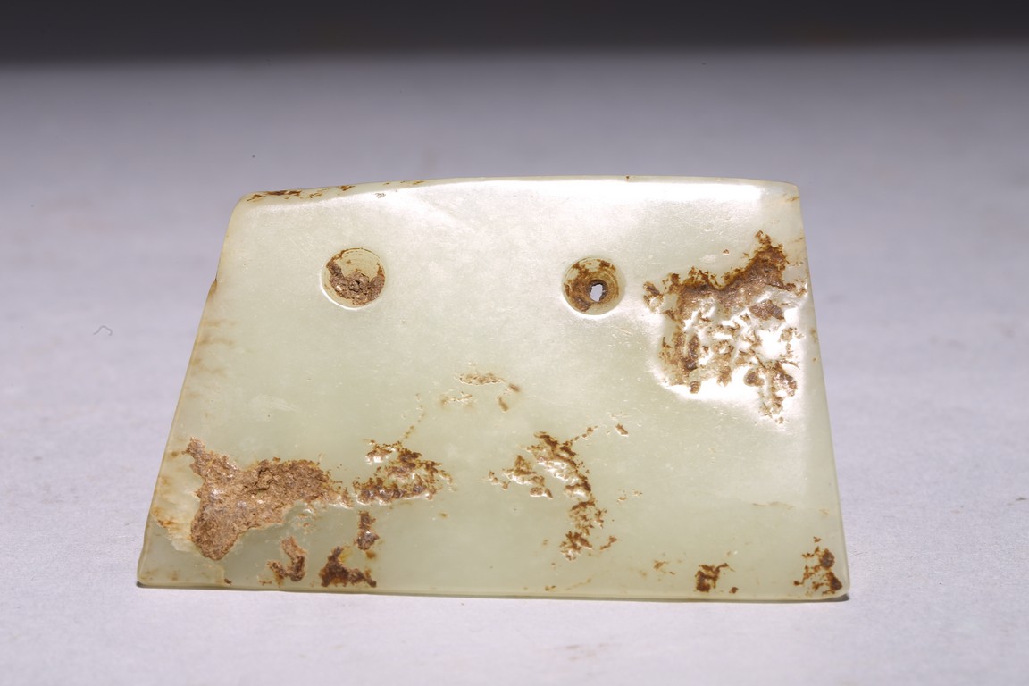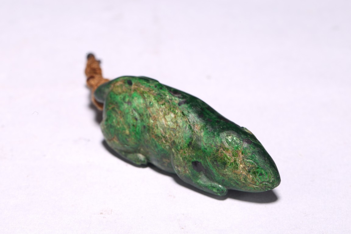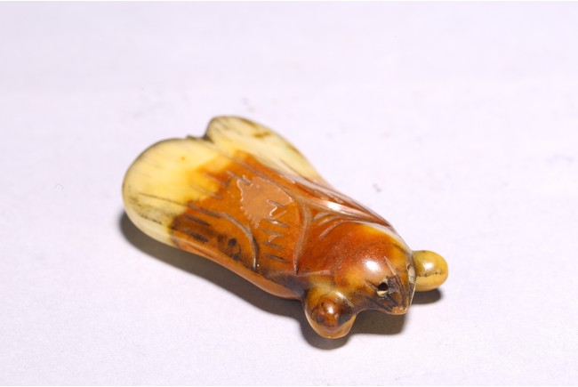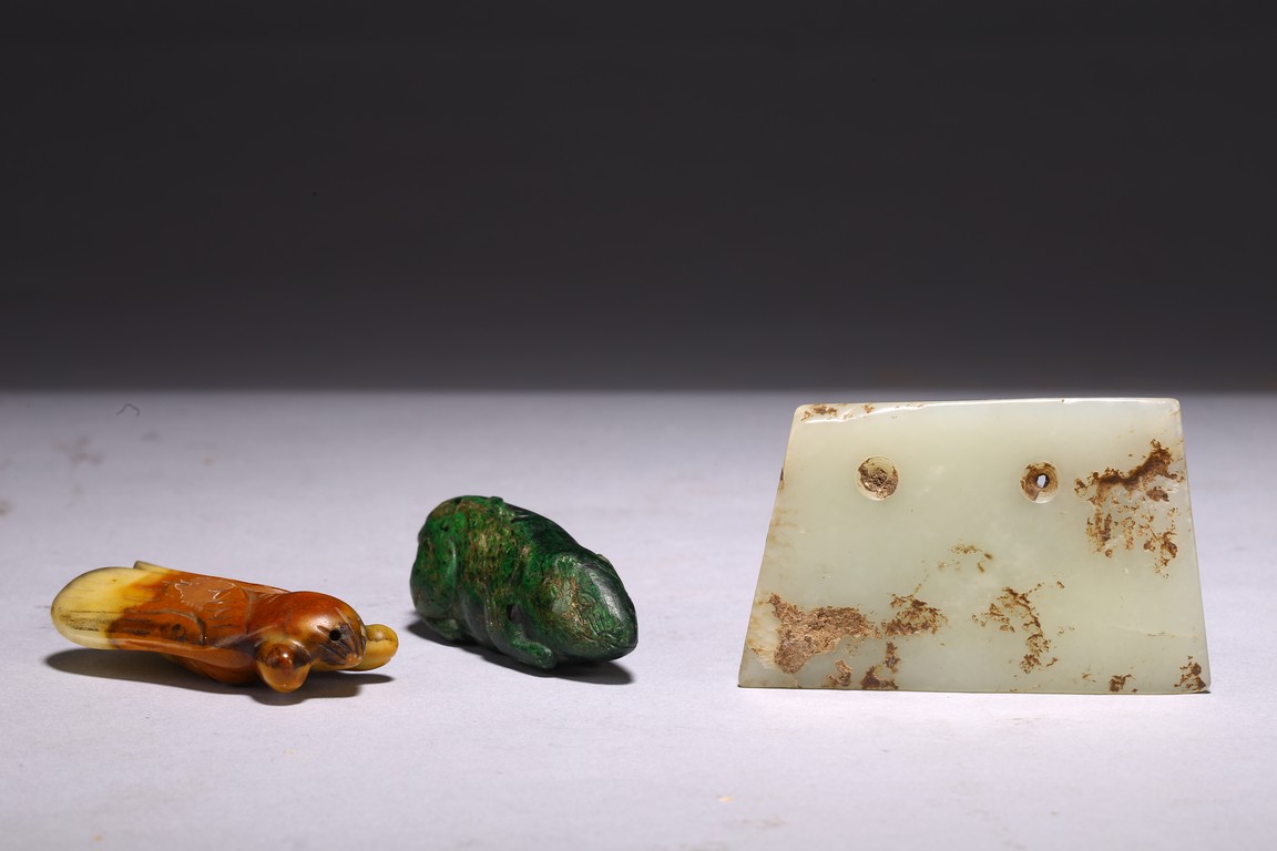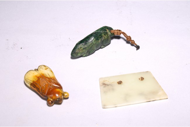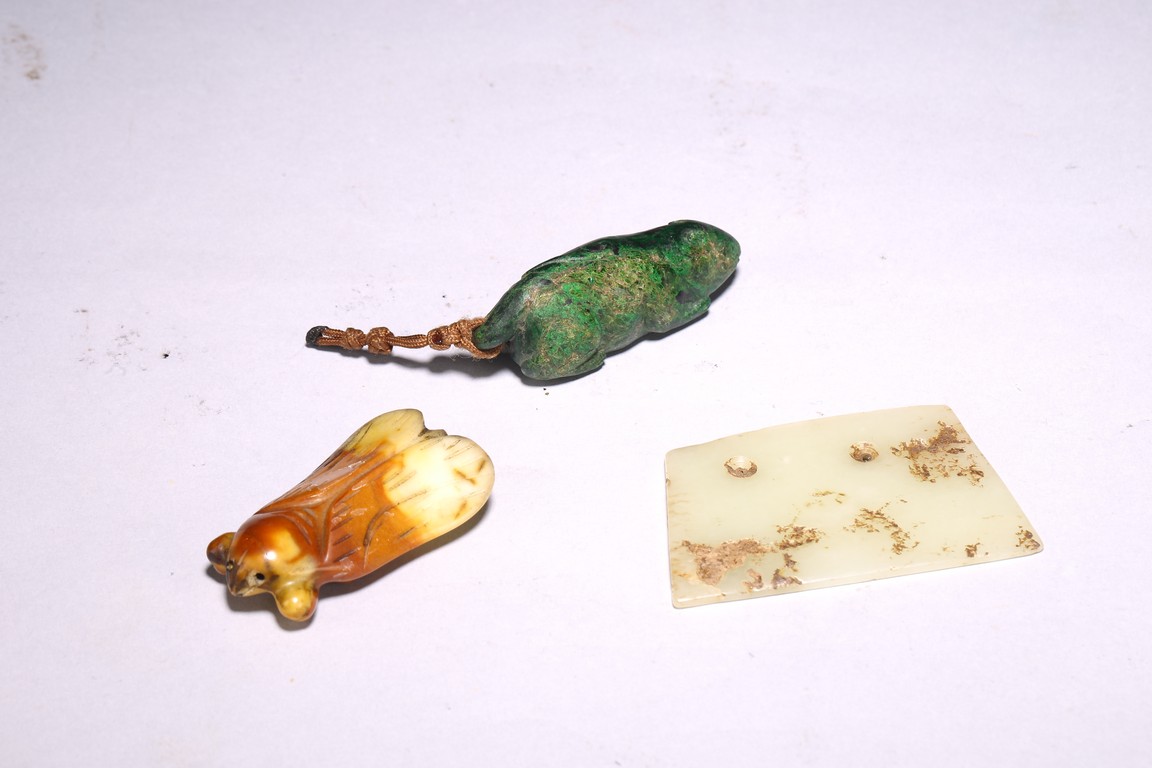A group of three jade carvings, including a green jade rabbit carving, a russet jade cicada, and a white jade carving