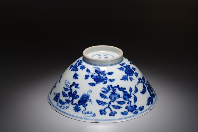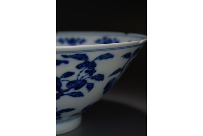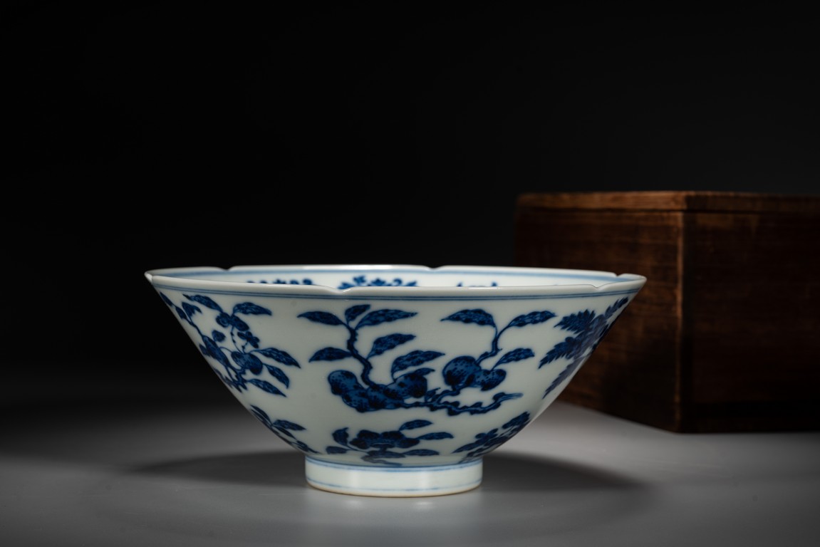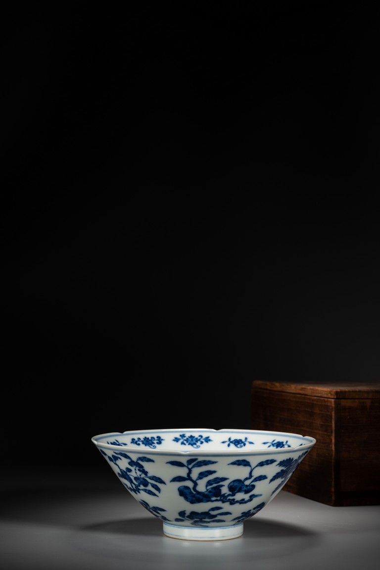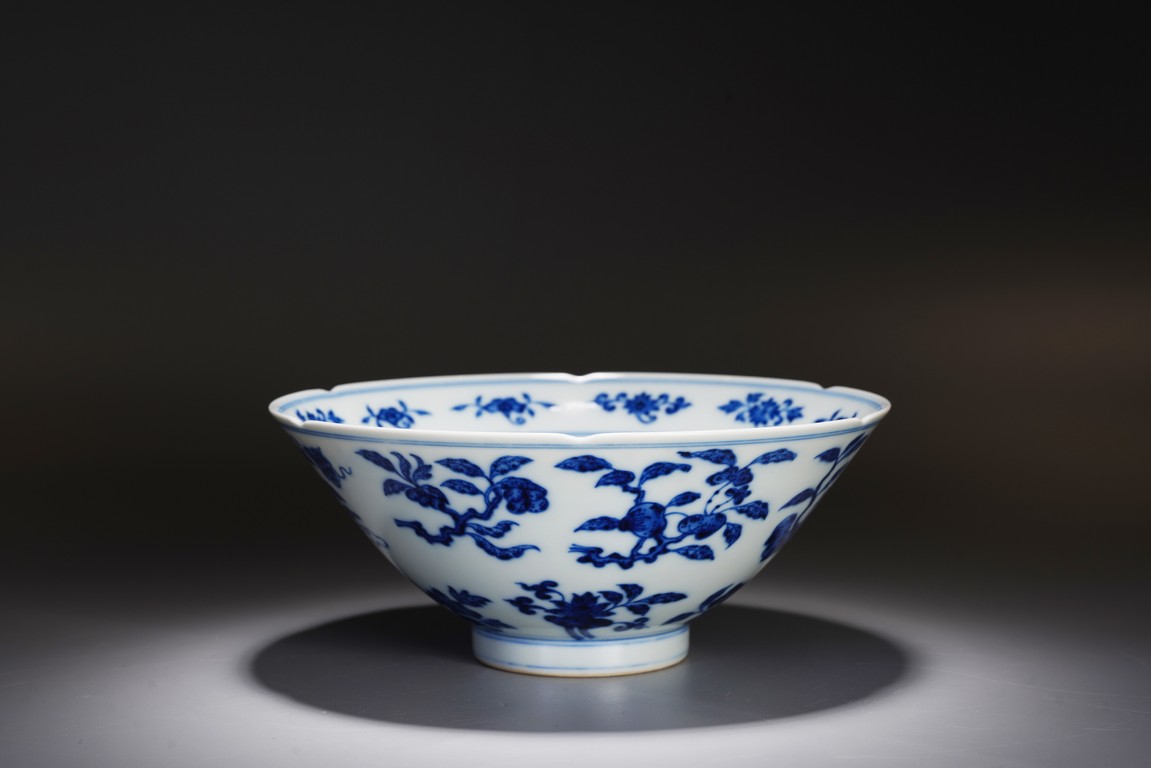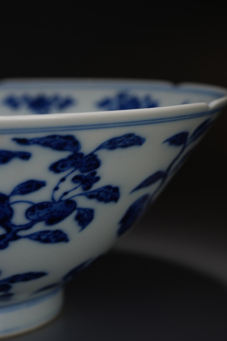 此碗器仿永宣,為雍正慕古造型,為融合仿古與創新之裝飾方法於一體的傑作。花口,斜腹,呈鬥笠狀,圈足。外壁裝飾兩重紋樣,上為六組折枝瑞果紋,下為六組折枝花卉紋,交錯佈置,內壁口沿綴飾十二式花卉紋,下承六組折枝花卉紋與外壁紋飾相對應,碗心則也繪折枝花卉紋。祥花如“菊花、牡丹、蓮花、茶花”,瑞果如“蟠桃、枇杷、荔枝、石榴、葡萄、櫻桃”,其繪畫寫實逼真,諸花妍放生姿,眾果飽滿誘人。整體紋飾疏朗而飽滿,寫實傳神,青花色澤艷麗濃重,勾、勒、點、染諸法,運用皆宜,線條粗細並用,青料濃淡兼施,呈色極富層次,令畫面富具蒼翠欲滴的意趣。 “大清雍正年制”款識。
