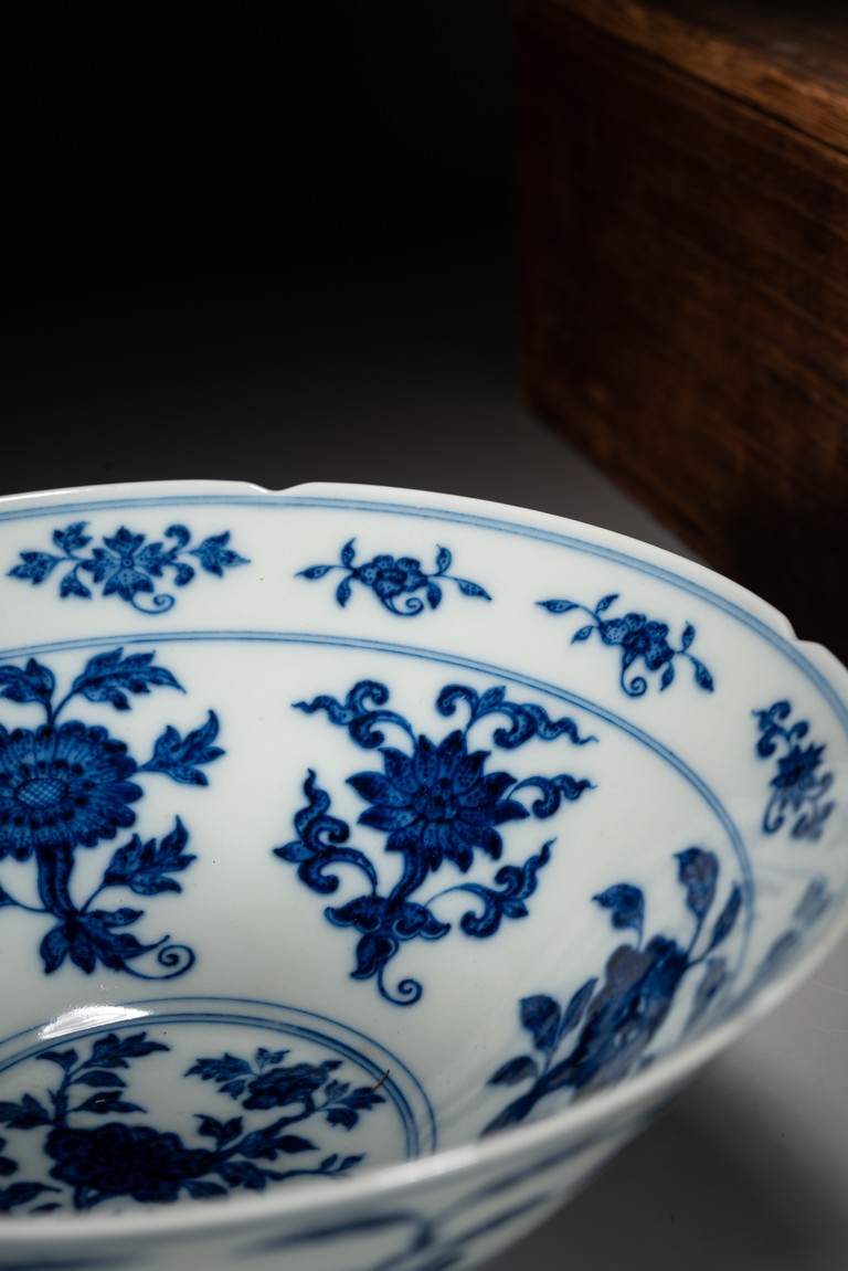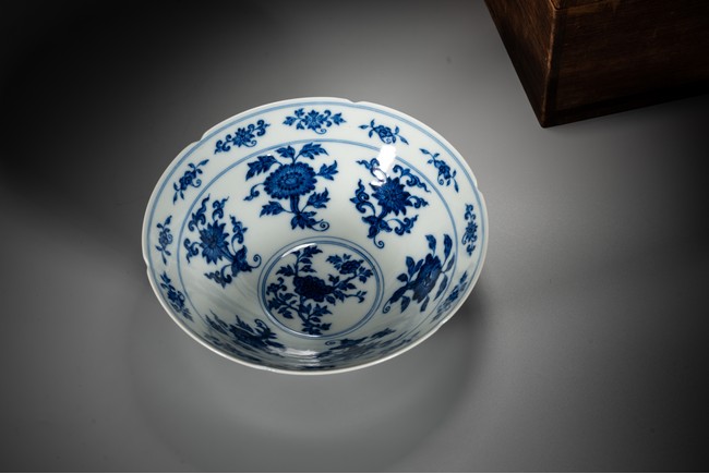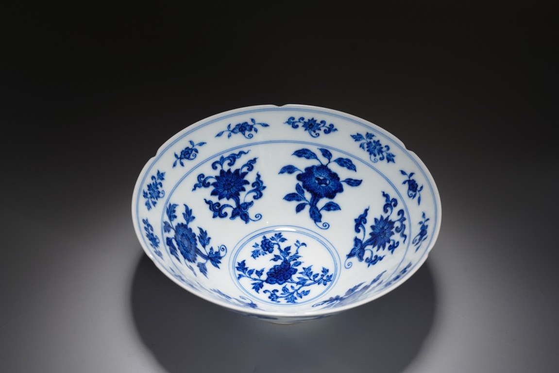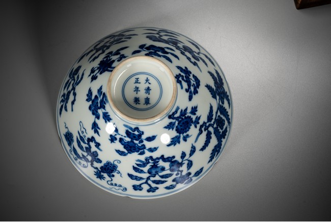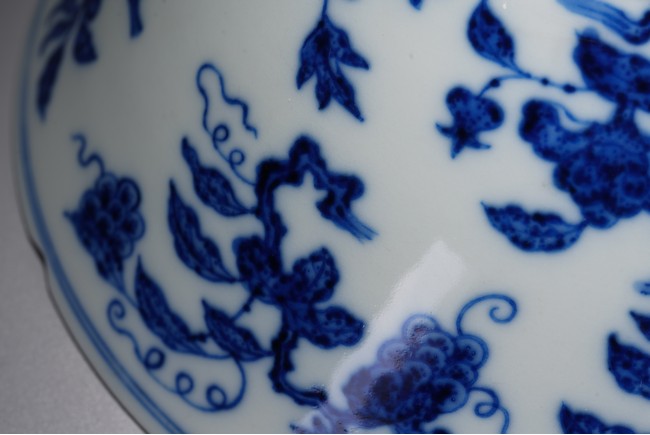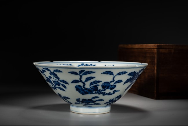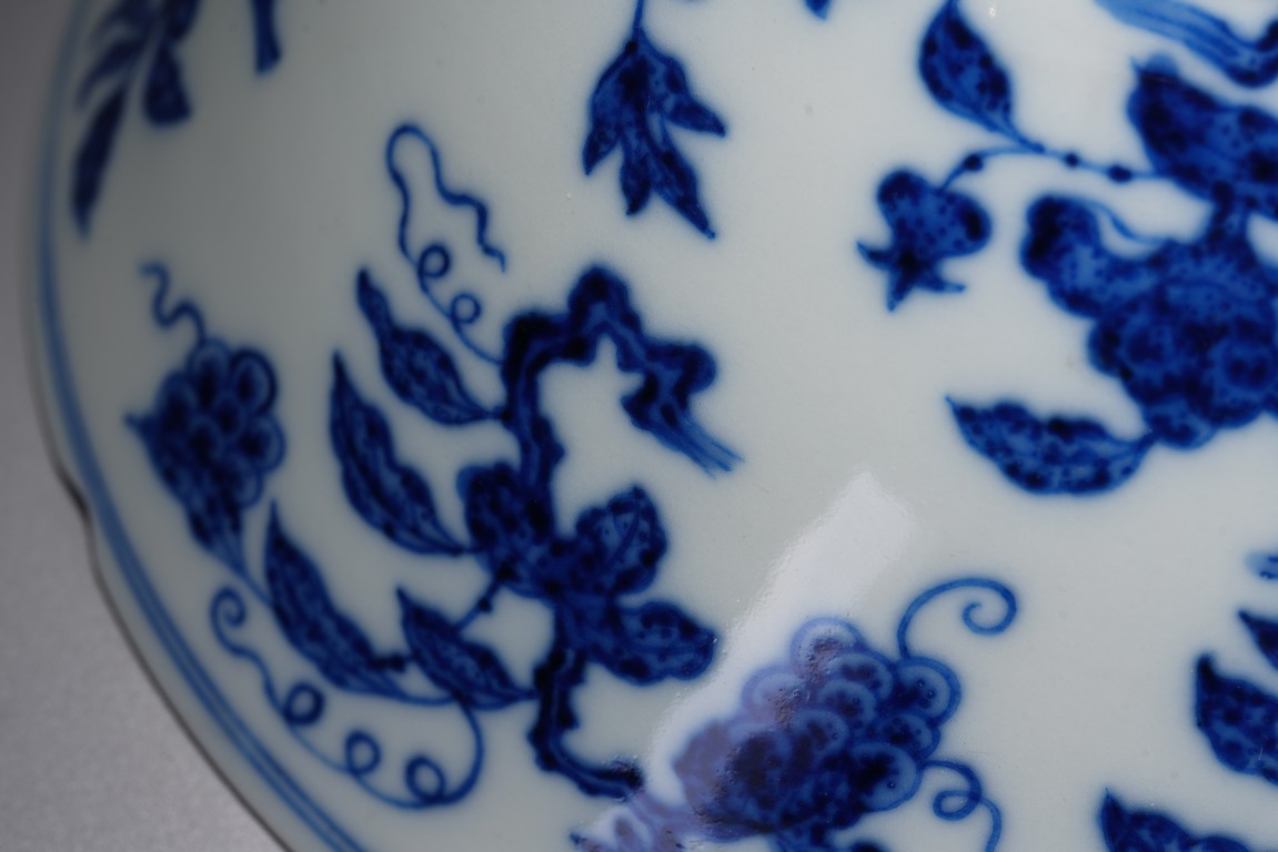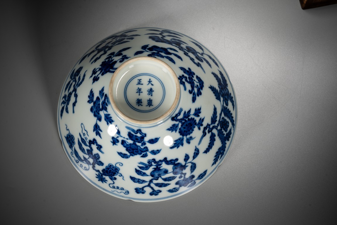 此碗器仿永宣,為雍正慕古造型,為融合仿古與創新之裝飾方法於一體的傑作。花口,斜腹,呈鬥笠狀,圈足。外壁裝飾兩重紋樣,上為六組折枝瑞果紋,下為六組折枝花卉紋,交錯佈置,內壁口沿綴飾十二式花卉紋,下承六組折枝花卉紋與外壁紋飾相對應,碗心則也繪折枝花卉紋。祥花如“菊花、牡丹、蓮花、茶花”,瑞果如“蟠桃、枇杷、荔枝、石榴、葡萄、櫻桃”,其繪畫寫實逼真,諸花妍放生姿,眾果飽滿誘人。整體紋飾疏朗而飽滿,寫實傳神,青花色澤艷麗濃重,勾、勒、點、染諸法,運用皆宜,線條粗細並用,青料濃淡兼施,呈色極富層次,令畫面富具蒼翠欲滴的意趣。 “大清雍正年制”款識。