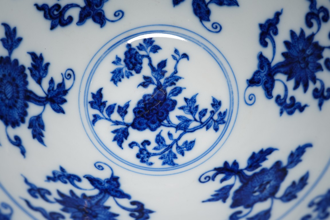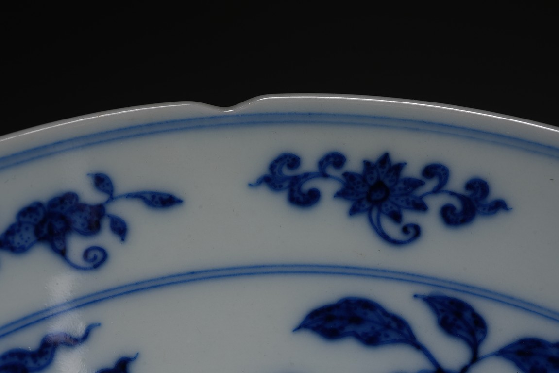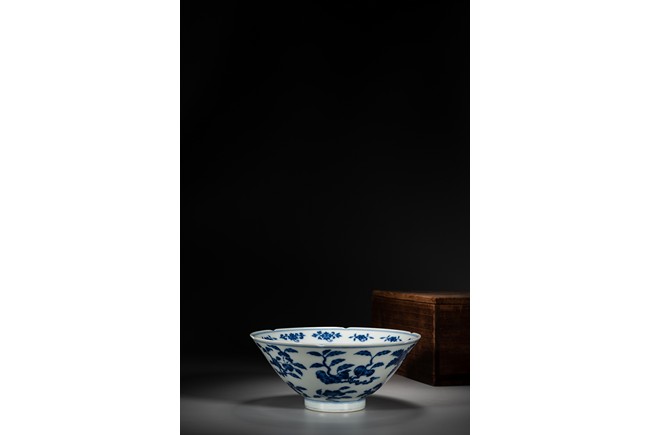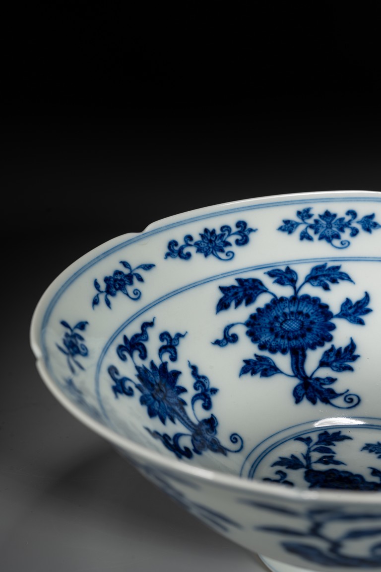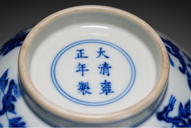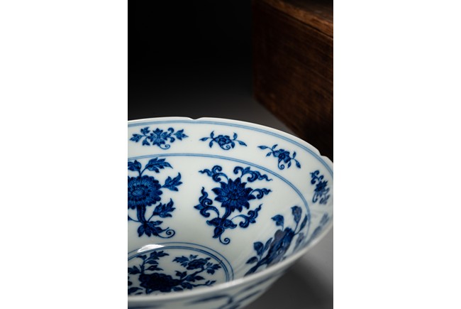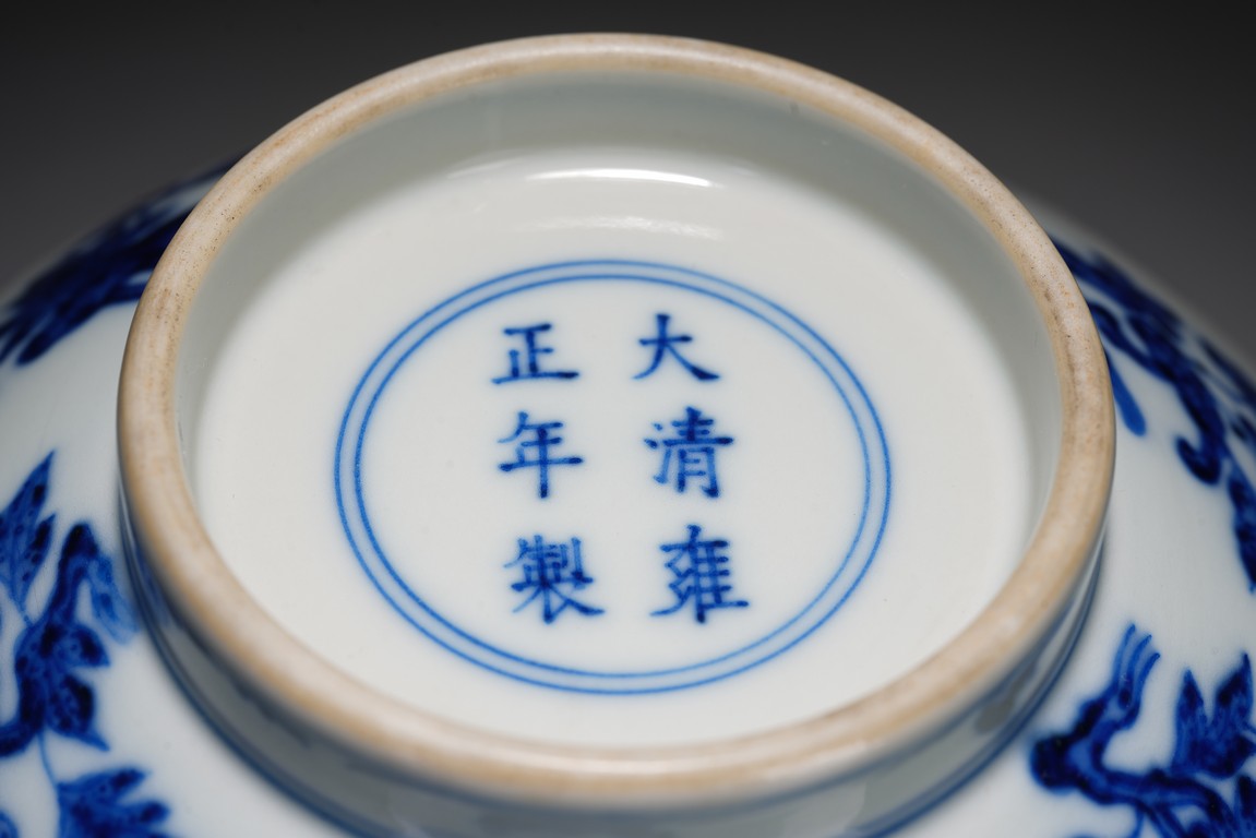 此碗器仿永宣,為雍正慕古造型,為融合仿古與創新之裝飾方法於一體的傑作。花口,斜腹,呈鬥笠狀,圈足。外壁裝飾兩重紋樣,上為六組折枝瑞果紋,下為六組折枝花卉紋,交錯佈置,內壁口沿綴飾十二式花卉紋,下承六組折枝花卉紋與外壁紋飾相對應,碗心則也繪折枝花卉紋。祥花如“菊花、牡丹、蓮花、茶花”,瑞果如“蟠桃、枇杷、荔枝、石榴、葡萄、櫻桃”,其繪畫寫實逼真,諸花妍放生姿,眾果飽滿誘人。整體紋飾疏朗而飽滿,寫實傳神,青花色澤艷麗濃重,勾、勒、點、染諸法,運用皆宜,線條粗細並用,青料濃淡兼施,呈色極富層次,令畫面富具蒼翠欲滴的意趣。 “大清雍正年制”款識。
