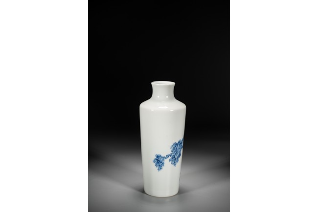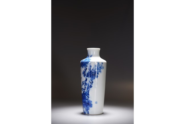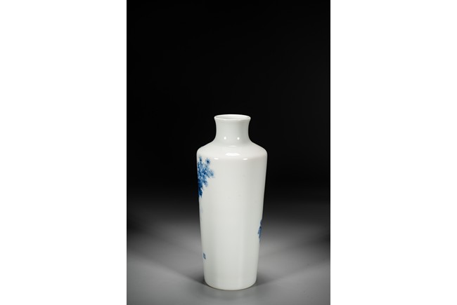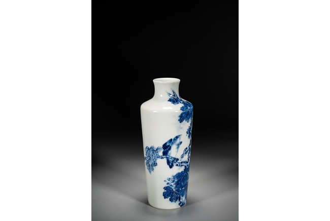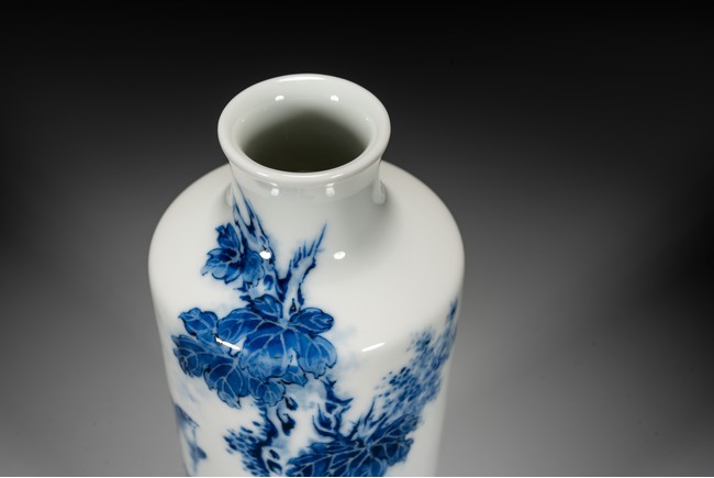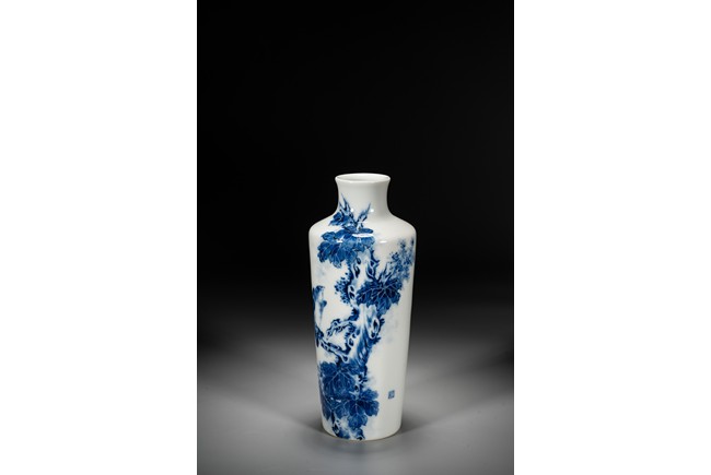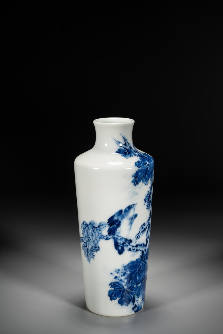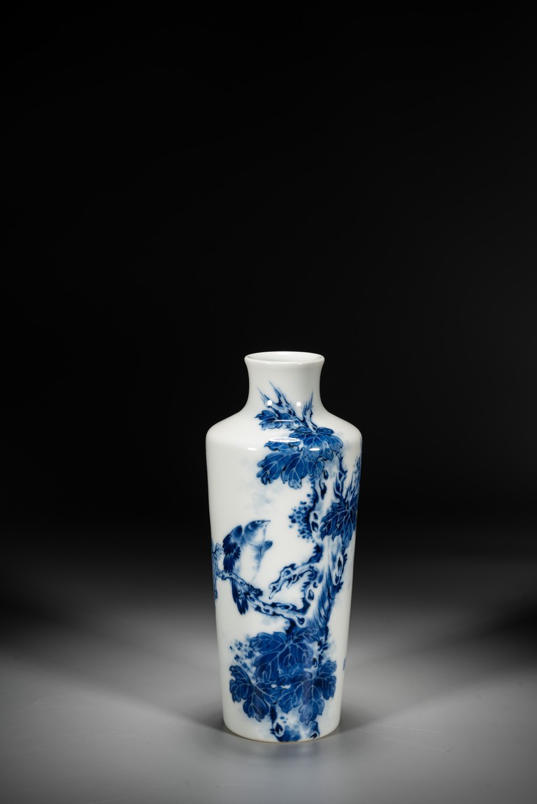 本品胎體潔白細潤,質地溫潤如凝脂,色調清新淡雅,使人領略到王步青花瓷繪的神韻所在。古木屈曲虯結,枝葉疏朗,益見古木之精氣渾厚,格調清雄。鳥居於枝幹之上,欲將翺翔,雙翅雄勁而動態輕盈,目光犀利有神,直視高處,雄視蒼天,嘴似利鉤,頸腹部絨毛細密而柔和,纖毫畢露,富具質感。雙翼用重墨依次按結構畫第二級飛羽和三級飛羽,以分明的筆觸表現出羽毛的片片結構,以青花濃淡的變化突出羽毛色澤與質感的不同,尤其飛羽之重筆,濃妍而深厚,迸發著精神的張力,表露出堅毅的意志,讓人感到無限震撼。其構圖穩健,形態精簡而意遠,墨韻濃、重、焦、淡相滲疊,線條中顯出用筆凝煉和沈健,寓意超脫世外之感,獨步天下。此件作品青花料色濃中有淡,實中隱虛,從構思、髮色、繪畫中無不體現王步特有的繪畫風格,堪稱其青花瓷繪之巔峰力作,顯示了王步獨特的藝術才華和超群的藝術功力。圖下落“王步”款識,底部落其齋名“願聞吾過之齋”款識。王步(1898-1968),字仁元,號竹溪,江西豐城縣人。從事陶瓷美術工作長達六十餘年,生平以釉下、釉上、堆雕、刻花等方法都創作過瓷器,尤精於青花。享有“青花大王”之稱。 。其瓷繪筆力雄健,以青花花鳥藝術見長,在青花渲染方面尤為獨創,將陶瓷繪畫與國畫藝術相融合,創造的“分水”技法,在點、線、面中的塊面感上一氣呵成,由淺至深或由疏緻密的質感層次表現分明,將青花的藝術表現推上了一個前所未有的高度,可謂獨步古今。其作品畫意渾厚、清新、簡潔、淳雅,運筆自如、流暢,達到了形神兼備的藝術境界,成為國內外博物館和收藏家的珍藏品。來源:內華達州亨德森私人藏家收藏 Provenance: Private collection, Henderson, Nevada