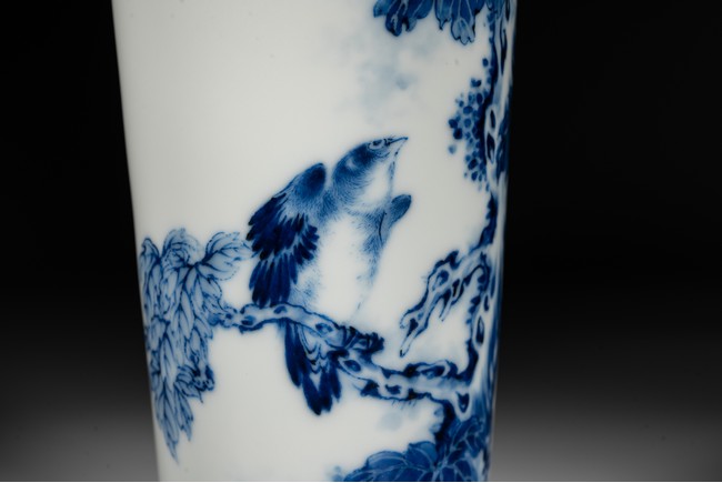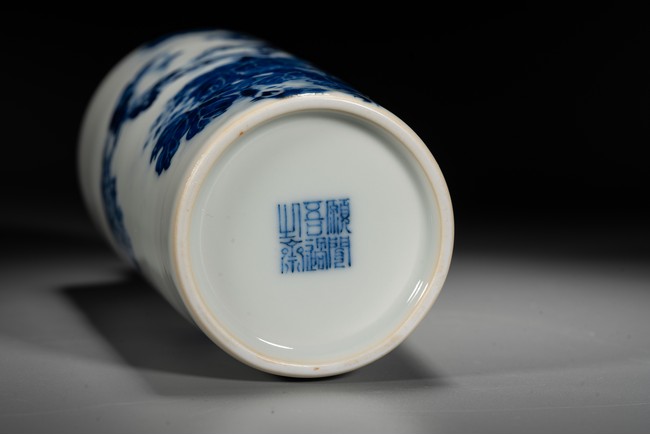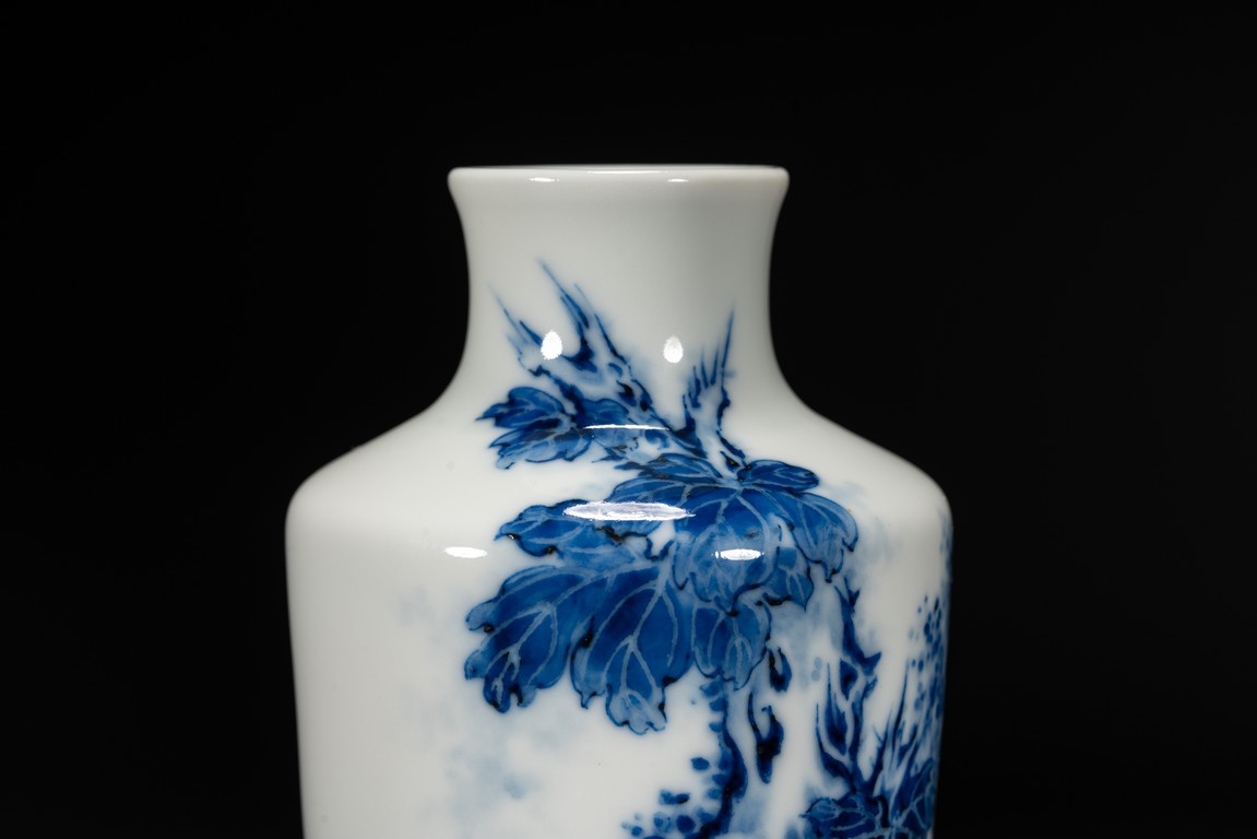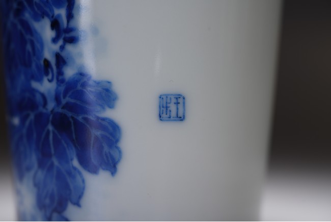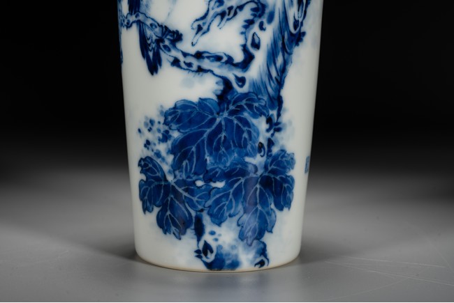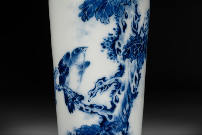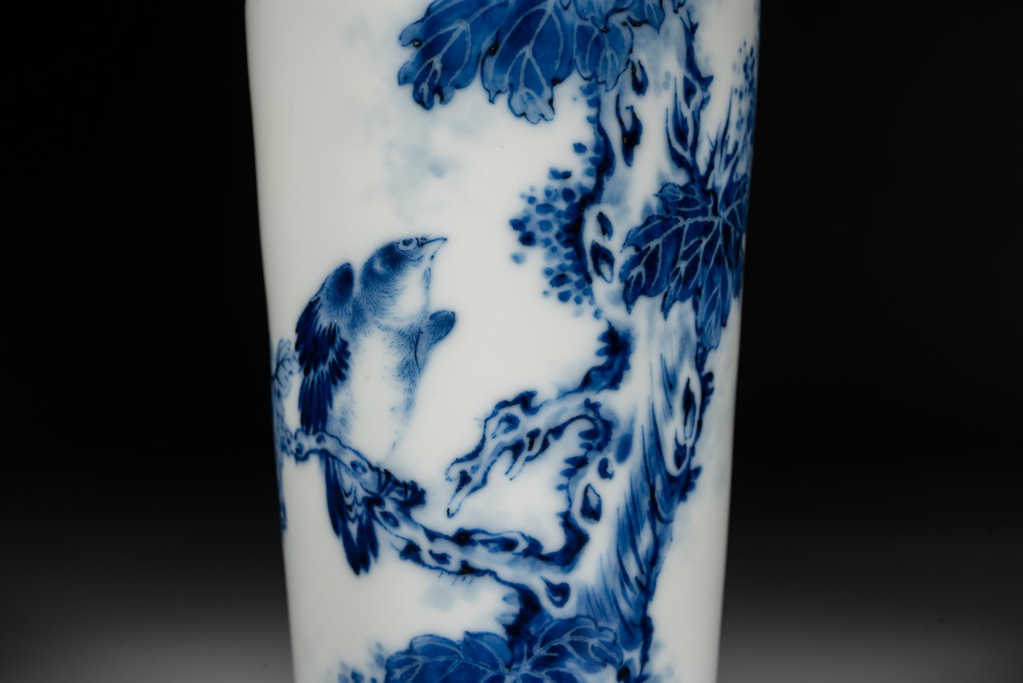 Republic period. Of cylindrical form, the body decorated with birds perching on tree branch, with 'wang bu' seal mark, the base inscribed with six character mark.