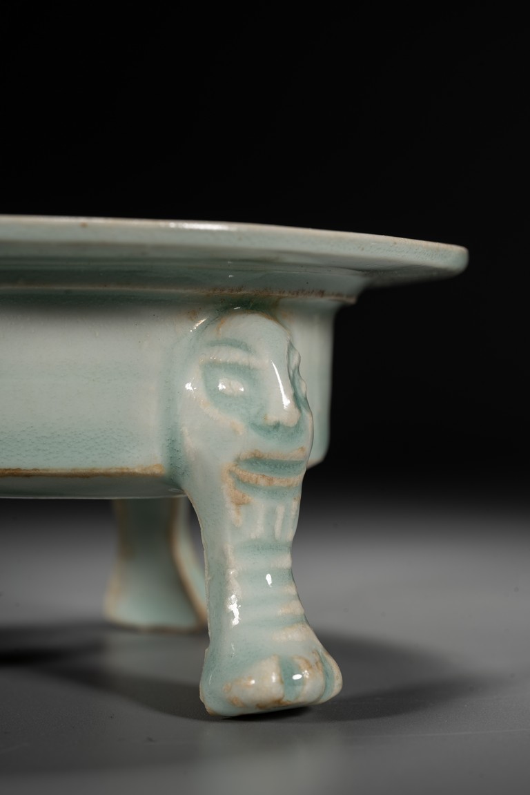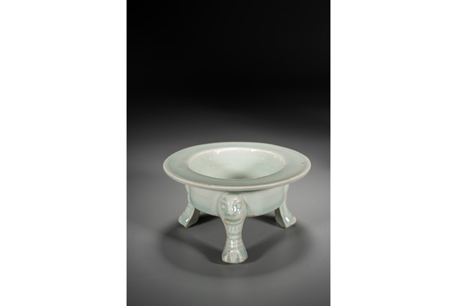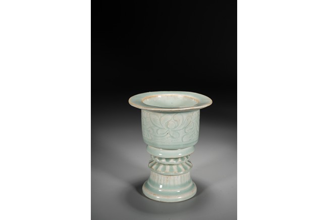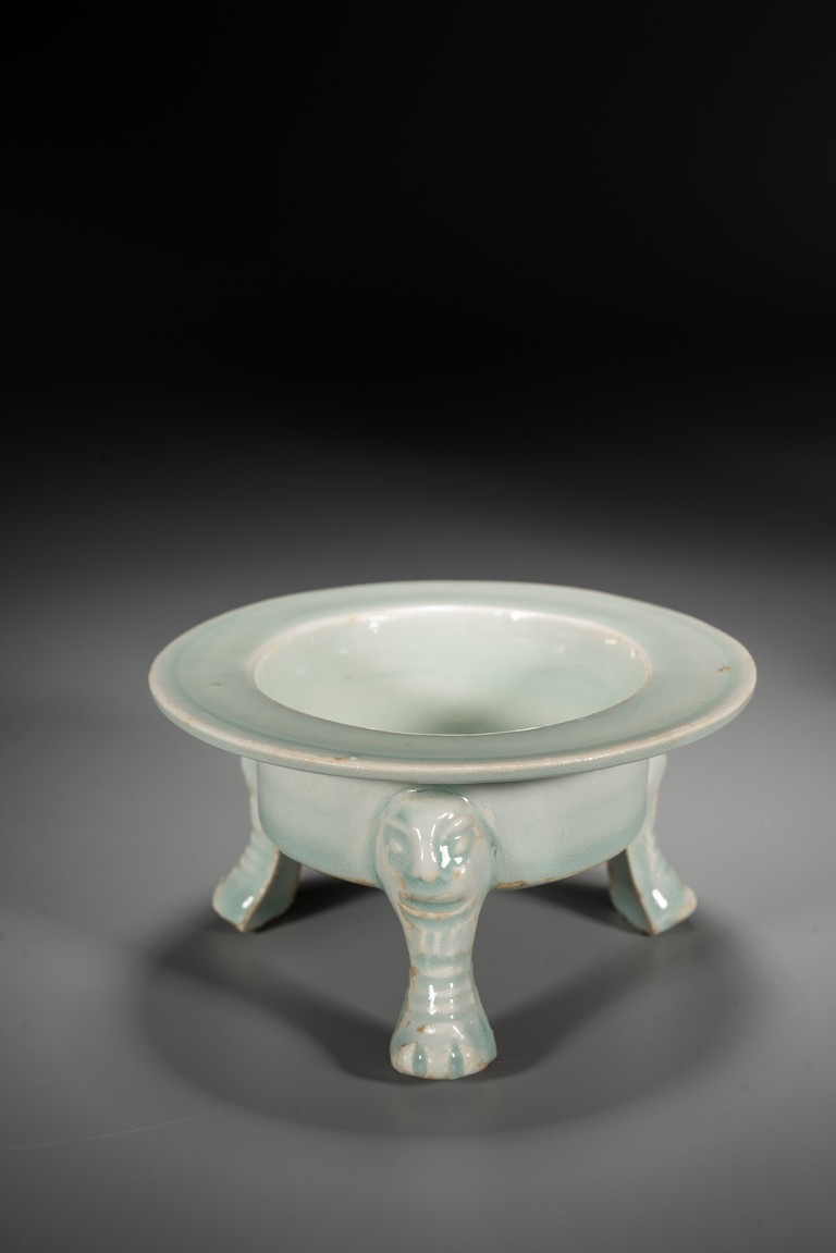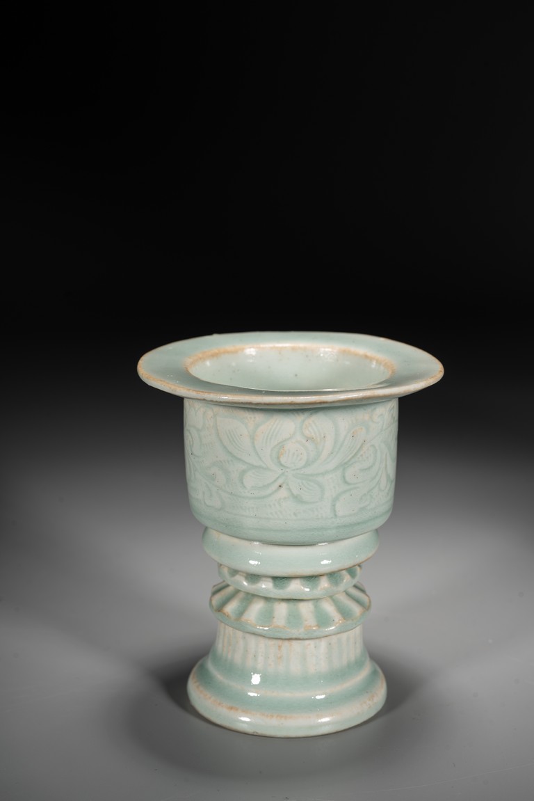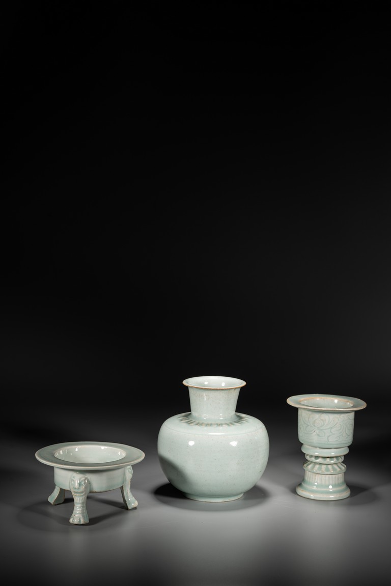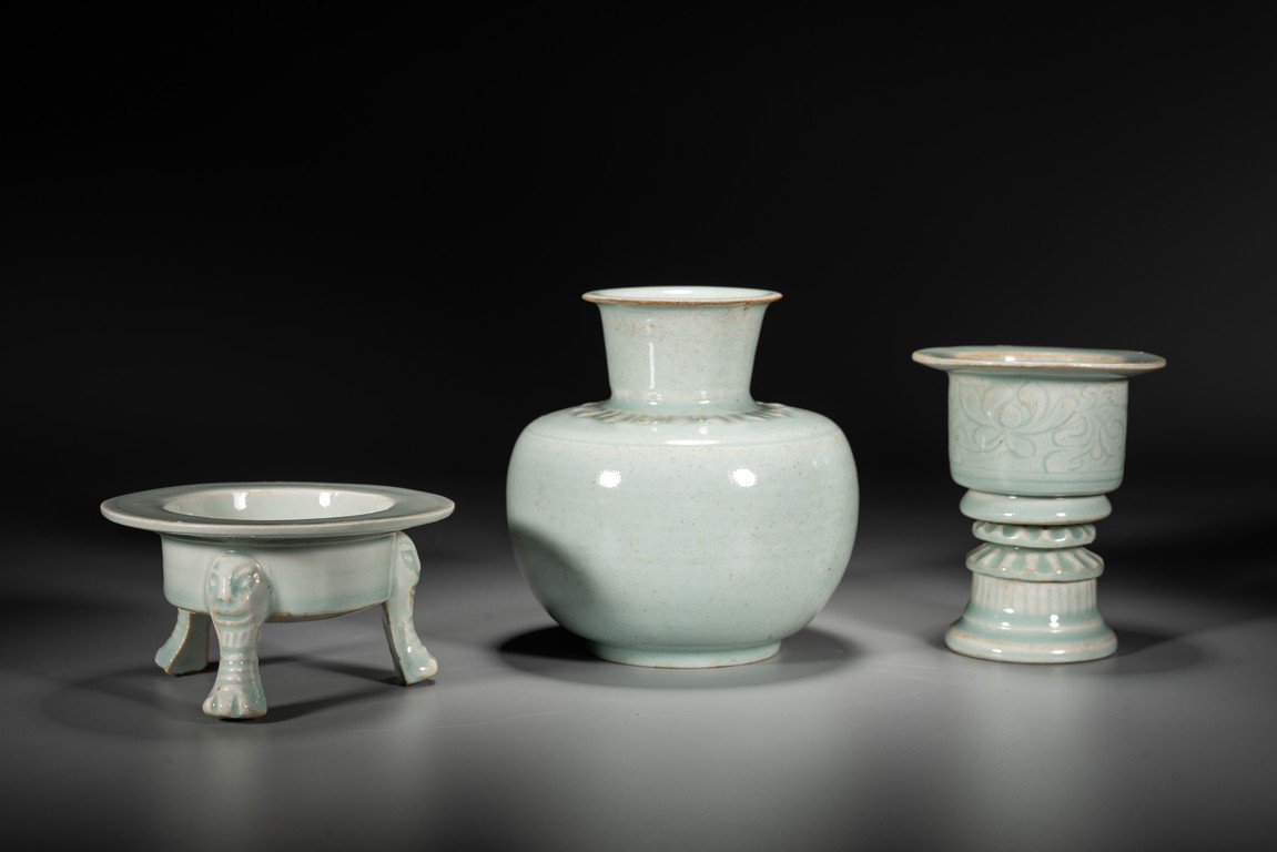 Comprising of three celadon glazed vessels, including a tripod censer, a globular vase, and a stem cup.