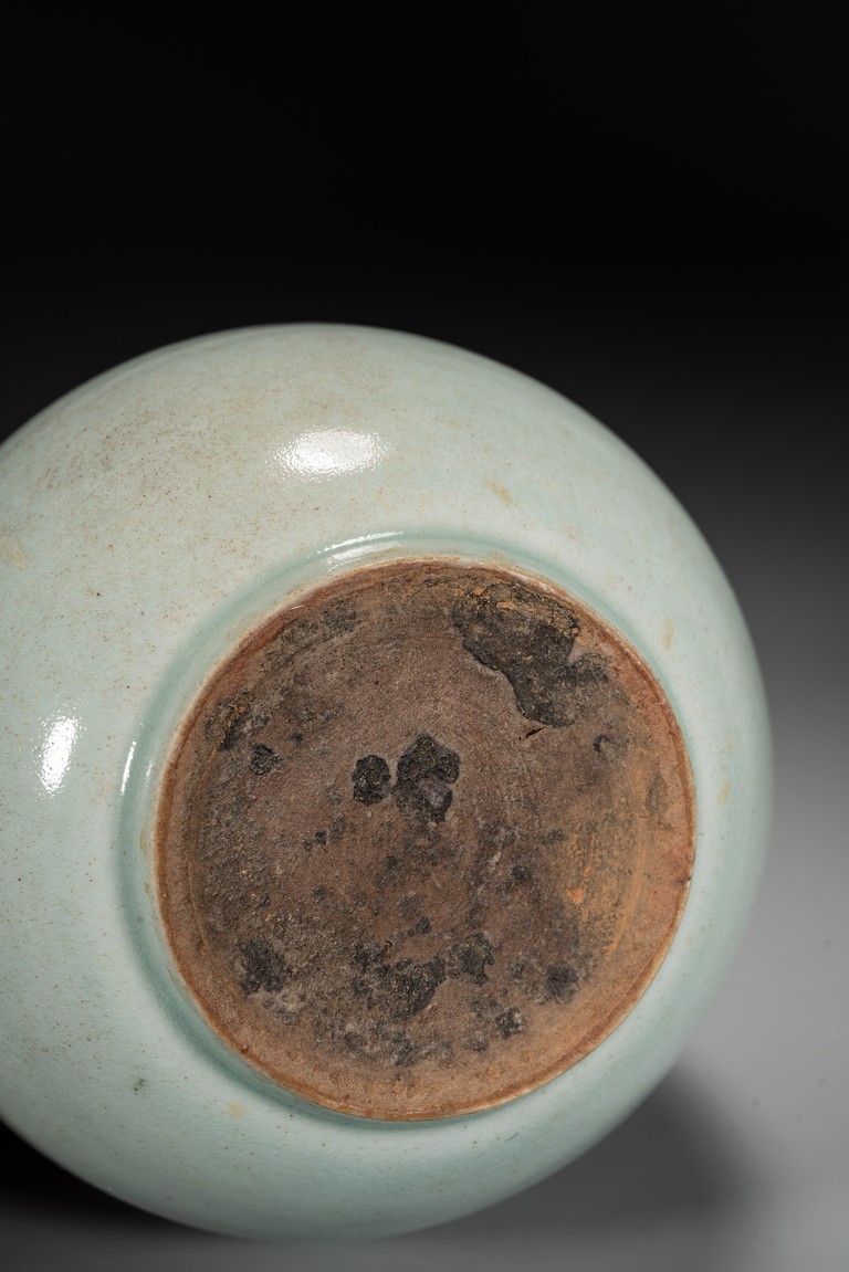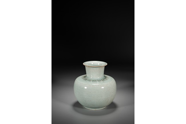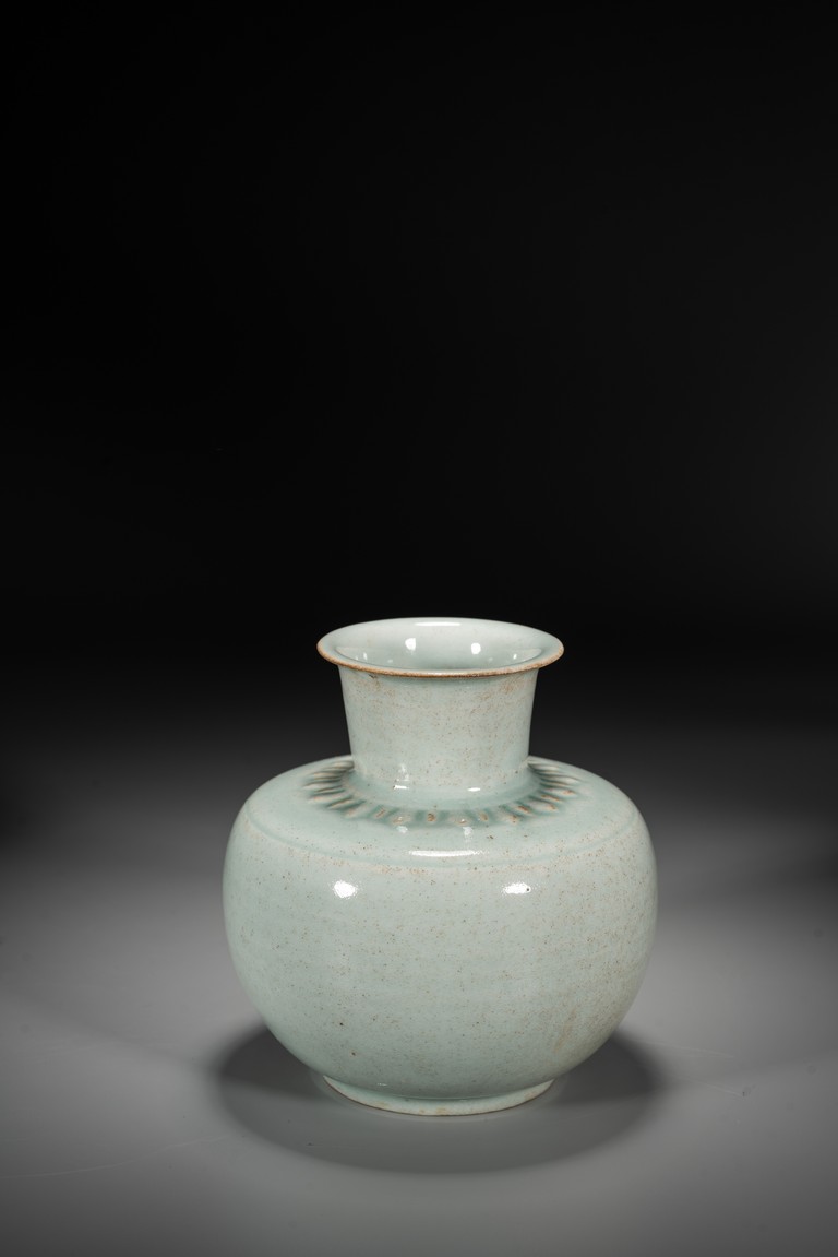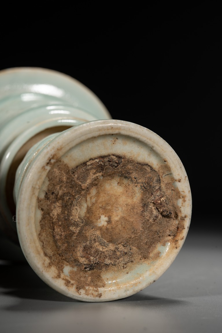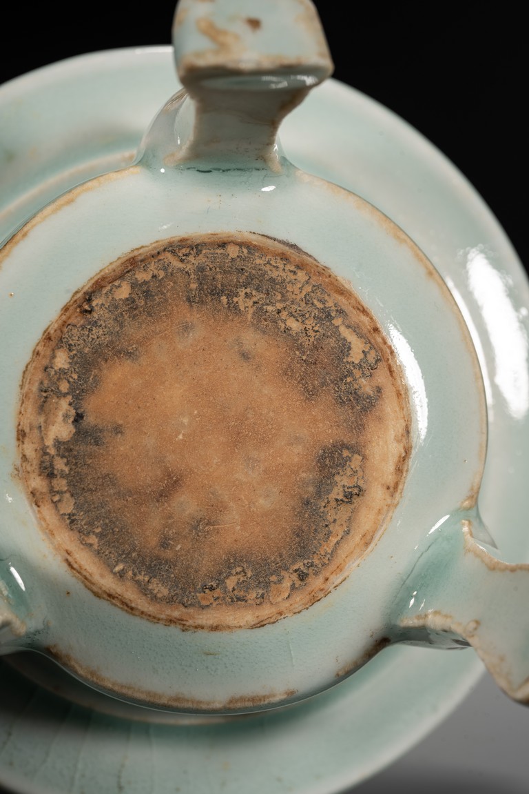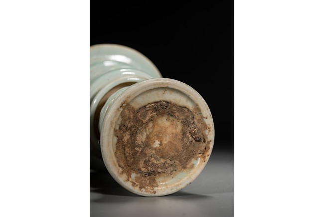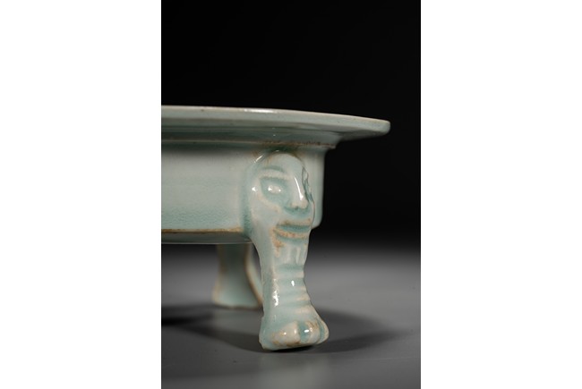 Comprising of three celadon glazed vessels, including a tripod censer, a globular vase, and a stem cup.