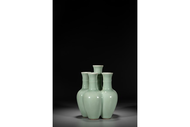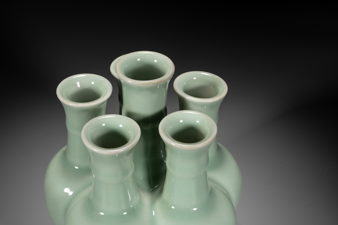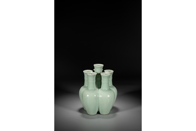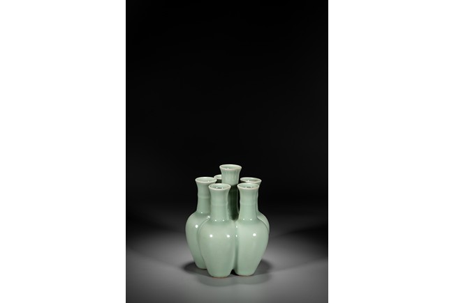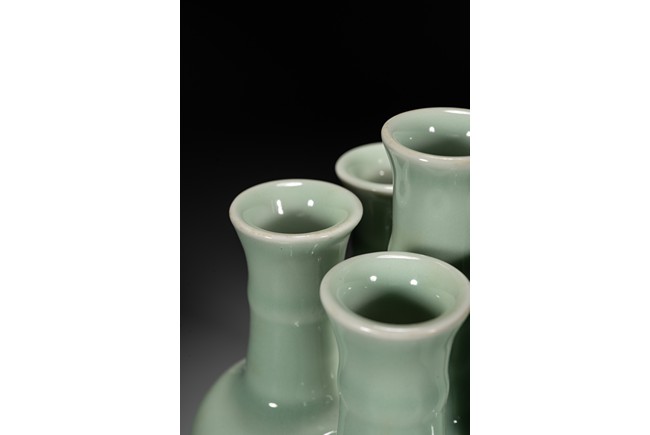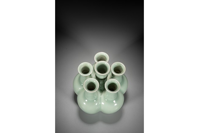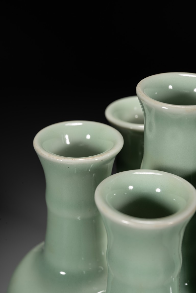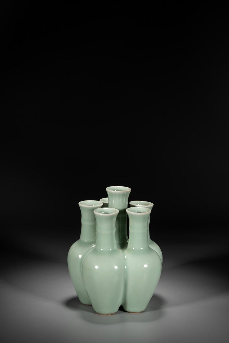 Potted as six conjoined amphora-shaped vases, each with an ovoid body gently rising to a high rounded shoulder and a tall cylindrical neck encircled with a filet and surmounted by a wide flaring rim, covered overall with a vitreous pale-celadon glaze save for the footrims, the base of the central vase with a six-character seal mark in underglaze blue. To compare vases with similar style, please refer to a Qianlong period blue and white six-joined vase in Shenyang Museum of Art