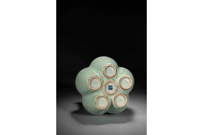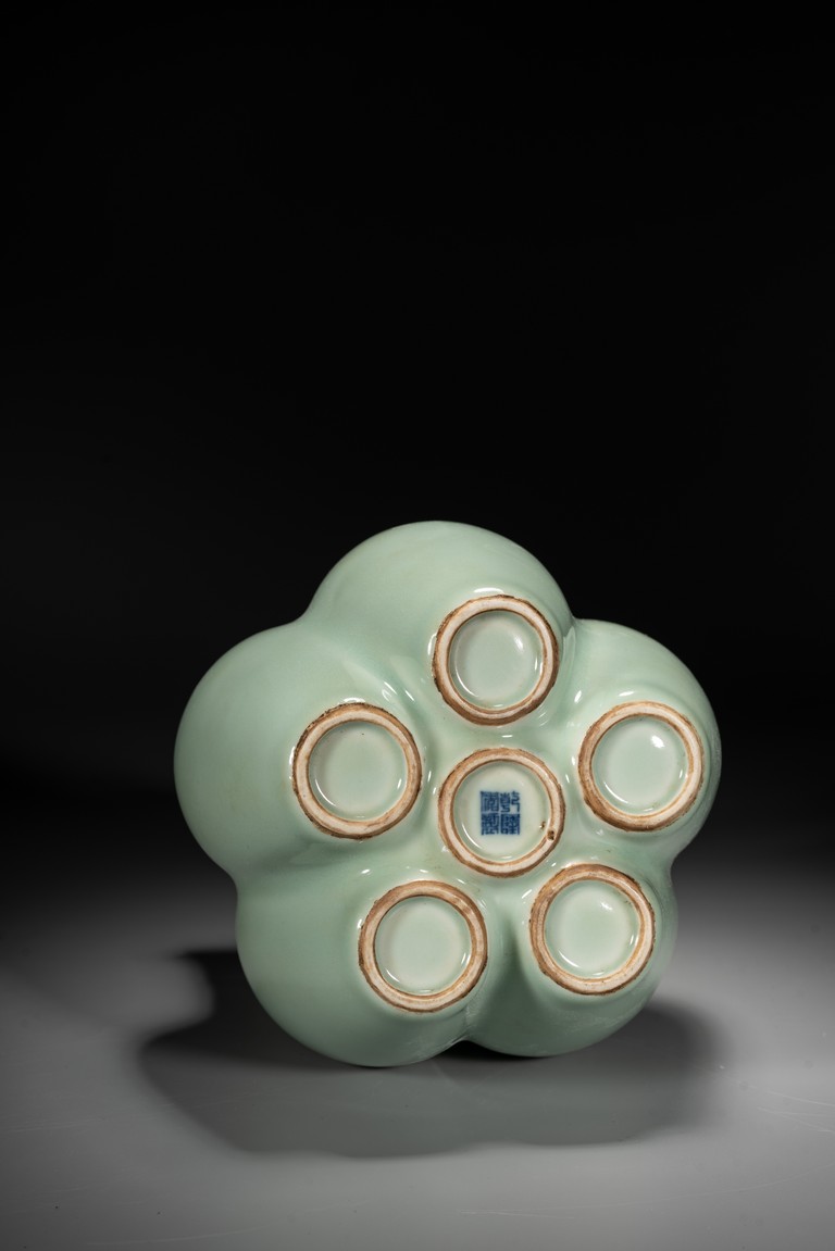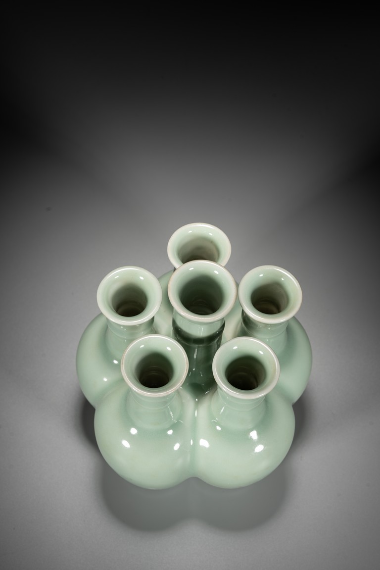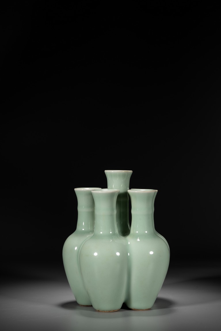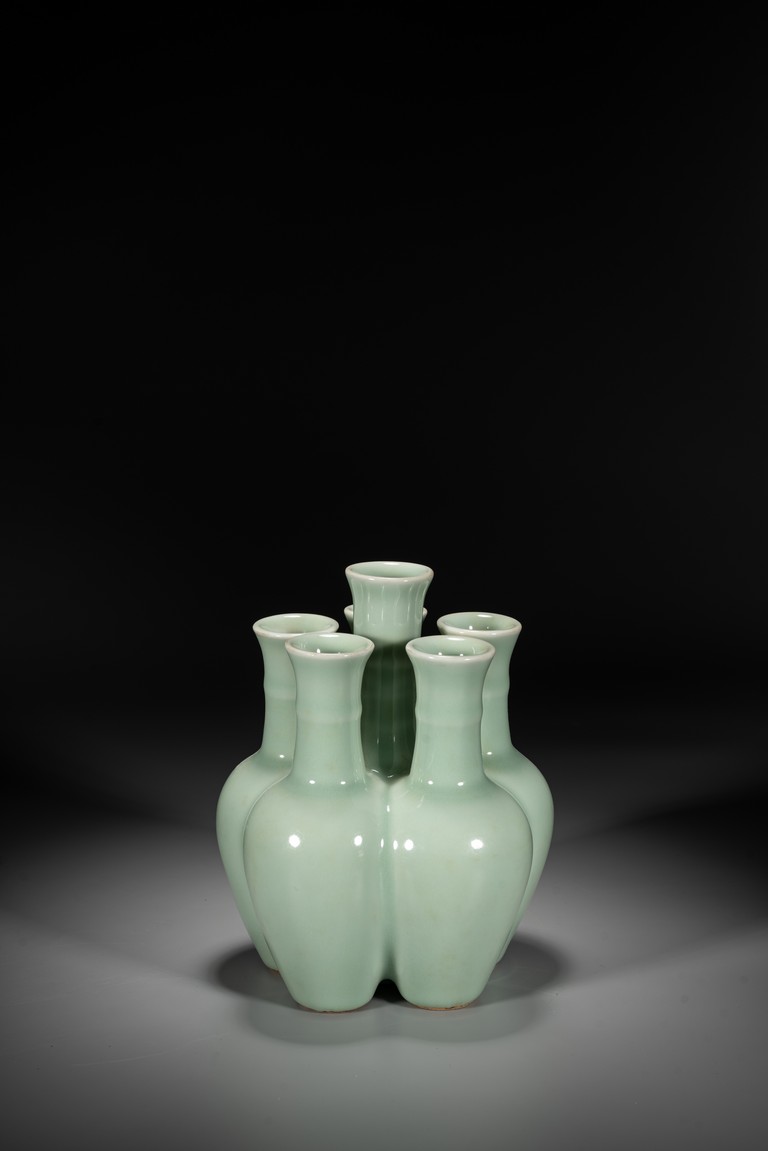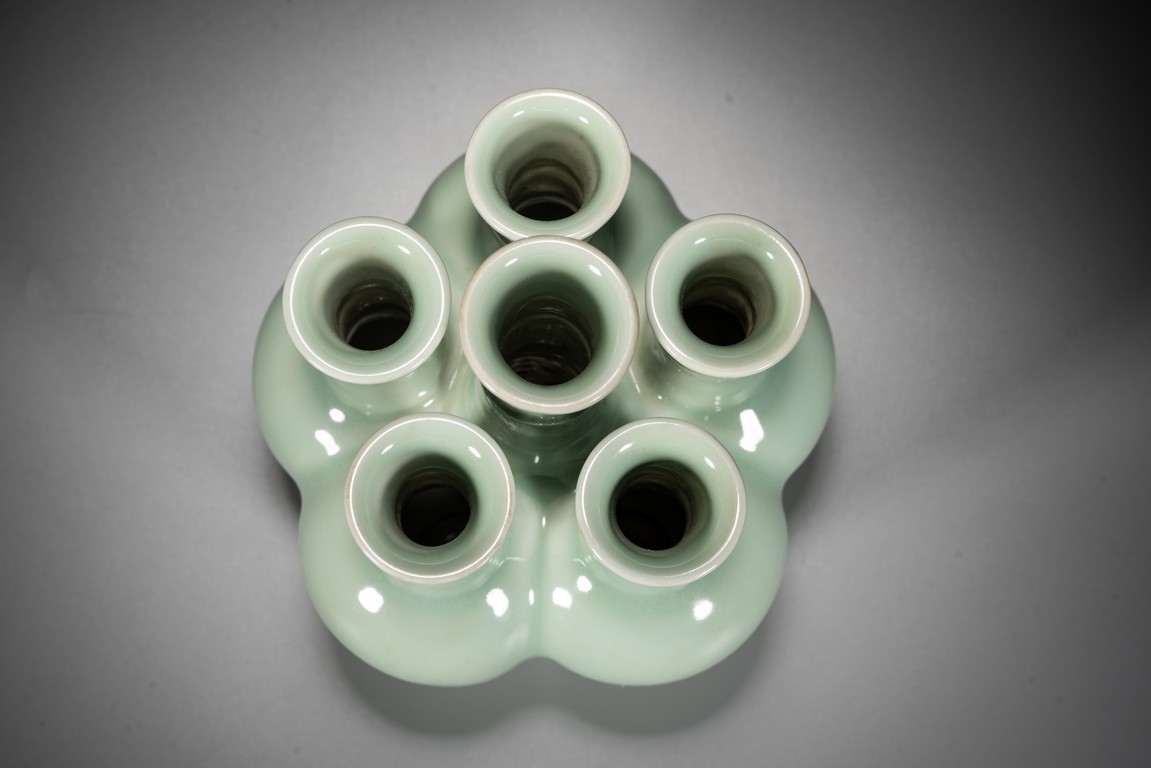 六孔花插,清宮資料中另可見數處記載,諸如:“乾隆五十四年五月初一日,收董誥官釉六孔花插一件”。《清檔》載:“乾隆三年五月初六日,司庫劉山久催總白世秀來說太監高玉交……廠官釉六孔瓶一件、月白釉六孔瓶一件……傳旨著將……交與唐英照此釉水燒造另改花樣……其余八樣(六孔瓶在內)照樣燒造……欽此。”本品造型獨特,由六瓶緊密相連而成,每支小瓶均敞口,長頸部各有凸起弦紋一道,圓肩,弧腹下垂,圈足。整器俯視宛如梅花盛開狀,中間瓶高聳如花蕊,周圍五瓶類梅瓣相擁。通體滿施“豆青釉”,釉面均勻凝潤,色澤淡雅清麗,凸顯秀麗端莊之氣韻。“乾隆年制”款識。類似器型可參考瀋陽省博物館藏清乾隆青花纏枝蓮紋六連瓶。來源:內華達州亨德森私人藏家收藏 Provenance: Private collection, Henderson, Nevada