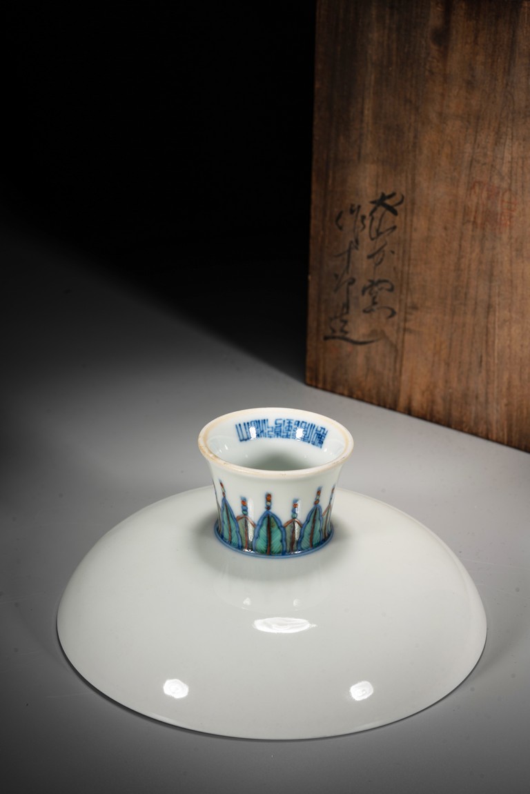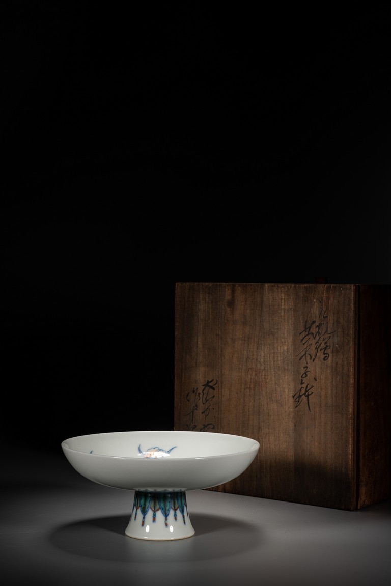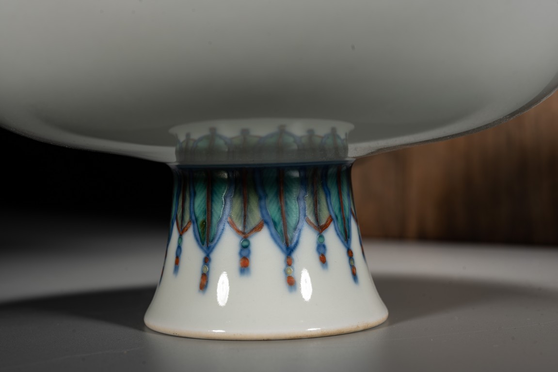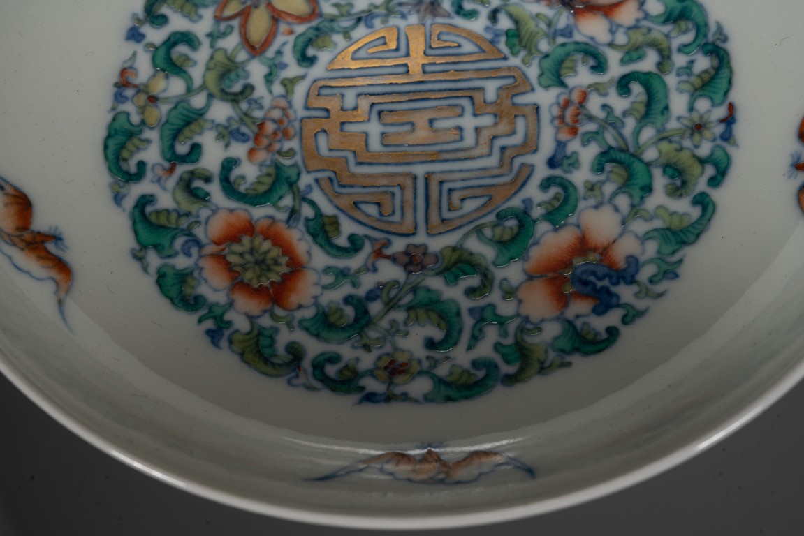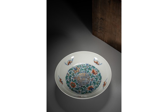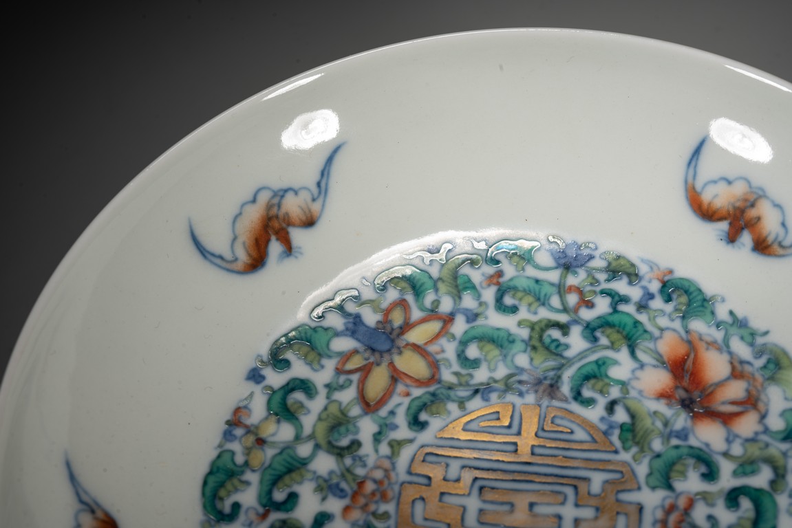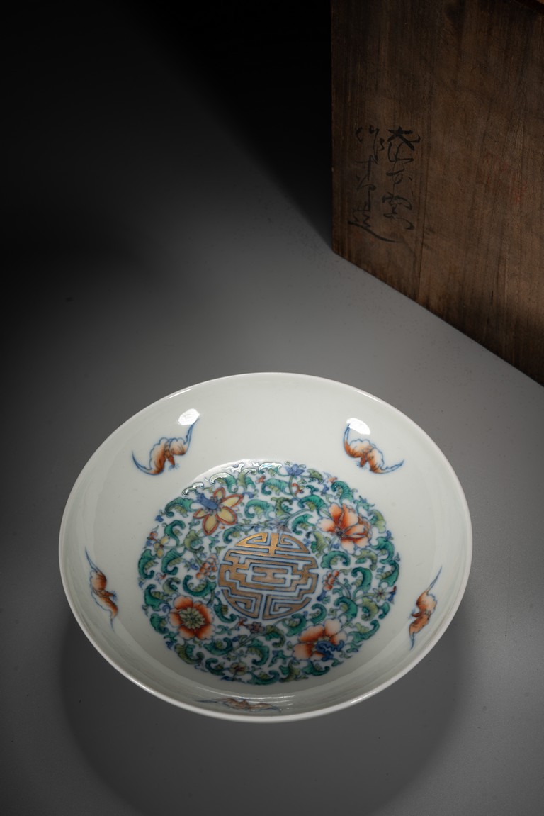 敞口,淺腹,高足外撇。胎體較薄,白晰潤澤,釉面致密,色彩鮮明。盤內壁口沿處飾“五蝠紋”,盤心繪“纏枝花卉紋”“壽字紋”。釉上填黃、紅、綠、金彩,釉下部分青花勾勒線條,釉面上下,相互映襯,脫俗雅致,所填諸彩,紅彩濃妍,綠彩明艷,黃彩璀璨,青花勻亮,金彩富麗。“五蝠”即“五福”,寓意“五福獻壽”,“大清乾隆年制”款識。