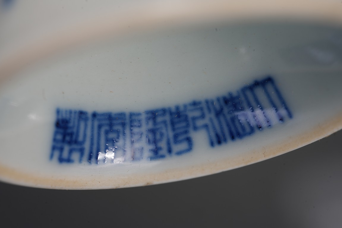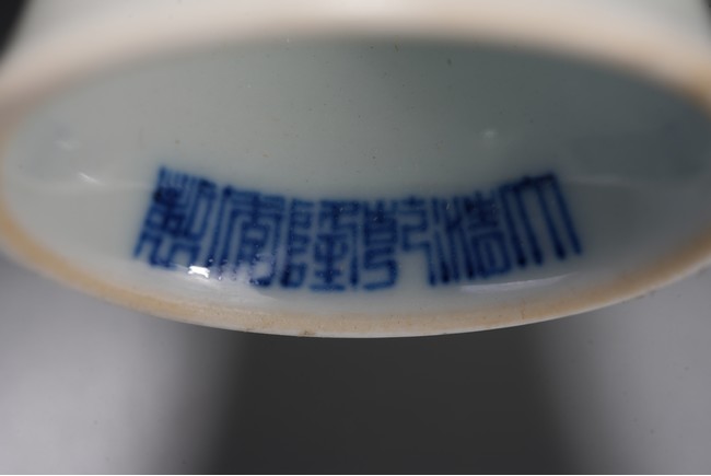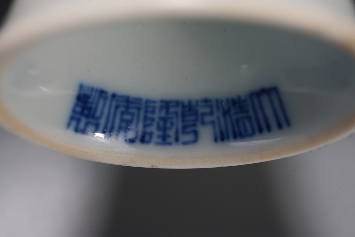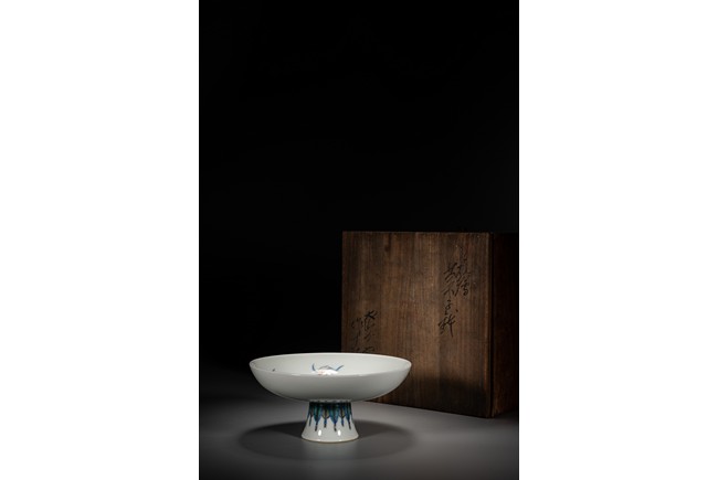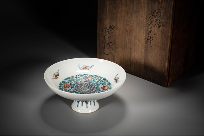 Rising from a spreading foot, the interior of the dish enamelled with shou medallion surrounded by flowers and bats, the base inscribed with reign mark.