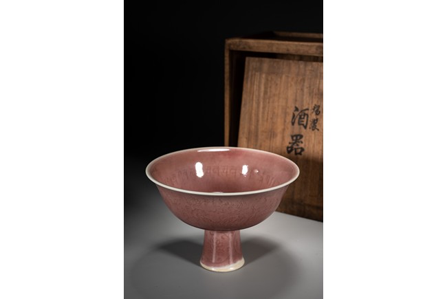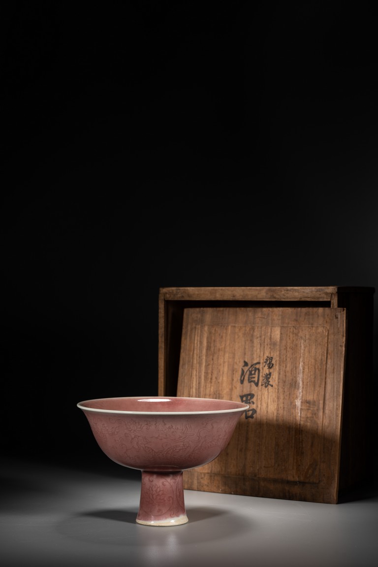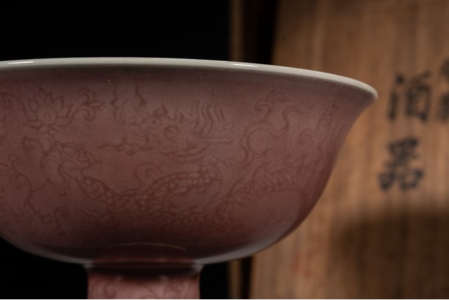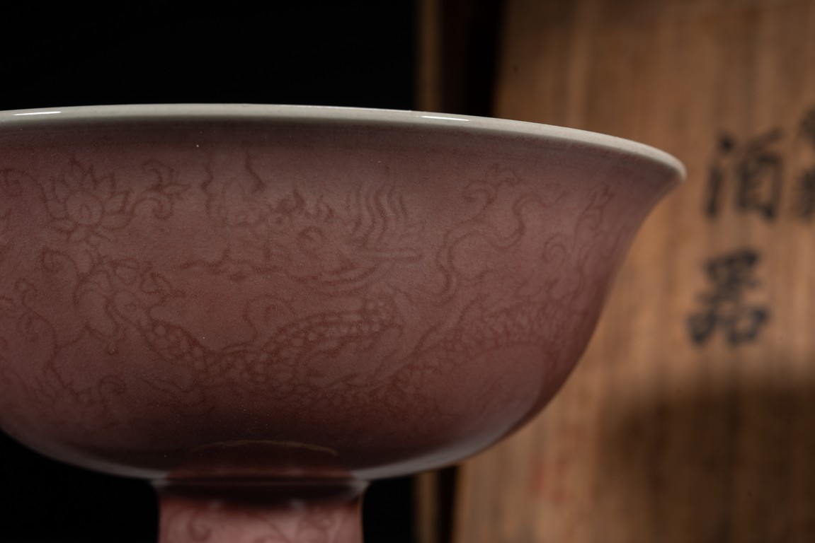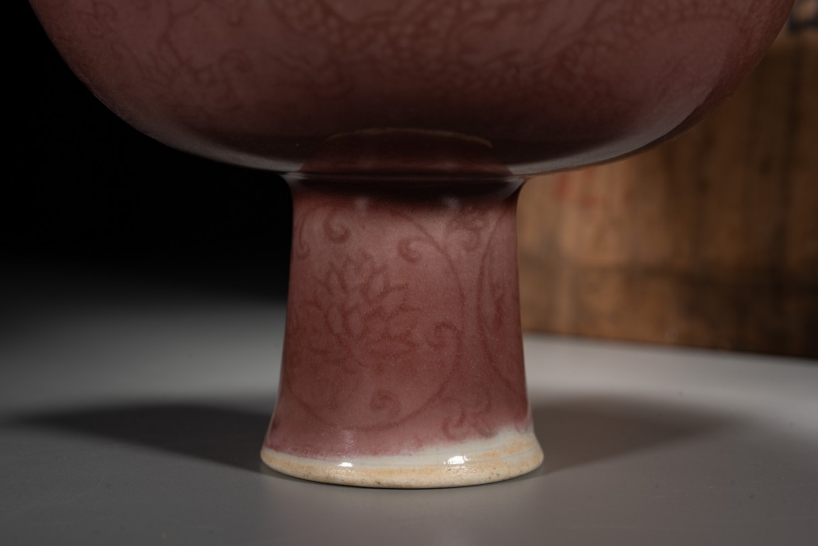 The stem cup suffused with peachbloom red glaze incised with dragon decorations, base with reign mark.