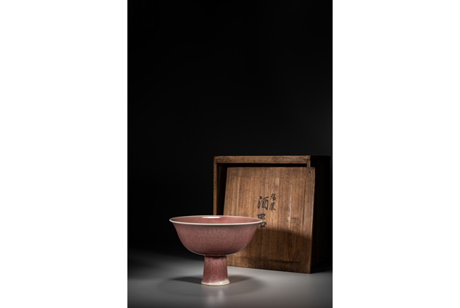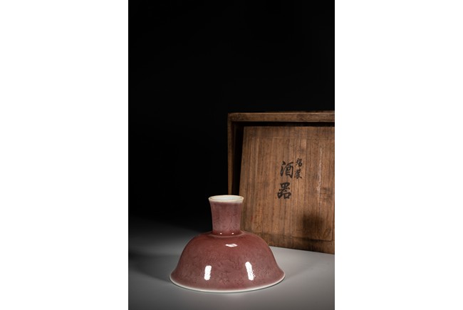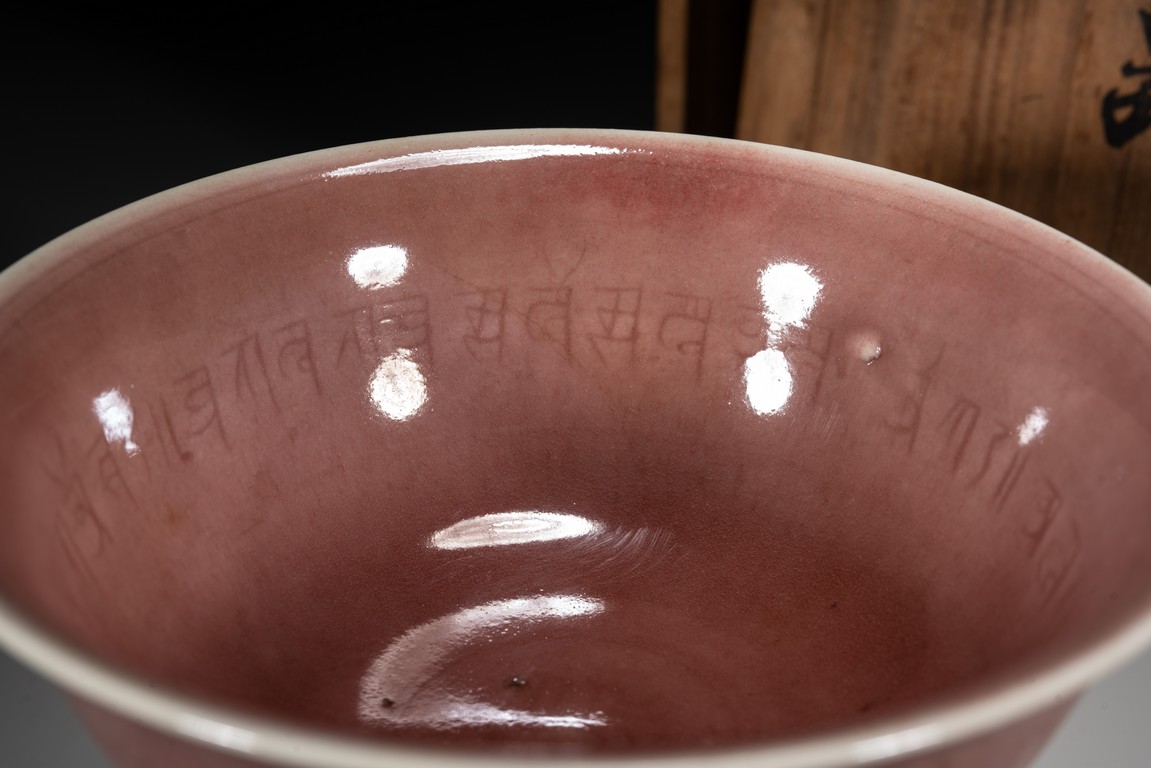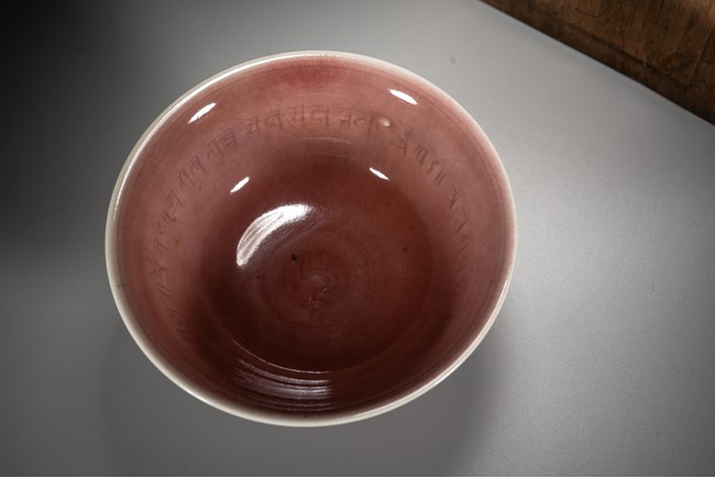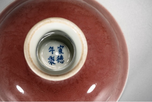 敞口,淺弧腹,高足。通體施淡紅釉,口沿因高溫熔融使銅紅釉向下流動而露出白色的胎骨,俗稱「燈草邊」。釉色鮮潤,釉面瑩亮光潤,燒造品質極為上乘,釉層較厚,釉質肥厚,釉內氣泡較多,釉面光潔瑩潤。外壁繪“穿花龍紋”,龍卷曲盤旋在花叢中,龍首昂起,嘴、眼、角逼真生動,齒外露,張牙舞爪,藏於花叢中。花為“纏枝蓮紋”,隨舞龍彎轉起伏,恰到好處。碗心繪“梵文”。足圈內書“宣德年制”款識。