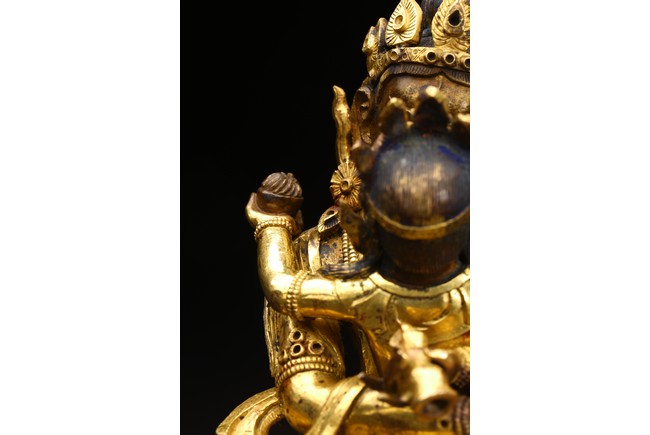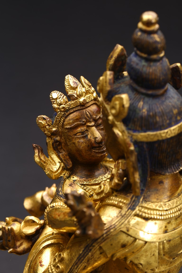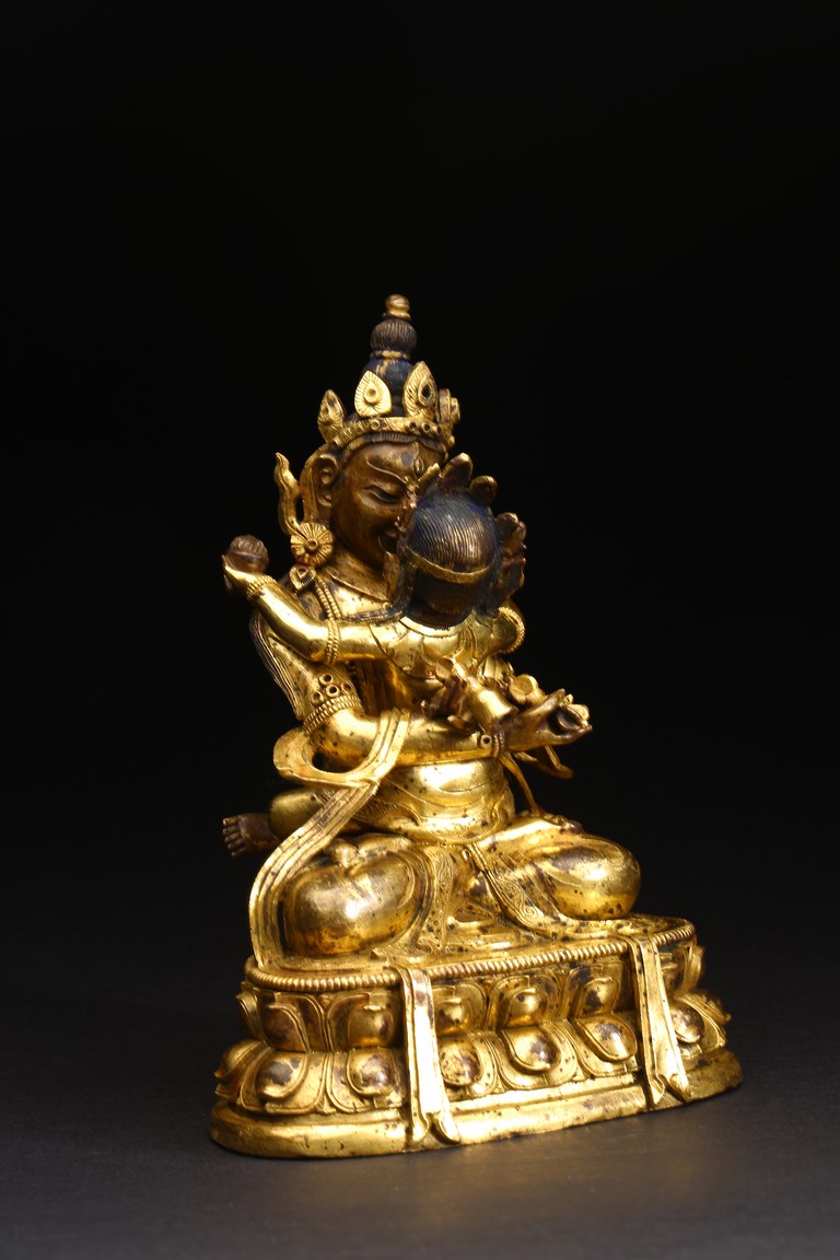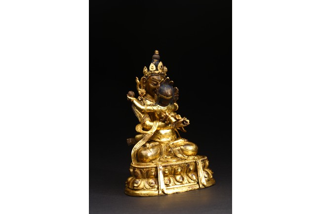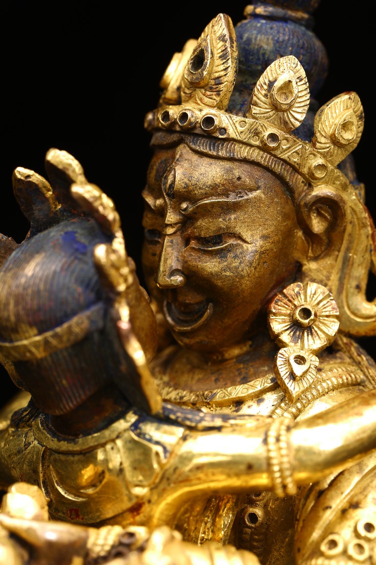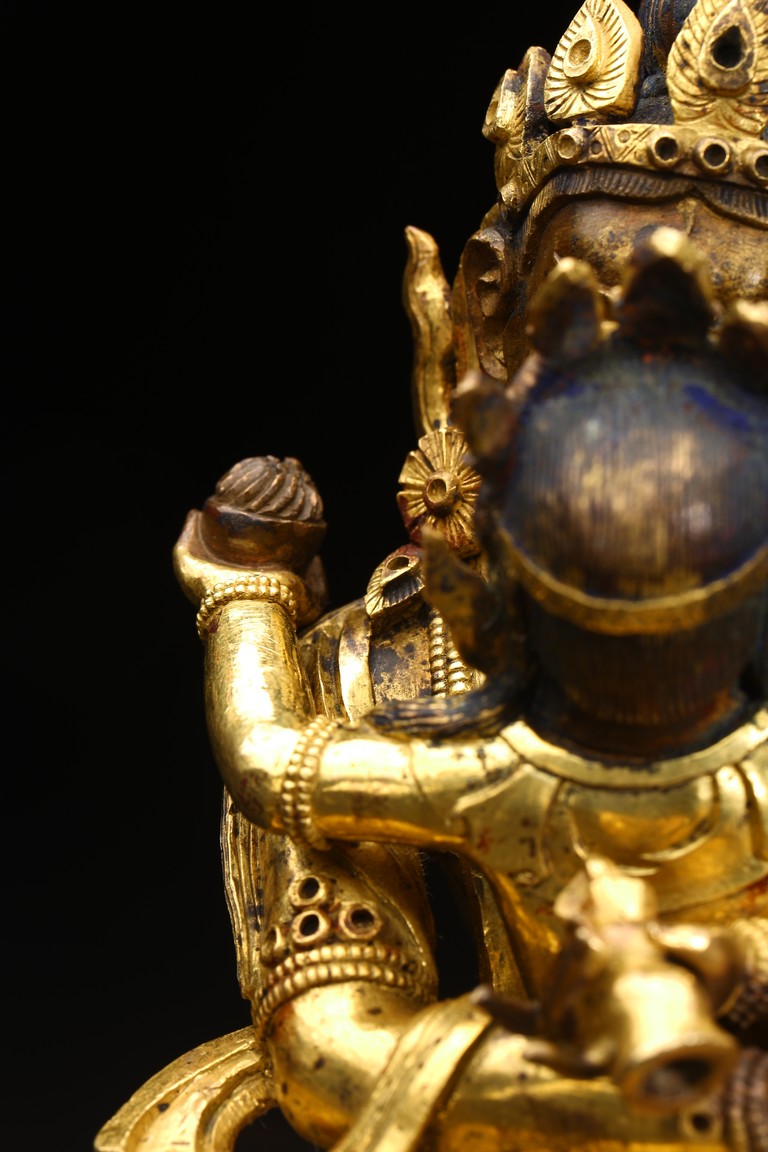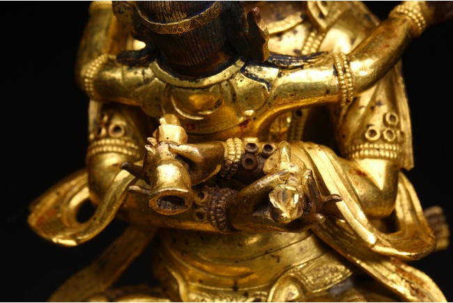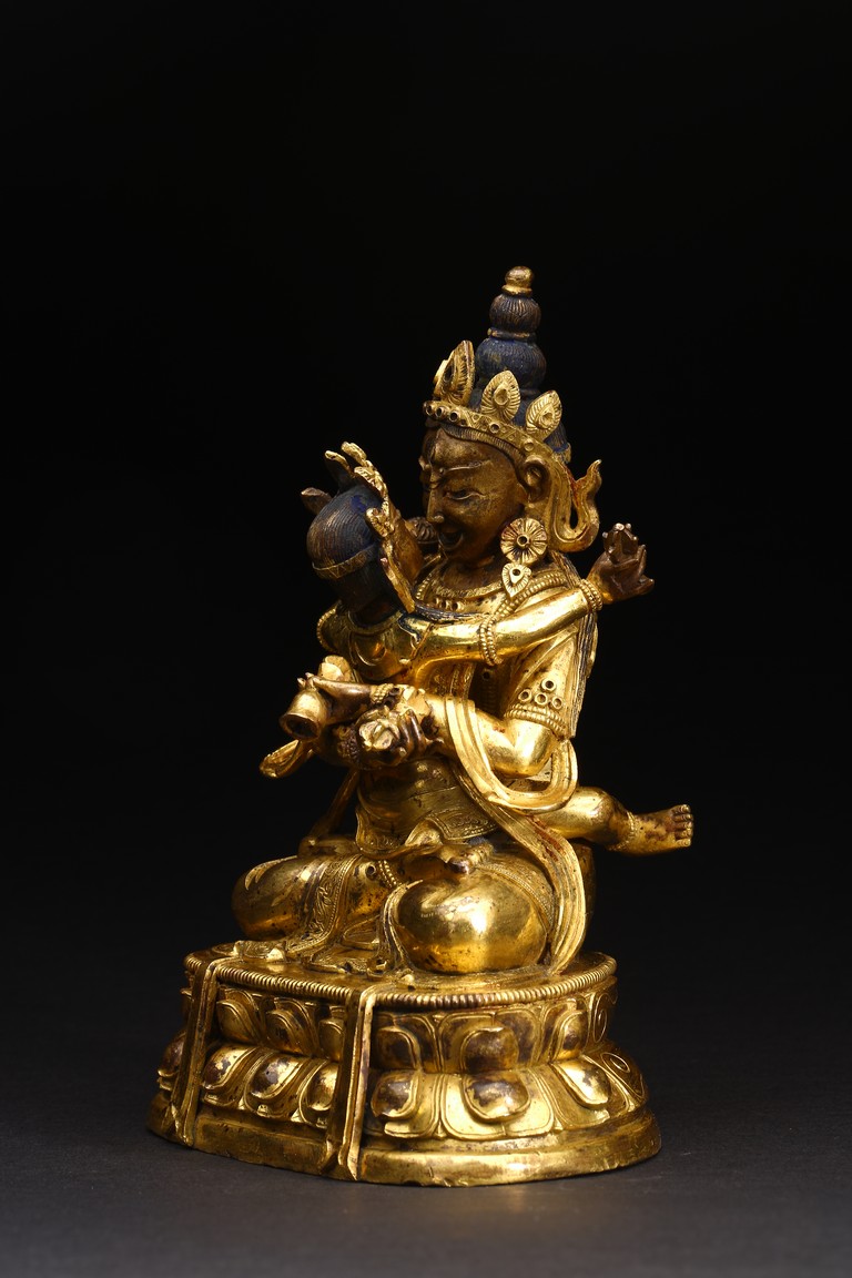 金剛持,也稱“大持金剛”、“秘密主”。頭戴五葉寶冠,冠葉雕刻精巧。面相端莊圓潤,神態慈祥柔和。主尊雙手環抱明妃,左手持“金剛杵”,右手持“金剛鈴”,結全跏趺坐於蓮座上。明妃亦頭戴五葉冠,左右臂於主尊頸後,托舉顱缽,雙足環扣主尊腰部。蓮座周正厚重,上下緣各飾一條連珠紋,蓮瓣寬大扁平。