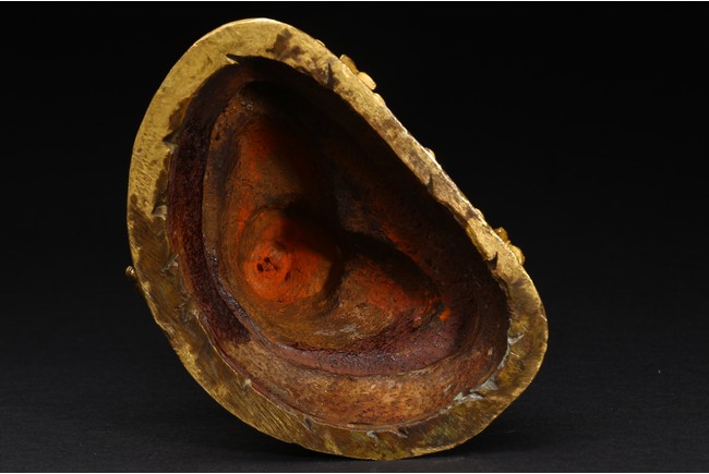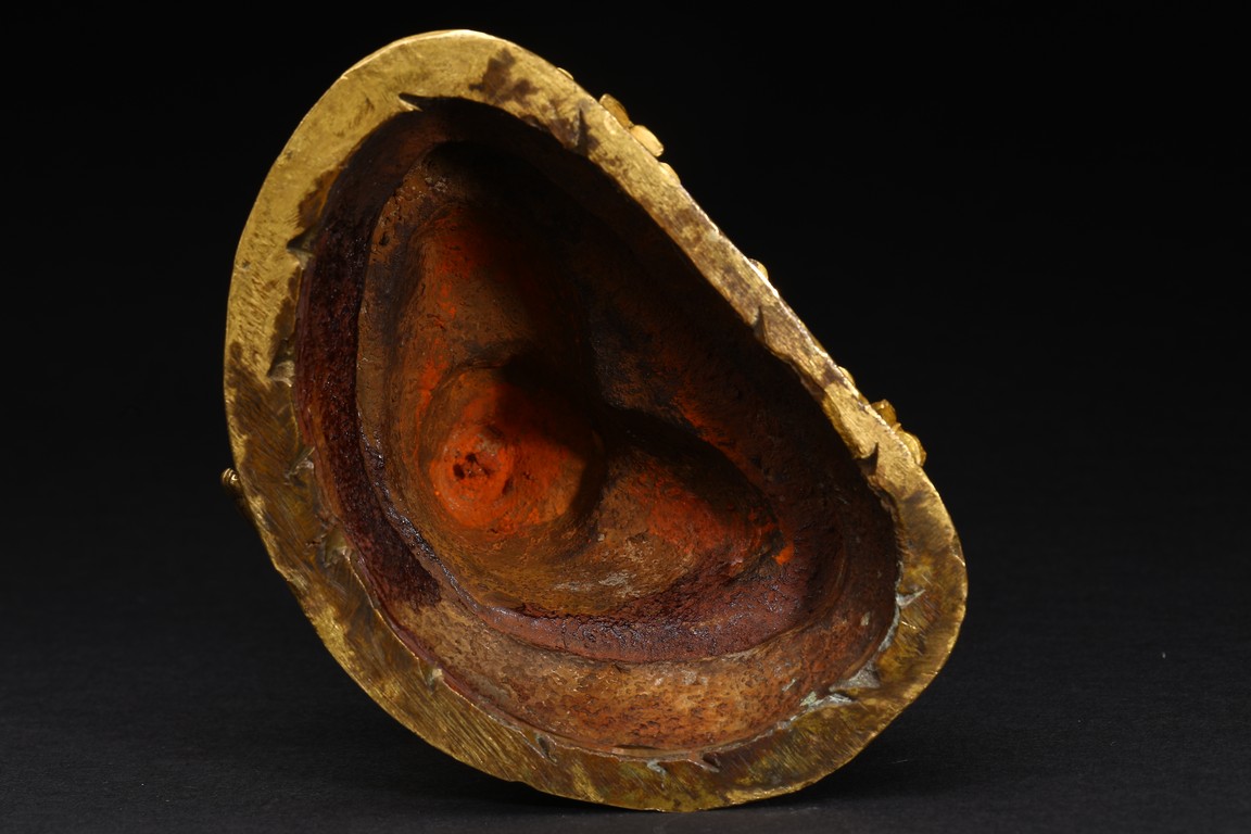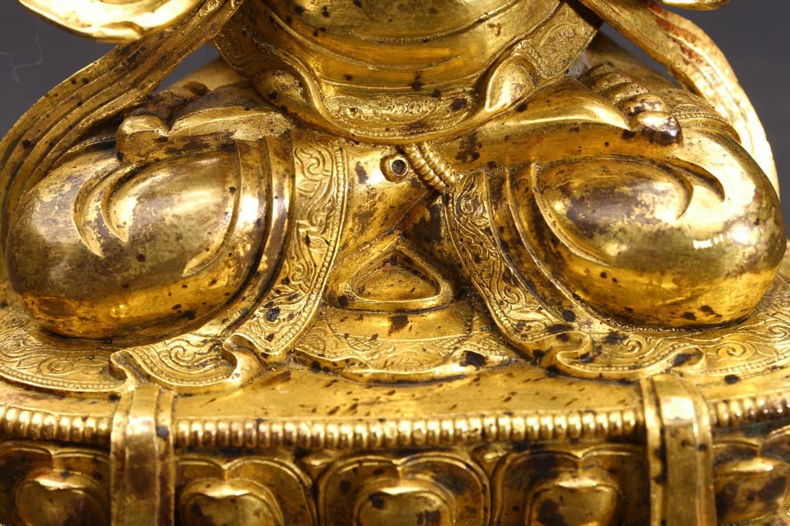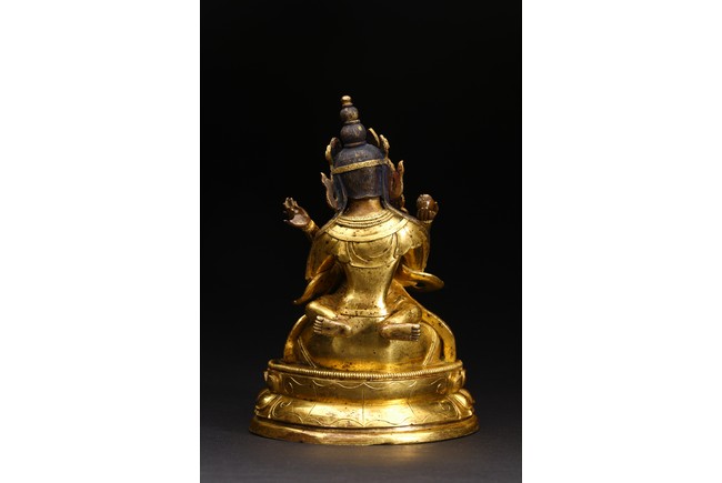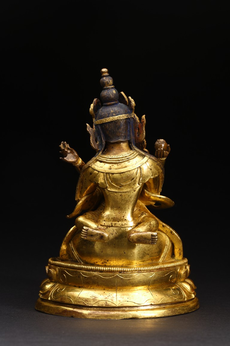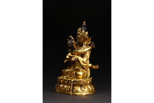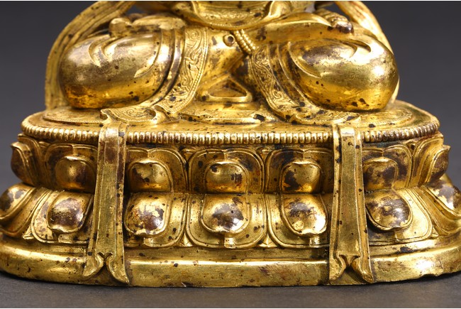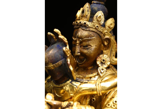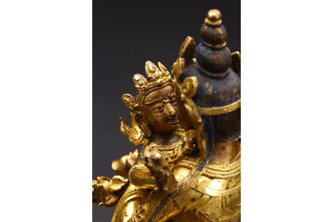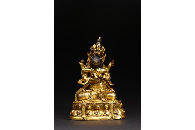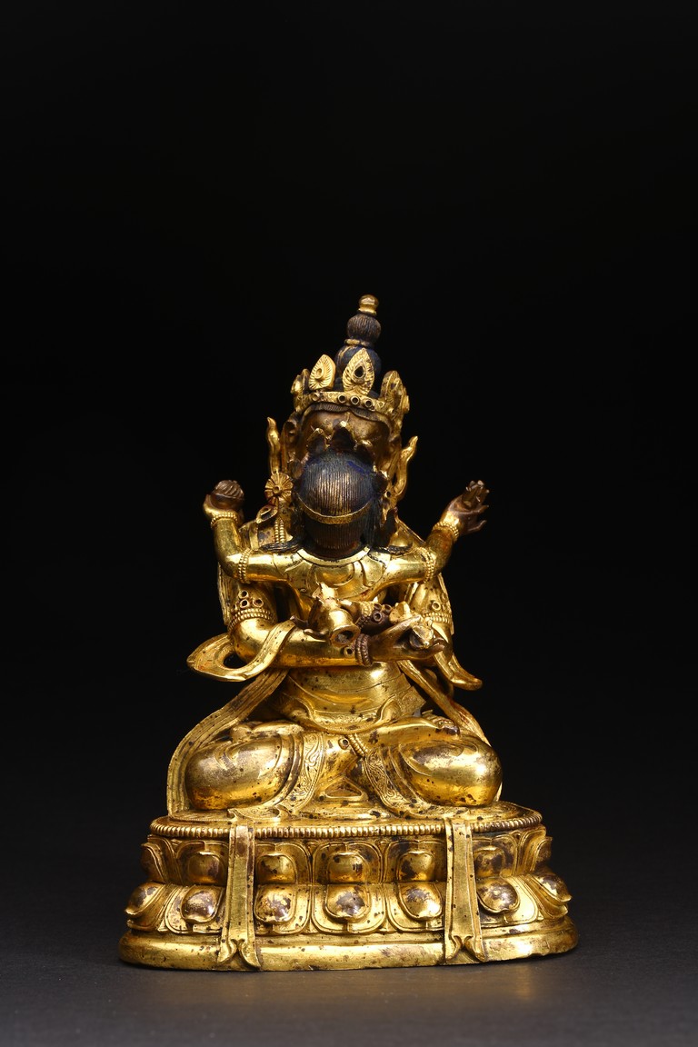 金剛持,也稱“大持金剛”、“秘密主”。頭戴五葉寶冠,冠葉雕刻精巧。面相端莊圓潤,神態慈祥柔和。主尊雙手環抱明妃,左手持“金剛杵”,右手持“金剛鈴”,結全跏趺坐於蓮座上。明妃亦頭戴五葉冠,左右臂於主尊頸後,托舉顱缽,雙足環扣主尊腰部。蓮座周正厚重,上下緣各飾一條連珠紋,蓮瓣寬大扁平。