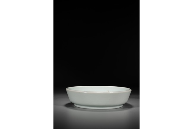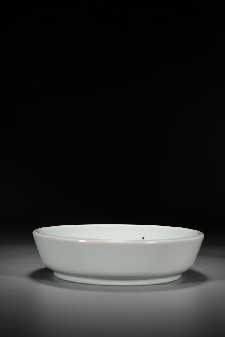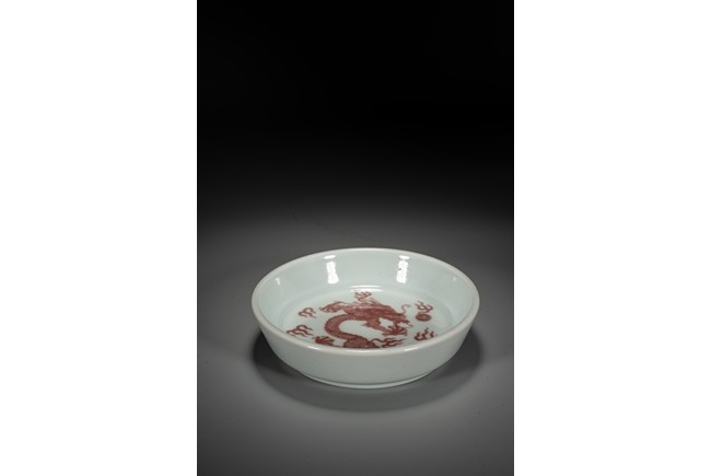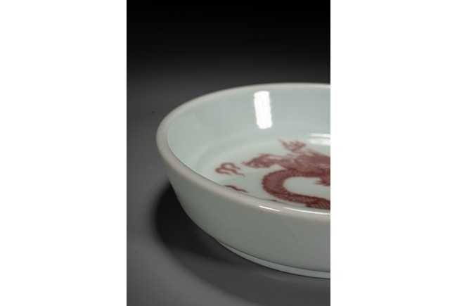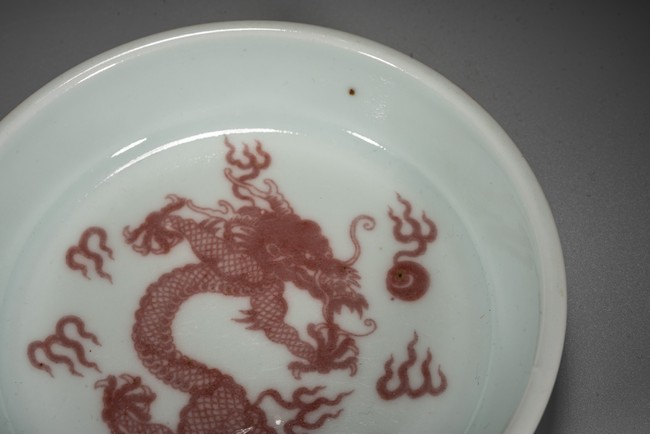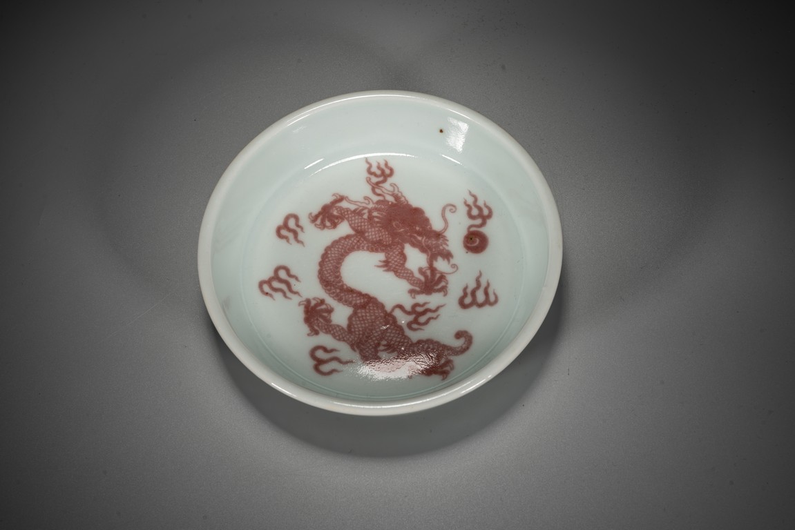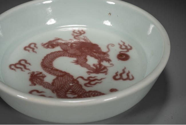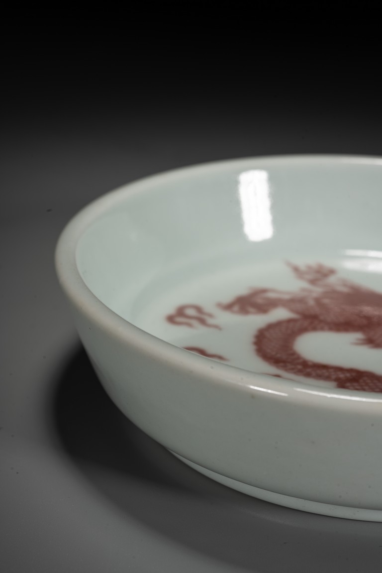The washer interior finely enamelled in underglaze red with a dragon chasing flaming pearl, the base inscribed with six character mark.