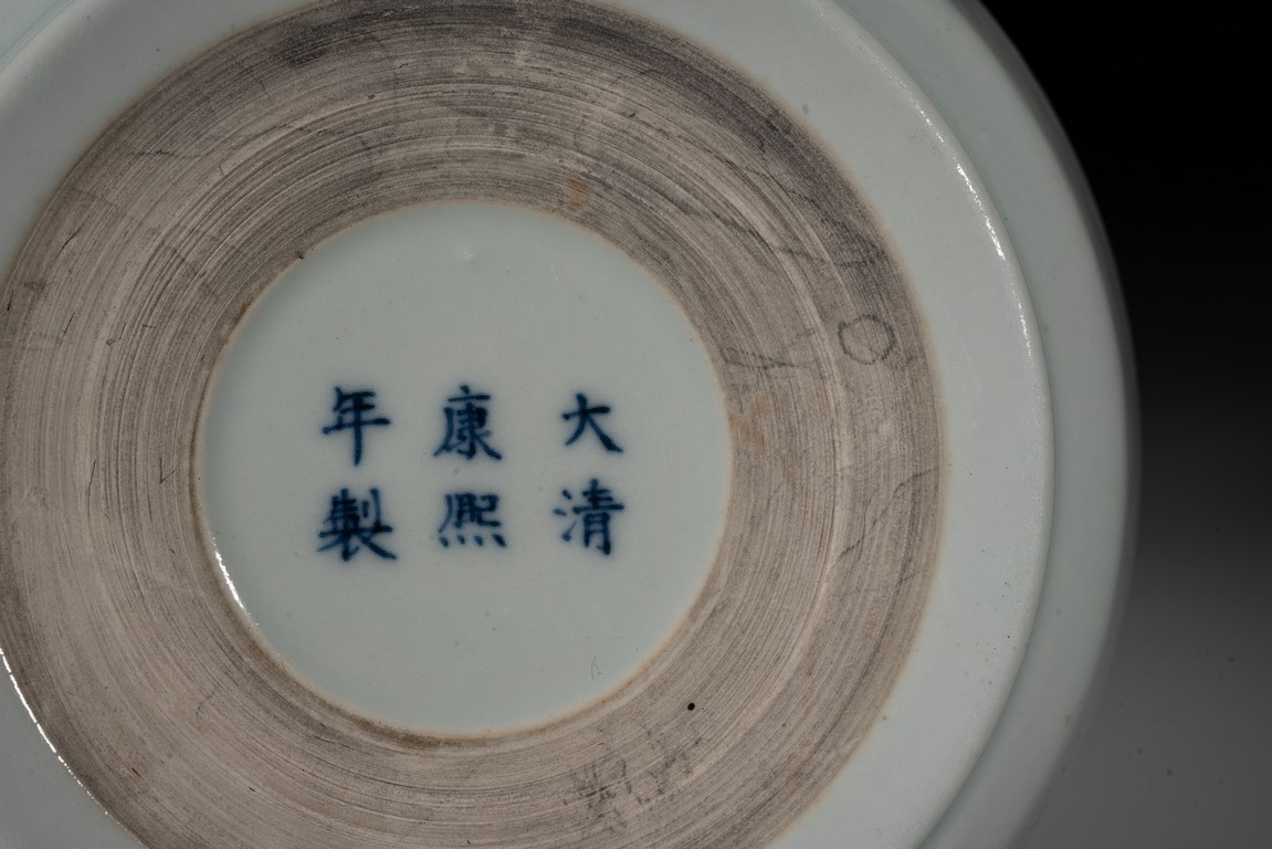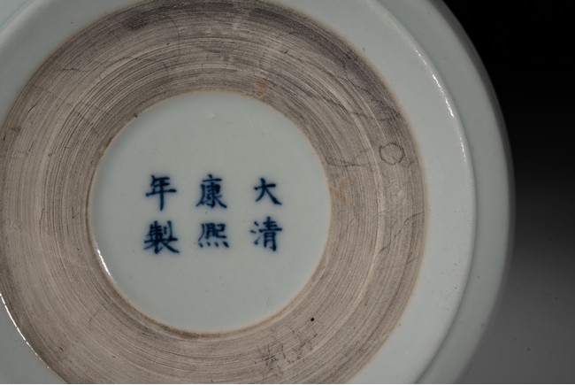 釉里紅燒造之難人所皆知,由於原料的特性,在燒造過程之中往往易於聚結,凹凸不平,若大面積塗飾,致使紋飾不清,遂成瑕疵,若火候氣氛掌握不準,其色或是暗沈,或是淺薄,皆不堪入目。本品斂口,弧腹,圈足。胎質潔白堅質,釉面肥潤細膩。洗心用釉里紅繪龍紋,紋飾精美,发色清晰艷麗,龍作側望狀,雙角後昂,須发成蓬,鱗片密布,龍身蜿蜒繞瓶肩,氣勢凜然,神情凝重欲撲火珠,此龍為五趾,亦為珍貴。“大清康熙年制”款識。