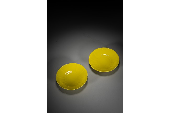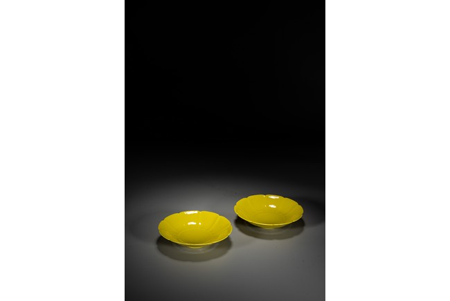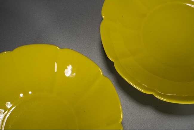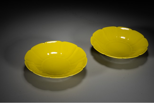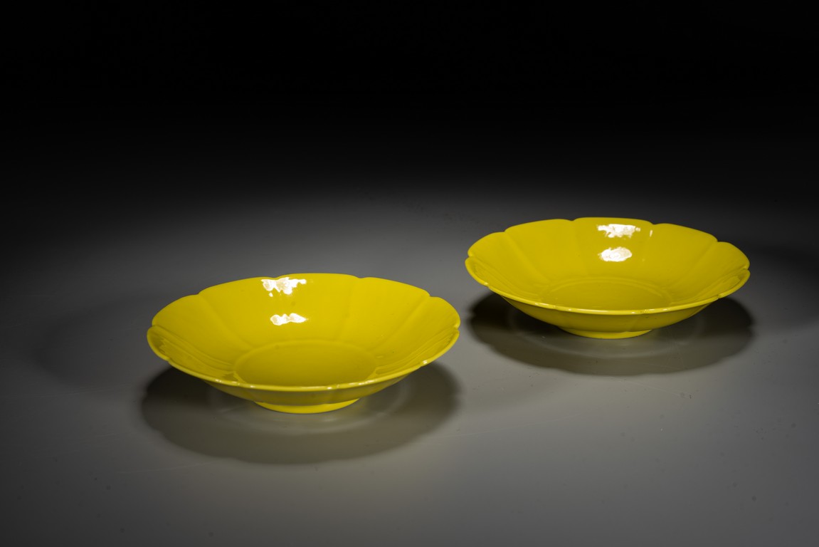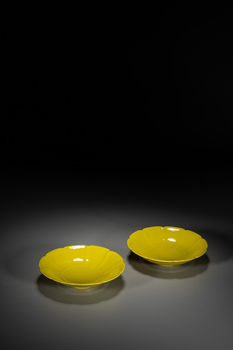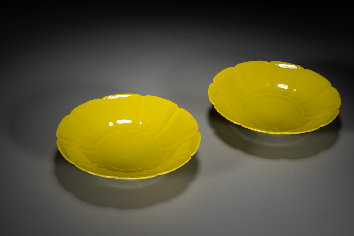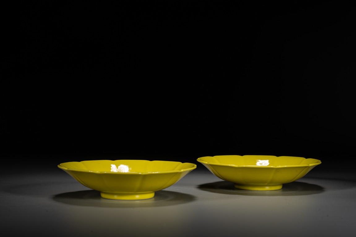 Potted with foliate rim, each dish overall suffused with attractive lemon yellow glaze, the white glazed base inscribed with six character reign mark within double ring.