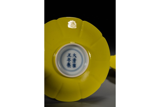 《雍正十年內務府造辦處活計文檔》中記載了當年秋季胤禛本人連續四次對制作菊花雕件表達了自己的審美意見,日理萬機的皇帝竟然對花頭的多少、骨朵的有無、梗葉的疏密都提出了具體的要求,最後不惜將內廷養植的盆菊交由造辦處,讓工匠照著臨摹,以求得真逸趣。此器敞口,器腹菊瓣狀,矮圈足,盤型周正,胎薄體輕, 內外壁皆施檸檬黃釉,純凈嬌嫩,明麗奪目,晶瑩透亮。雍正十三年唐英撰《陶成紀事碑》所載“歲例供禦”瓷器的五十七種彩、釉,其中的“西洋黃色器皿”所指便是檸檬黃釉之品。“大清雍正年制”,成對保存完好。