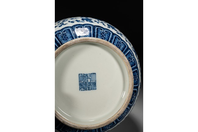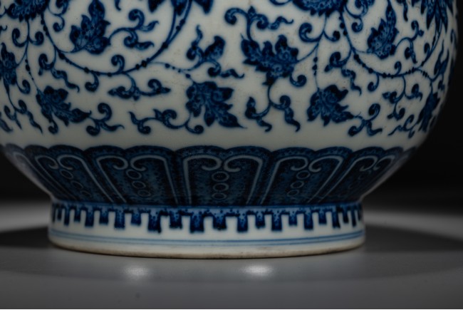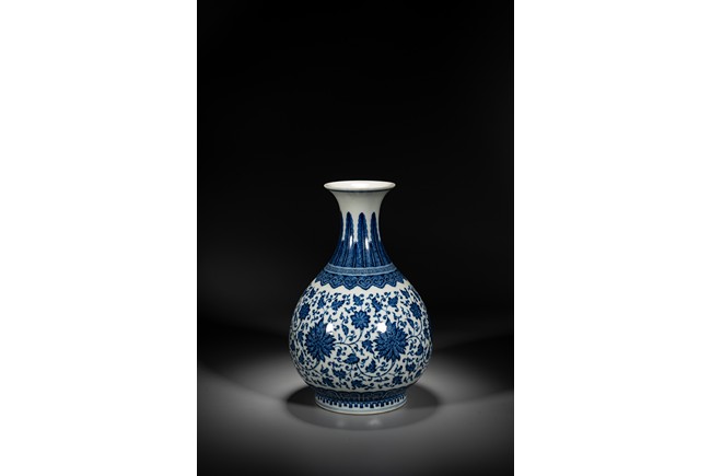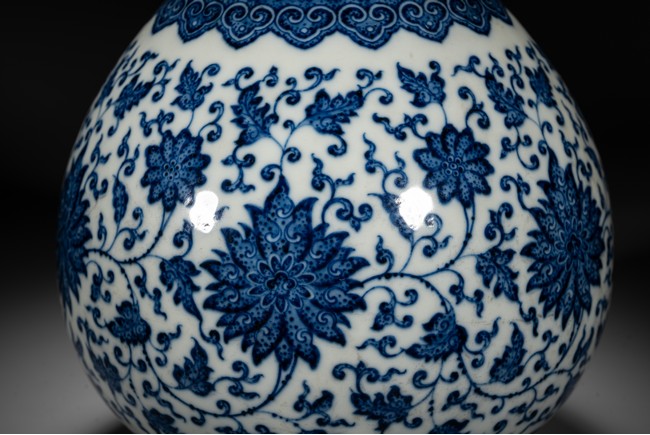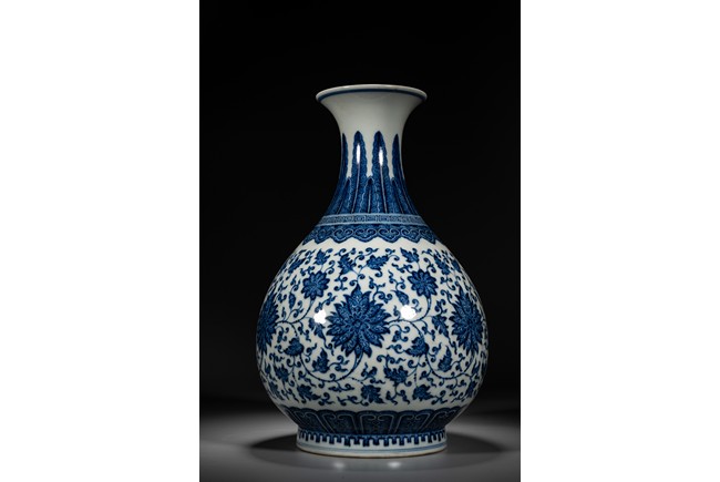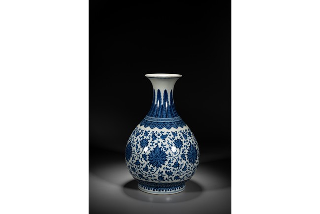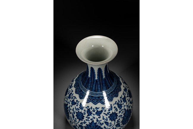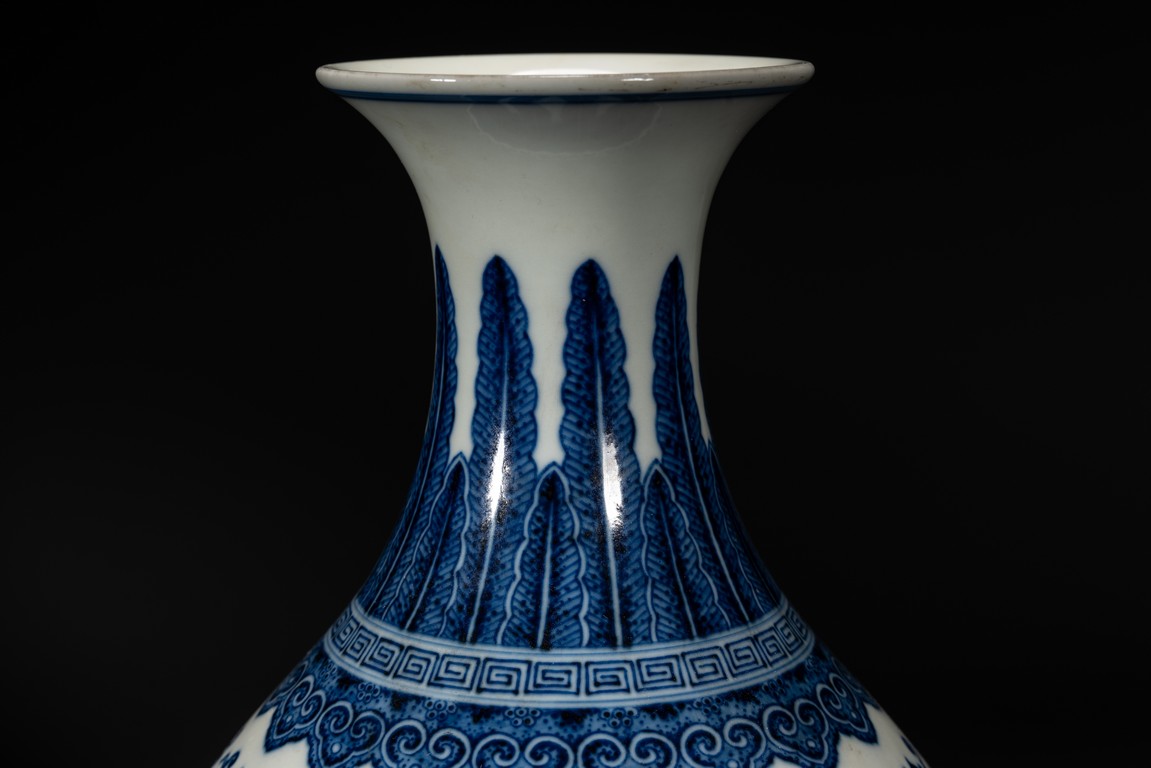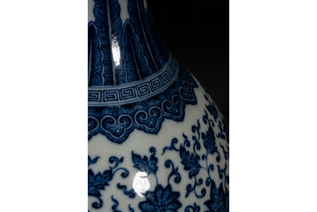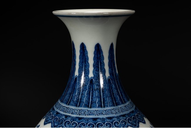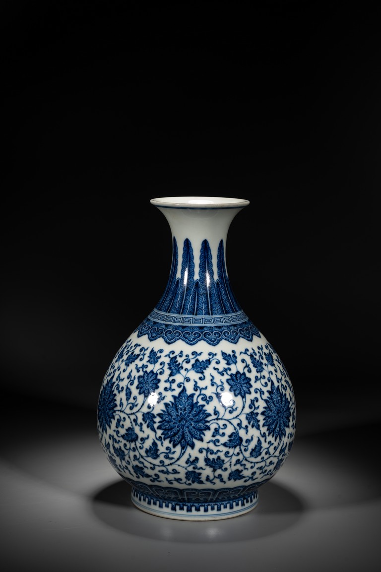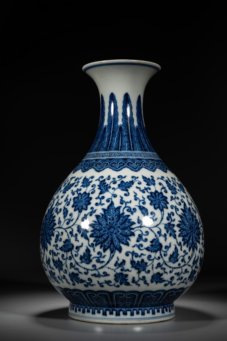 玉壺春瓶初期為酒器使用,後因器形秀美,線條勻稱,受人喜愛,逐漸作為陳設之用,歷代相沿,盛行不衰。本品撇口,細長頸,下腹略垂鼓,圈足外撇。通體青花描繪紋飾,瓶頸部繪三層紋飾各一周,上部為上仰的“蕉葉紋”,中間為“回紋”一周,下部為下垂的“如意雲紋”。腹部為“纏枝花卉紋”,紋飾布局繁密。近足處繪上仰變形蕉葉紋一周與之相呼應。整體線條秀拔,形制莊重典雅,胎質堅致細白,釉汁滋潤明亮,青花发色明快,紋飾描繪細膩,極富層次感。“大清乾隆年制”款識。