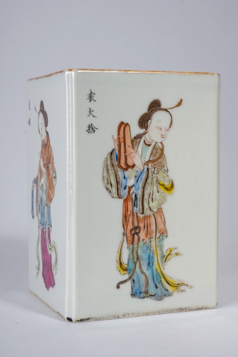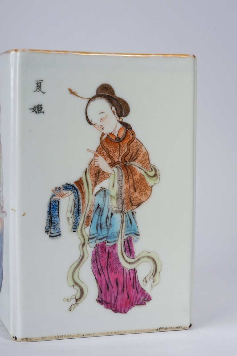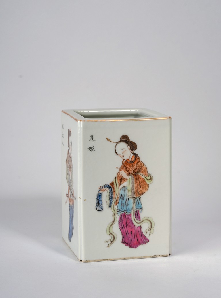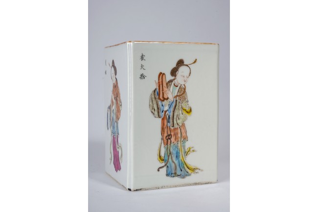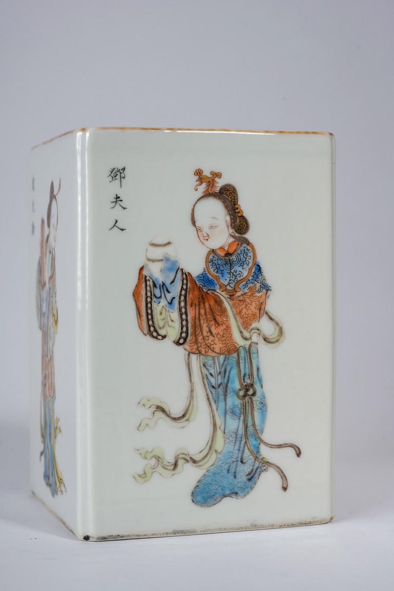 Qing Dynasty Xianfeng Period. Of square section, the body of the brushpot is finely painted in famille rose to depict on each side with the four famous ladies from Chinese classical and historical stories, the base inscribed with xianfeng reign mark in red.
