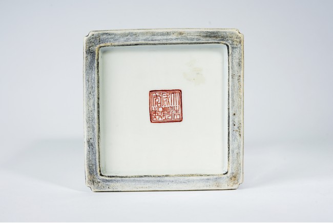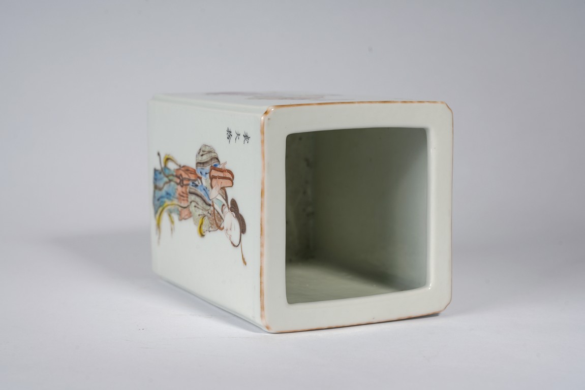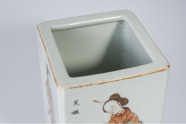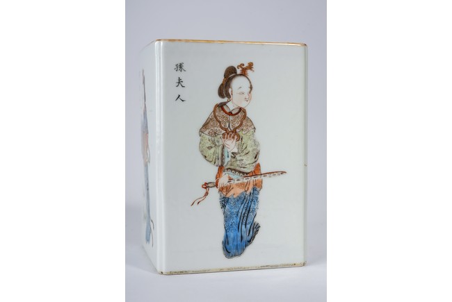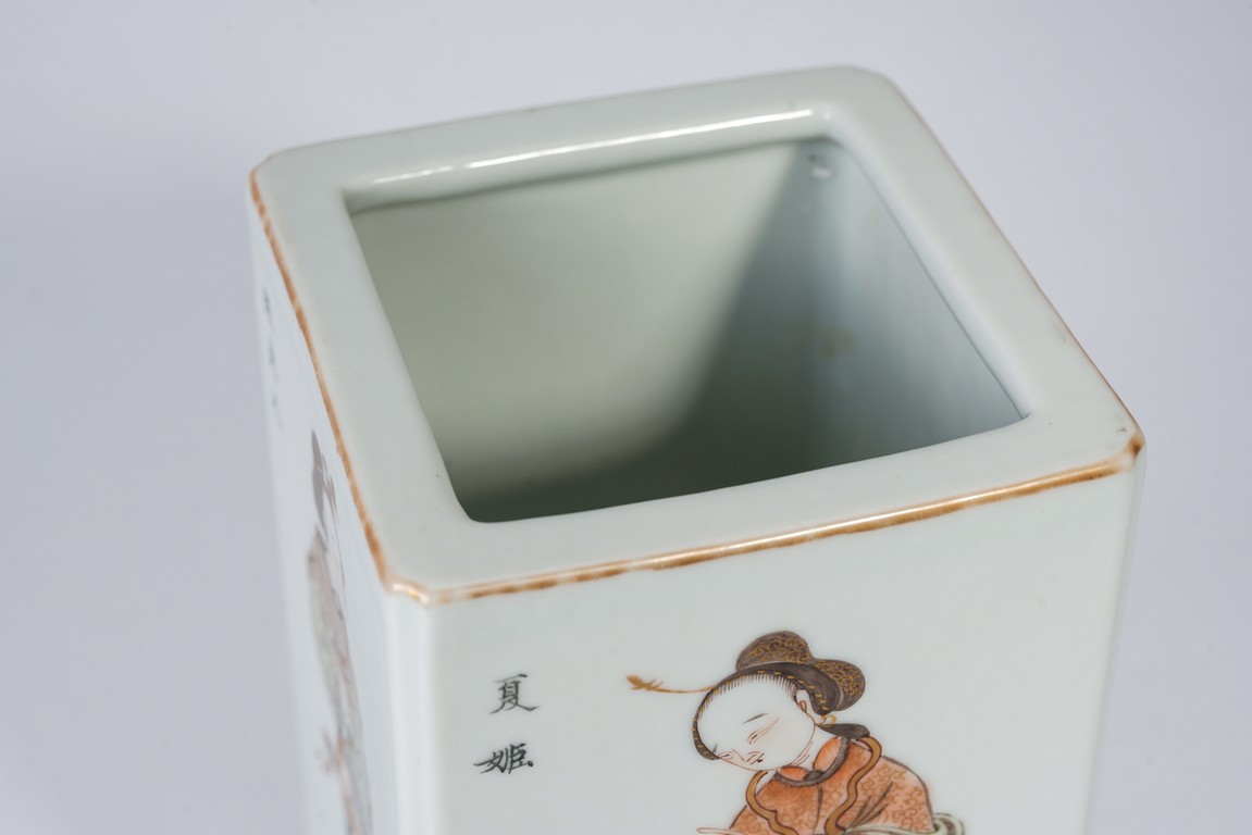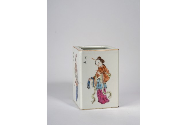 Qing Dynasty Xianfeng Period. Of square section, the body of the brushpot is finely painted in famille rose to depict on each side with the four famous ladies from Chinese classical and historical stories, the base inscribed with xianfeng reign mark in red.