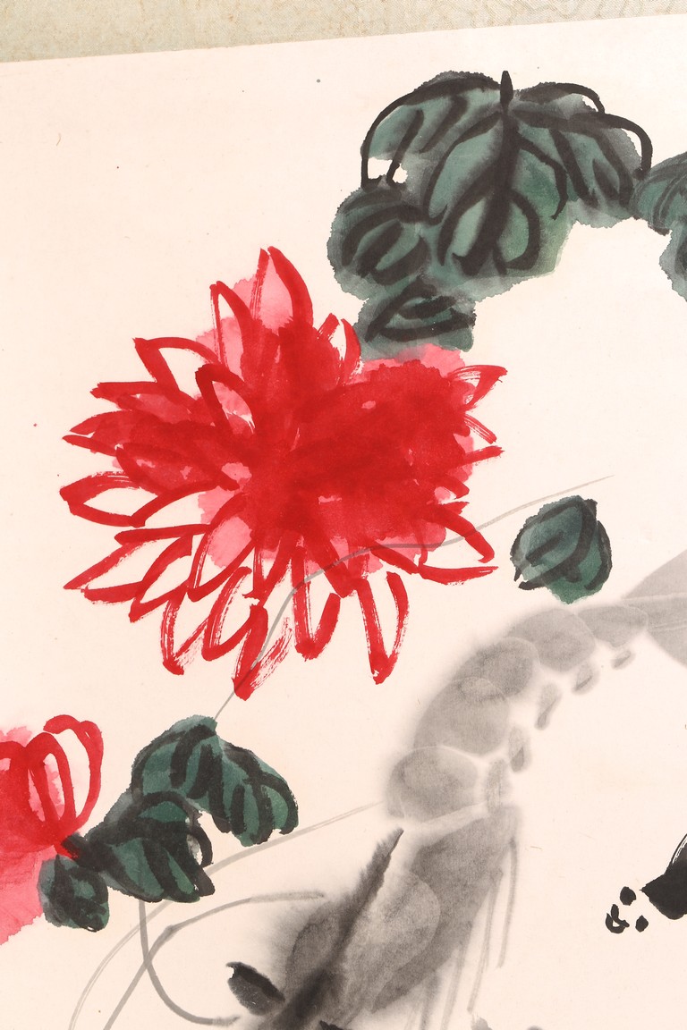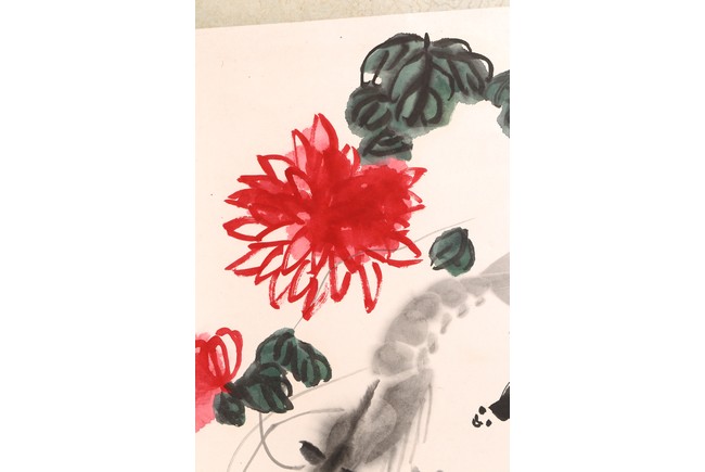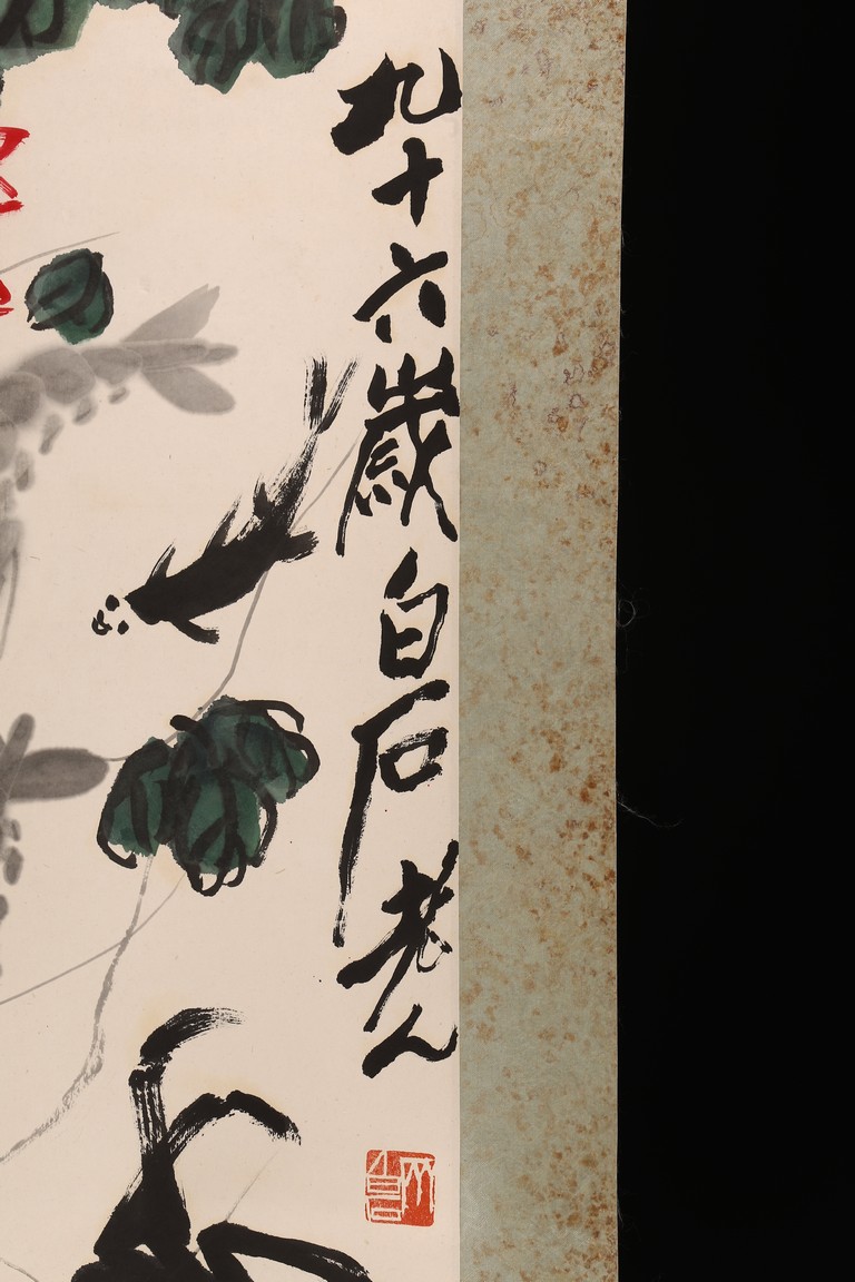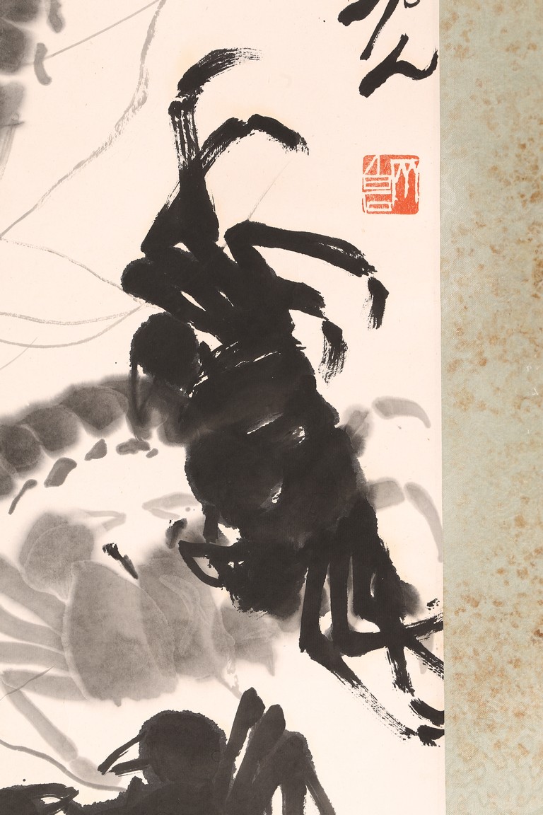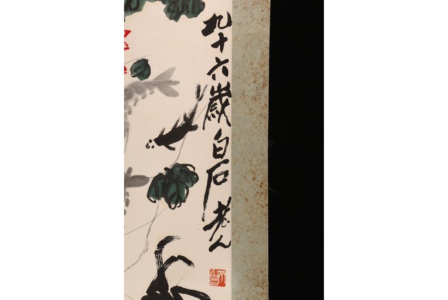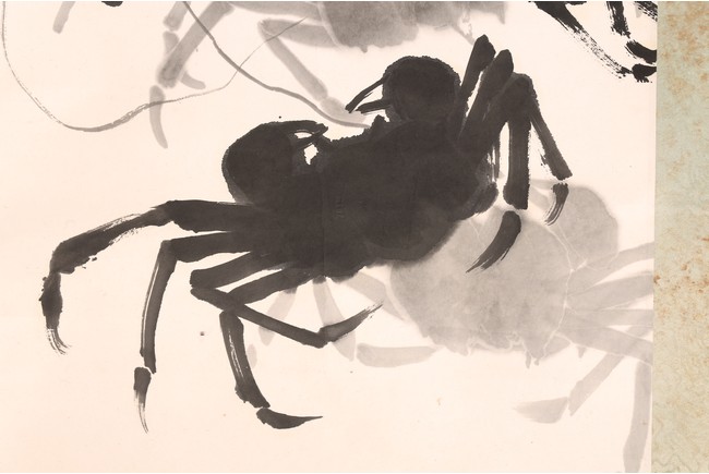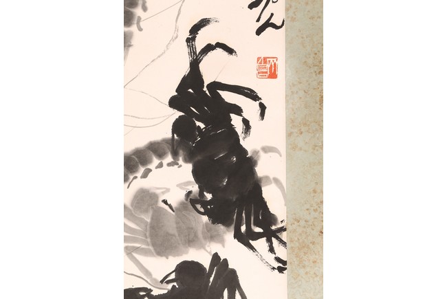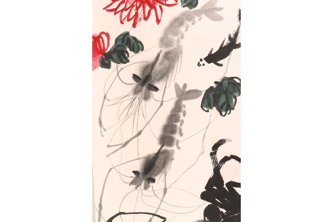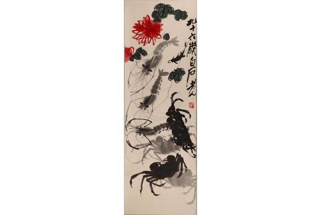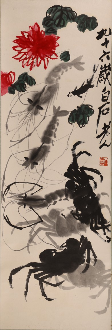 Color and ink on paper. Shrimps, crabs, and fish. Mounted on paper. Signed Baishi Laoren, with one seal mark, dated to 1956 or 1957.