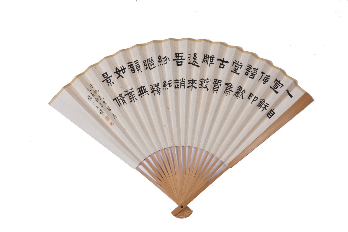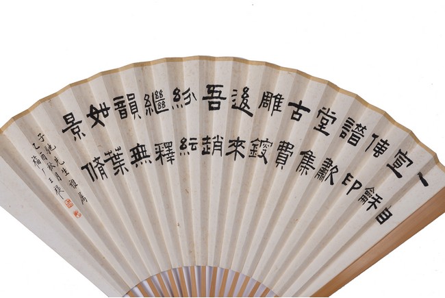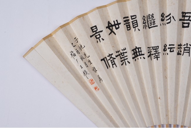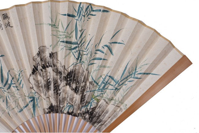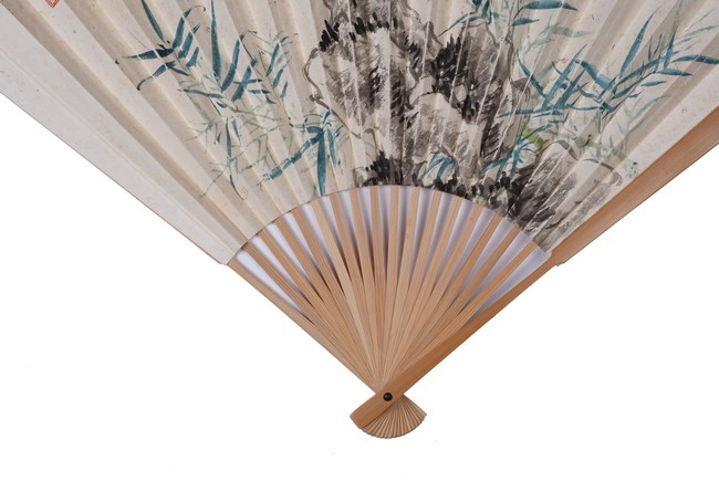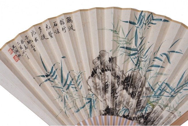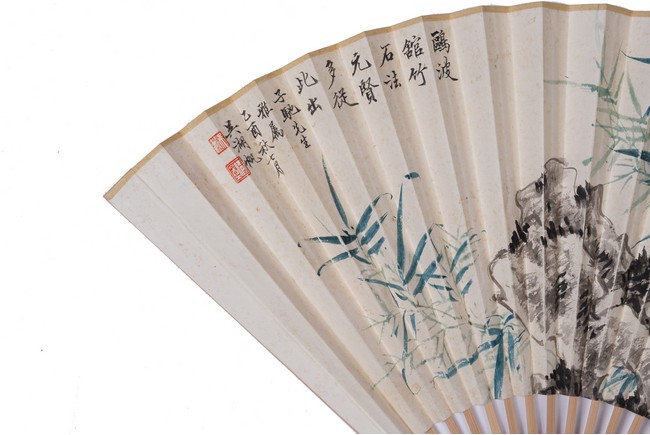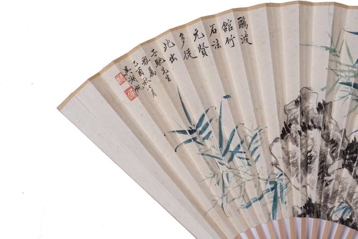 Chinese. Bamboo and rock. Folding fan. The front inscribed and signed Wu Hufan with two seal marks, the reverse with calligraphy inscribed and signed Wang Ti with two seal marks.