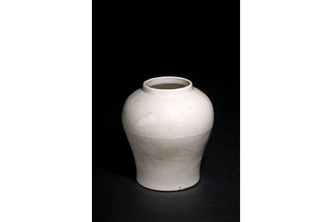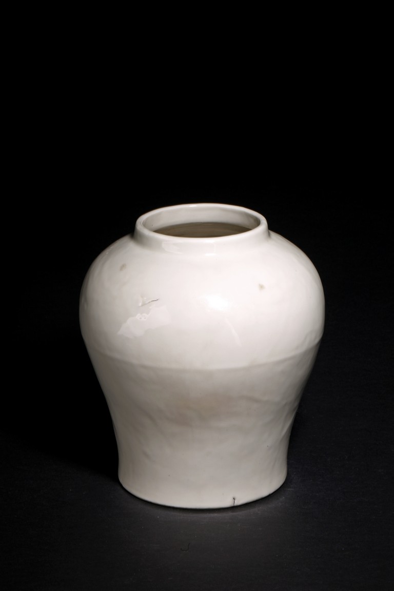 The ovoid body with rounded broad shoulders, covered overall in a milky-white glaze.