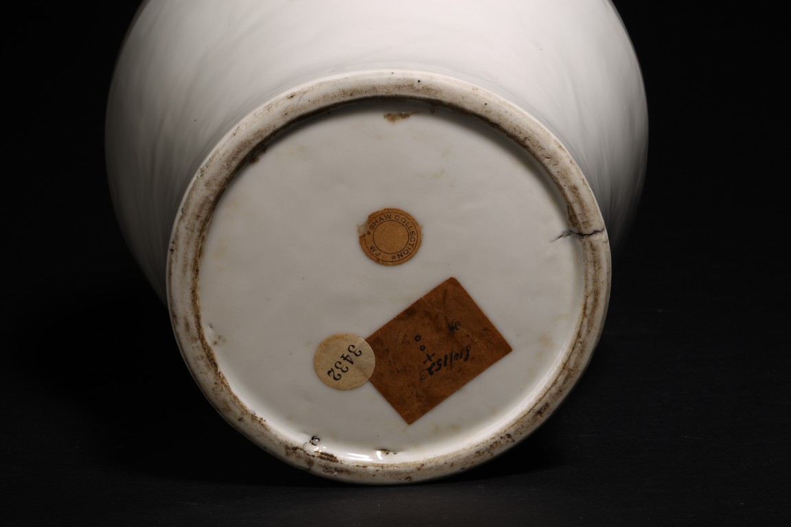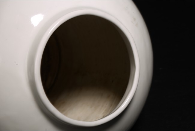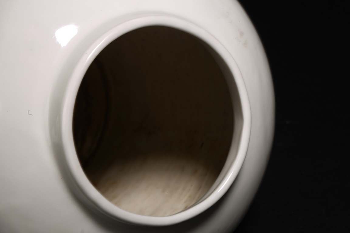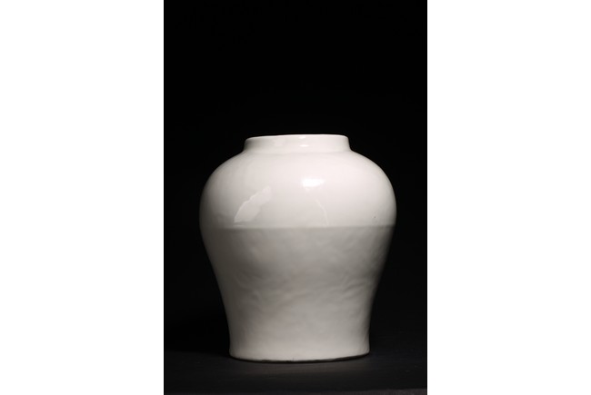 罐為直口,豐肩鼓腹,腹下漸收,圈足。全器造型端莊,器身滿施白釉,釉質肥厚,潔白瑩潤,白如凝脂,素猶積雪,工藝精致細膩。