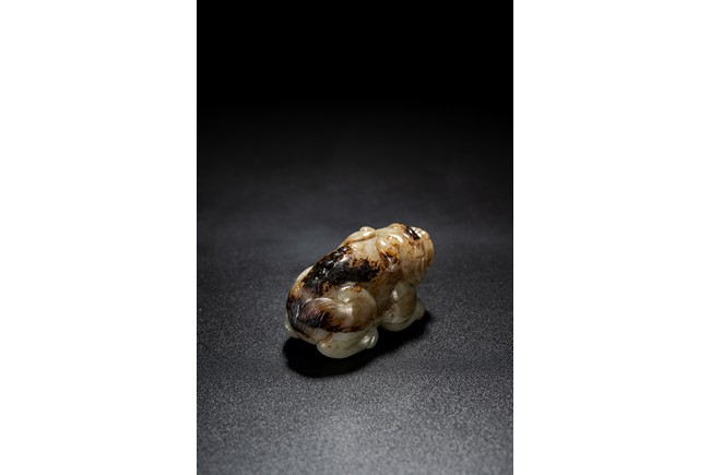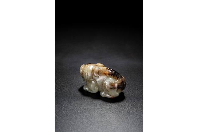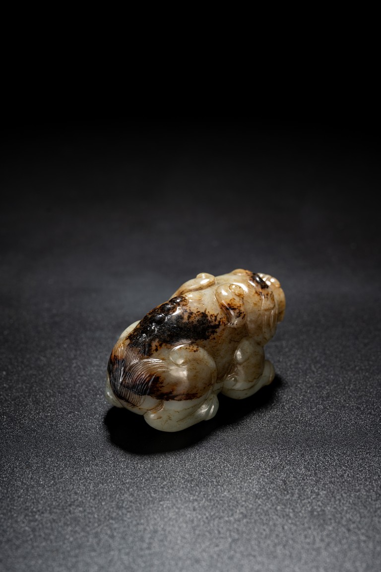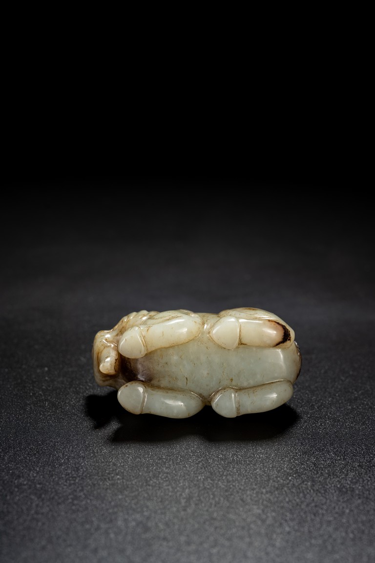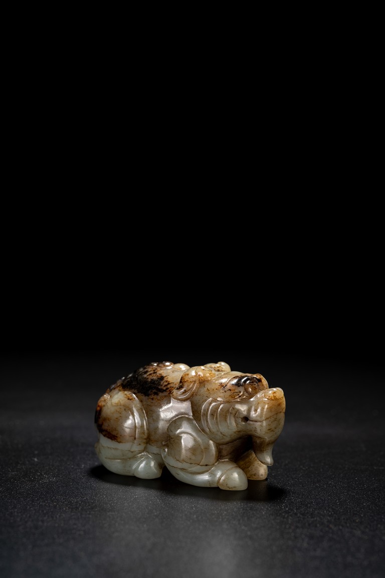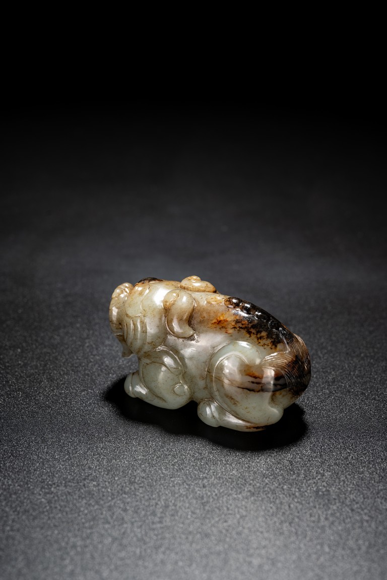 Ming Dynasty period. The recumbent mythical beast shown with protruding eyes and large flared nostrils, the celadon tone stone with extensive black and russet inclusions.