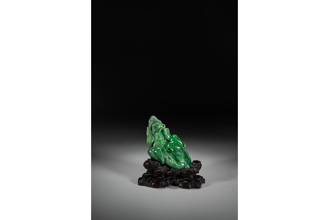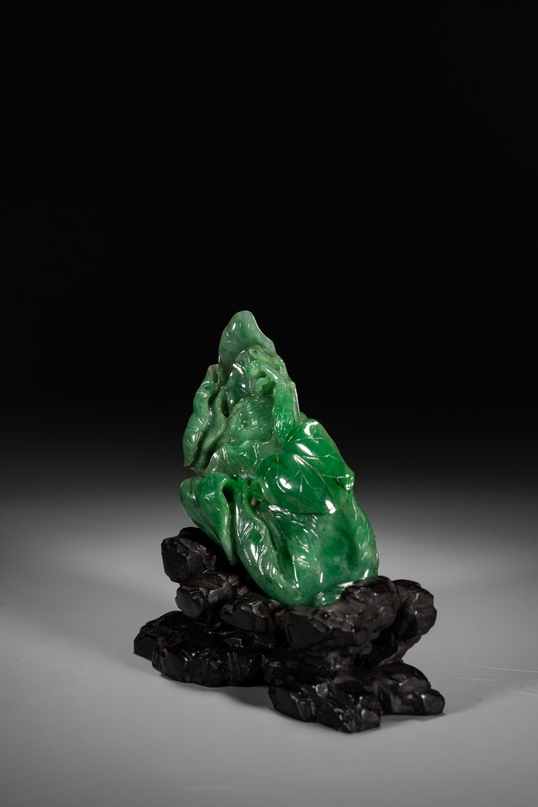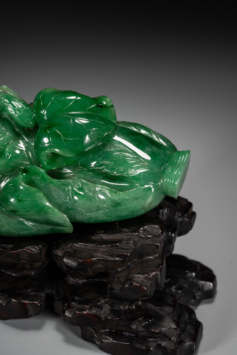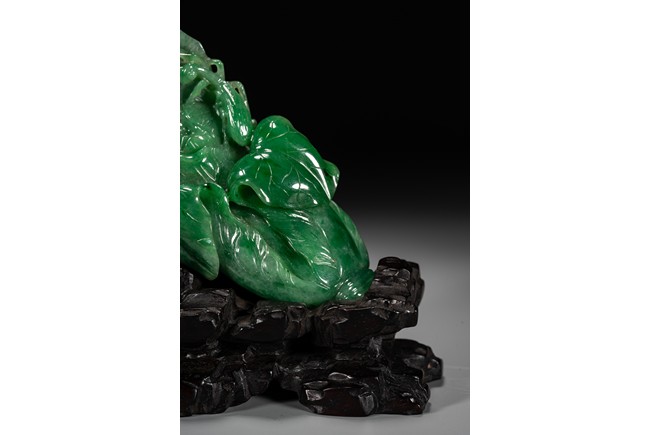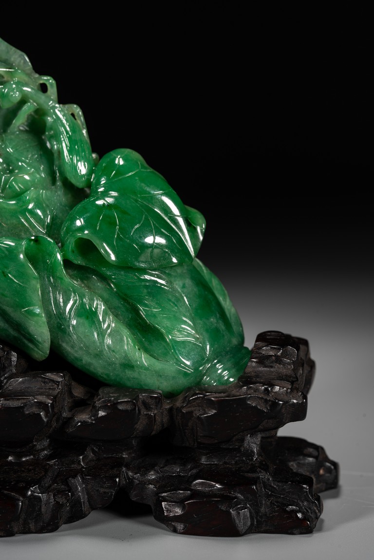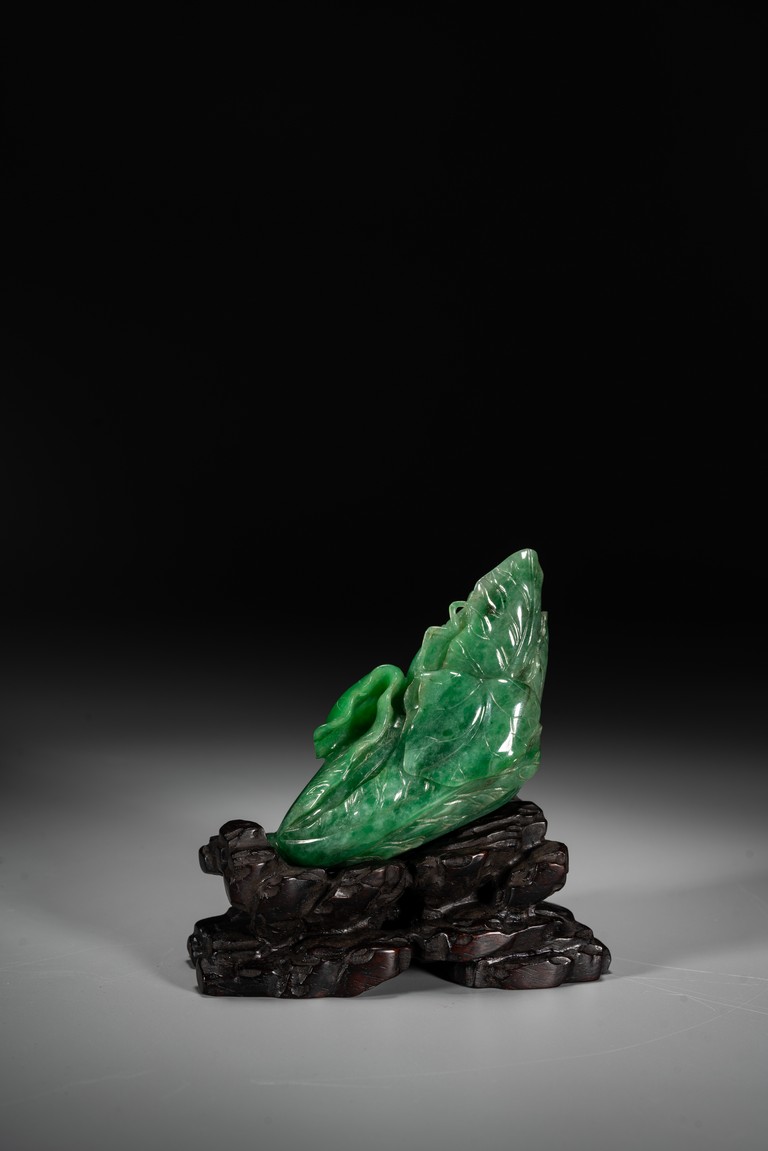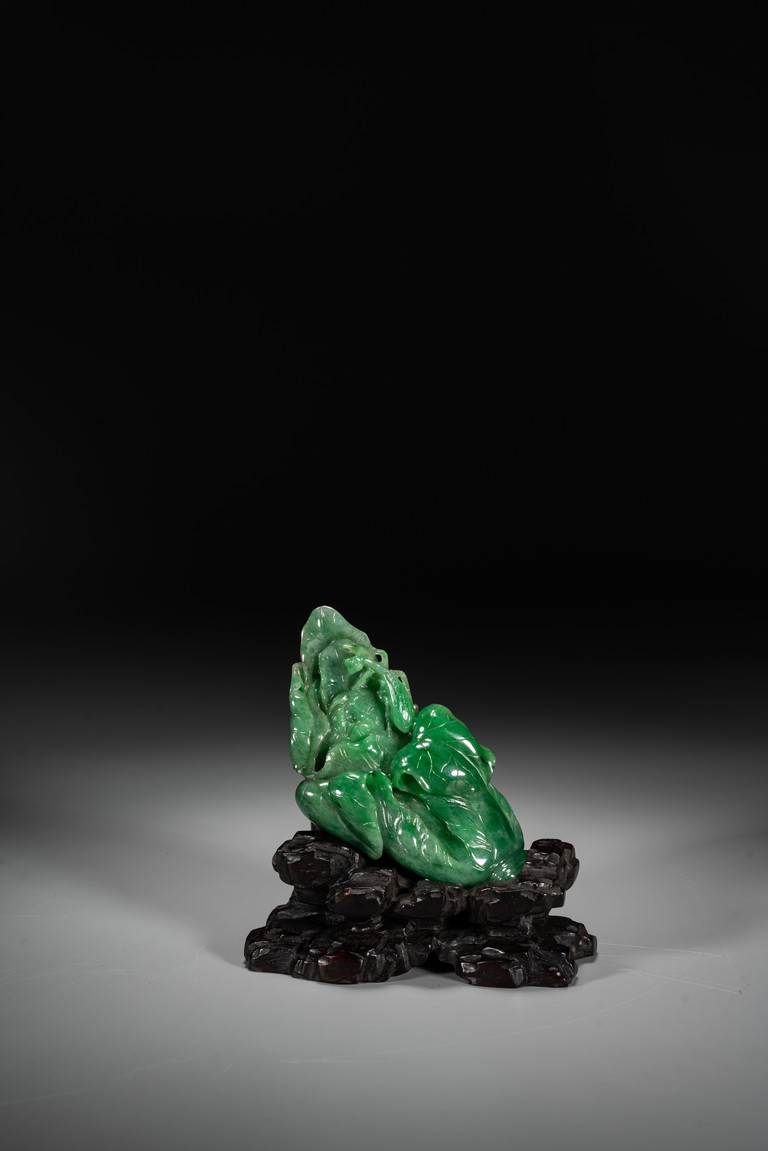 本件器物用上等翡翠圓雕而成,通體碧綠,青翠欲滴,水頭充足,色澤通透,種水俱佳。白菜根須繁密,穿插扭轉,葉片層層包裹,數片菜葉伸展自然,次序分明,錯落有致,有如自然生髮而成。葉片上精細入微地挖出凹凸不平的紋理,葉脈與肌理的處理一絲不茍,飄逸婉轉的菜葉部份,頗有偃仰顧盼之態。在白菜葉子上趴伏螳螂,增添了不少靈動之氣。清代講究工必有意、意必吉祥。 “白菜”的諧音為“百財”,又可稱為“橫財(菜) 就手”,寓意一切意外之財皆唾手可得。螳螂,寓意活力四射、興旺發達,有“家和萬事興”之意。配碎石紋木座。來源:紐約重要私人收藏 Provenance: Property from an important private collection, New York