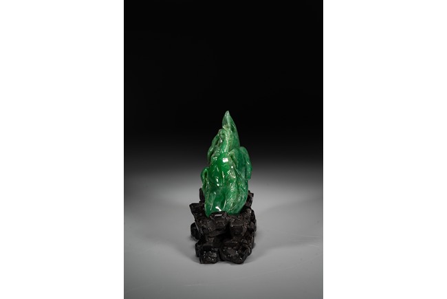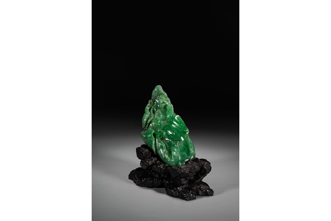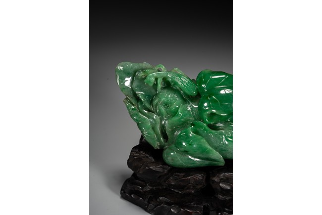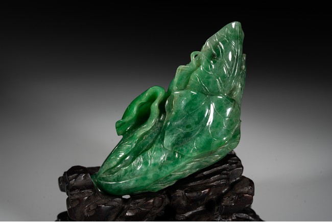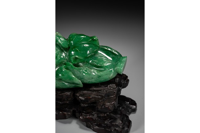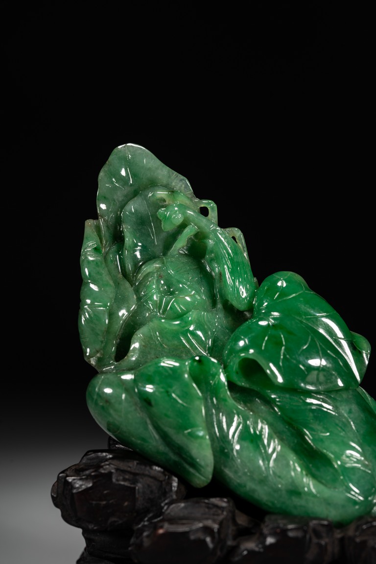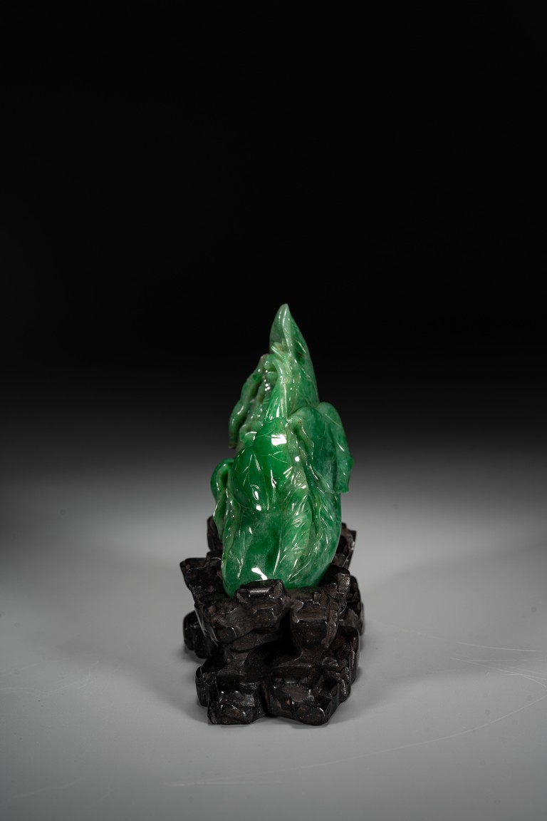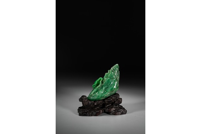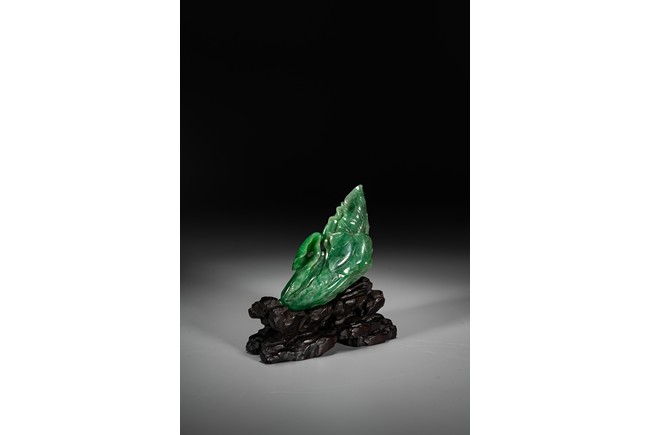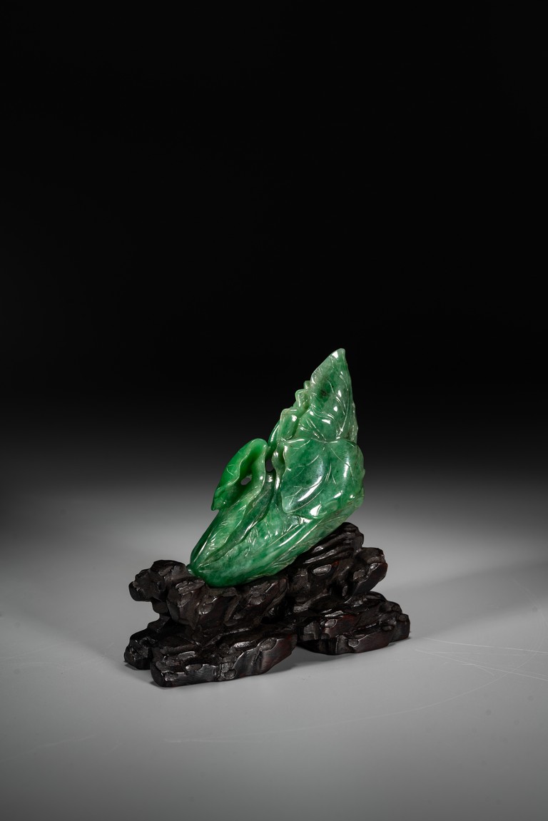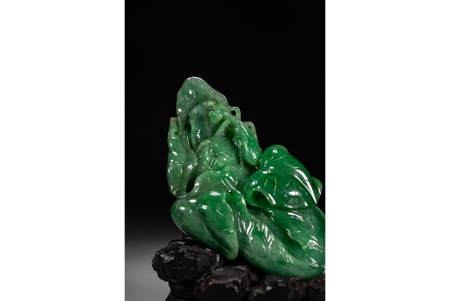 本件器物用上等翡翠圓雕而成,通體碧綠,青翠欲滴,水頭充足,色澤通透,種水俱佳。白菜根須繁密,穿插扭轉,葉片層層包裹,數片菜葉伸展自然,次序分明,錯落有致,有如自然生髮而成。葉片上精細入微地挖出凹凸不平的紋理,葉脈與肌理的處理一絲不茍,飄逸婉轉的菜葉部份,頗有偃仰顧盼之態。在白菜葉子上趴伏螳螂,增添了不少靈動之氣。清代講究工必有意、意必吉祥。 “白菜”的諧音為“百財”,又可稱為“橫財(菜) 就手”,寓意一切意外之財皆唾手可得。螳螂,寓意活力四射、興旺發達,有“家和萬事興”之意。配碎石紋木座。來源:紐約重要私人收藏 Provenance: Property from an important private collection, New York