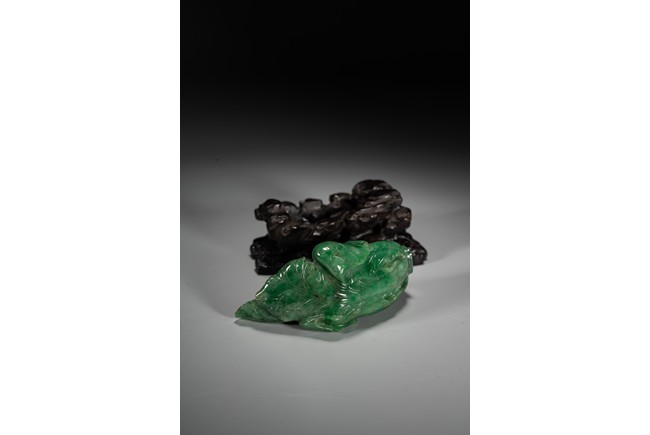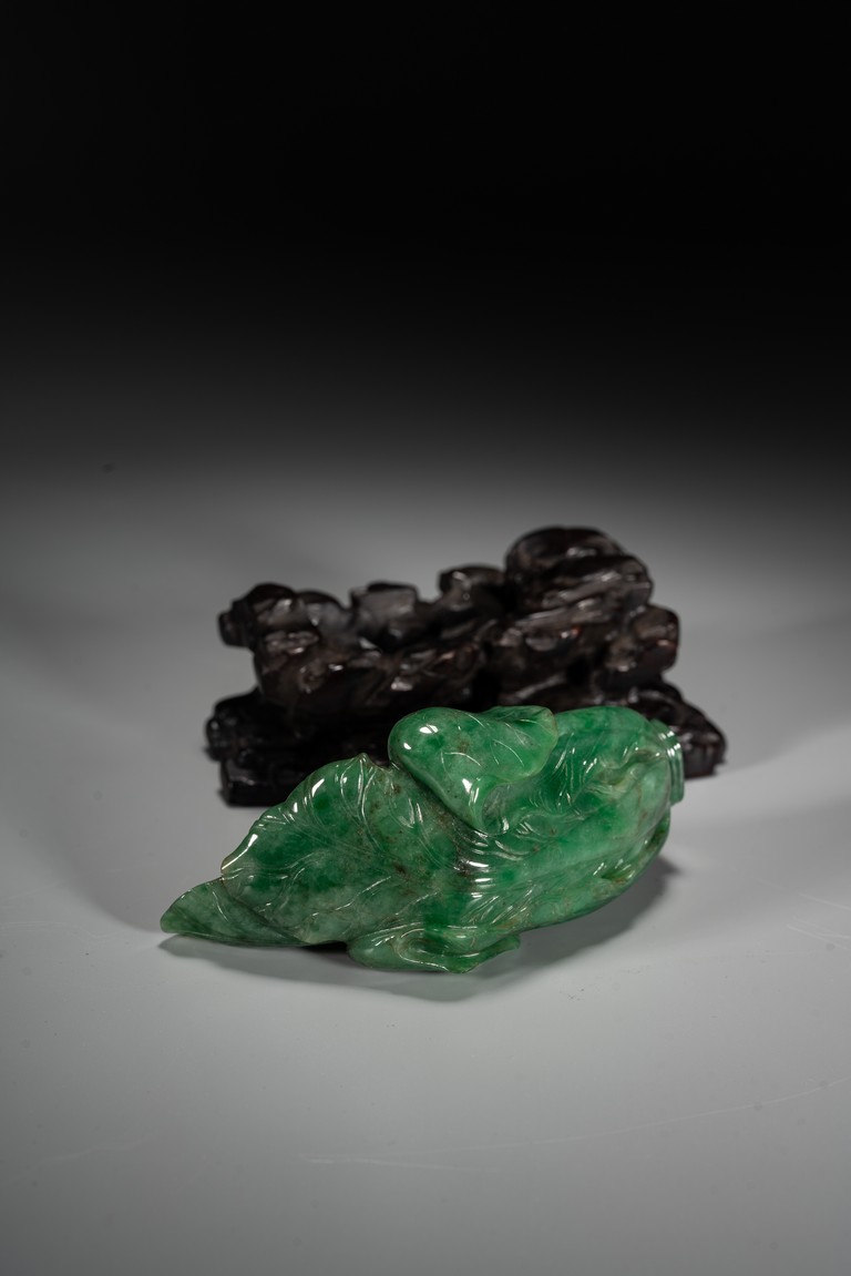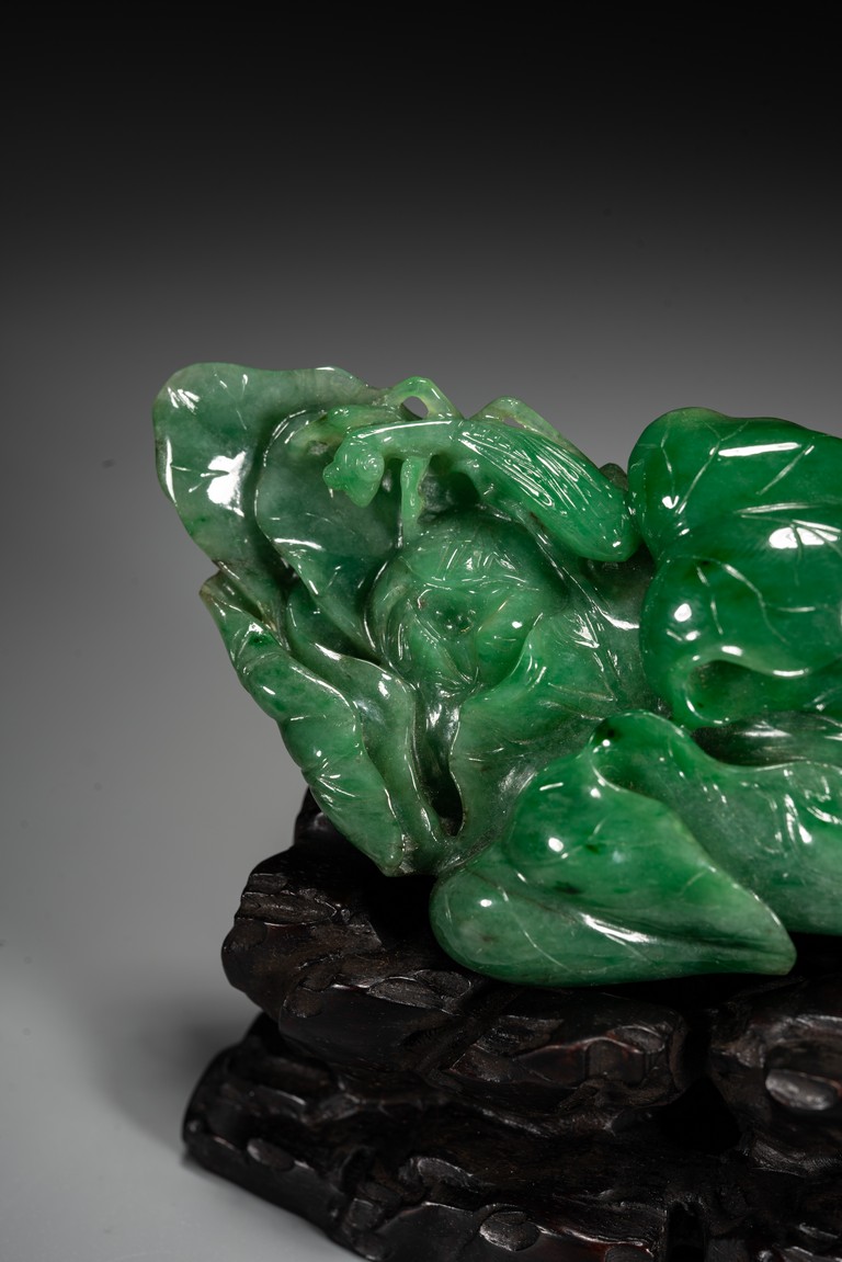 Qing Dynasty period. Carved in the form of a cabbage with a mantis clambering on it, the stone is of rich emerald green color, with wood carved stand. The cabbage with mantis in Chinese culture signifies the good fortune and prosperity.