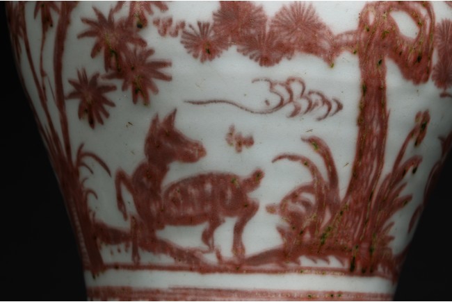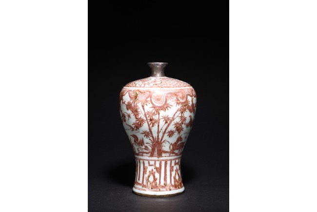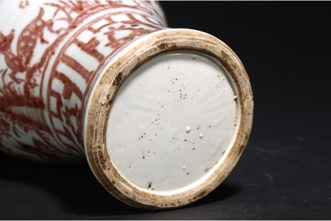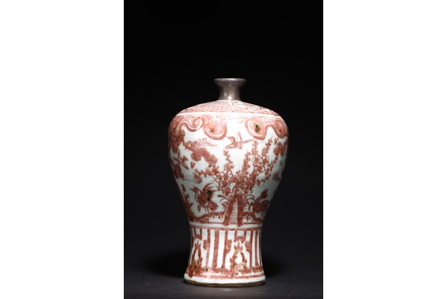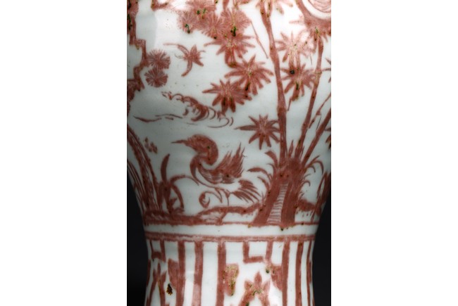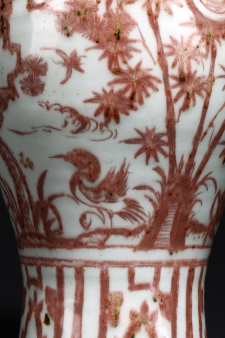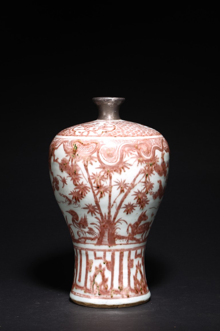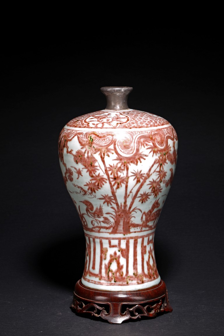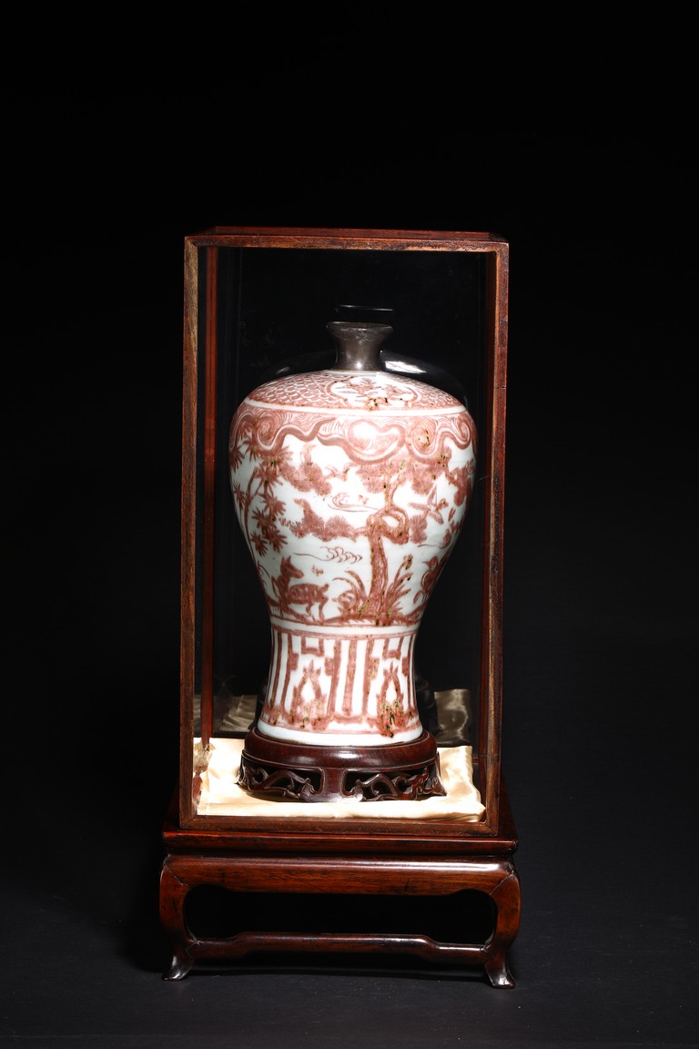 小口短頸,豐肩弧腹,頸部內斂,圈足微外撇,胎體細膩潔白,造型規整,比例和諧,俊秀穩重,端莊大方。釉里紅燒造技術較難掌握,尤其是銅元素對爐窯的溫度和氣氛要求非常嚴格,燒制溫度低了顏色发黑,溫度高了顏色又會暈散,甚至完全揮发成不了紅色。本品通體釉里紅為飾,顏色鮮明,出色鮮妍清晰,實屬難得,繪“松竹紋”,紋飾清晰自然,繪工精美。帶木座。來源:洛杉磯私人藏家收藏 Provenance: Private collection, Los Angeles