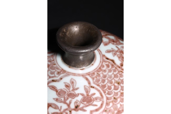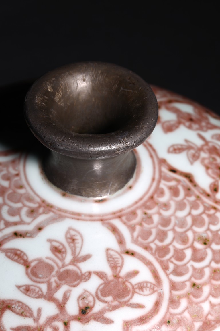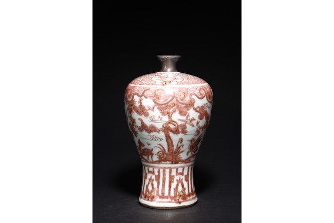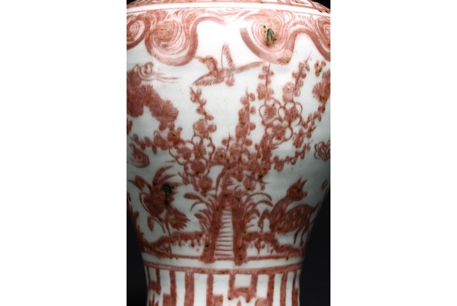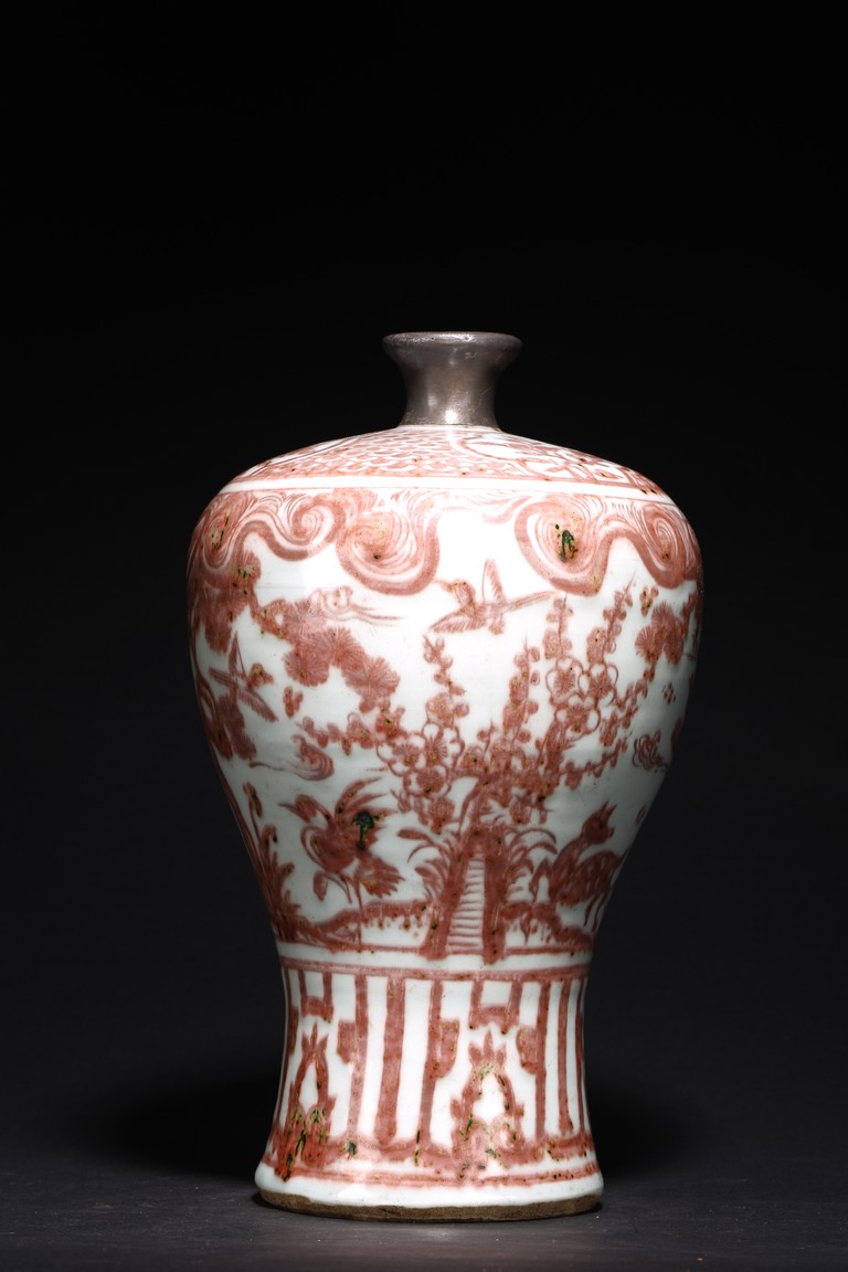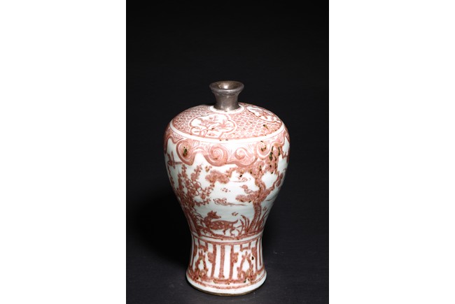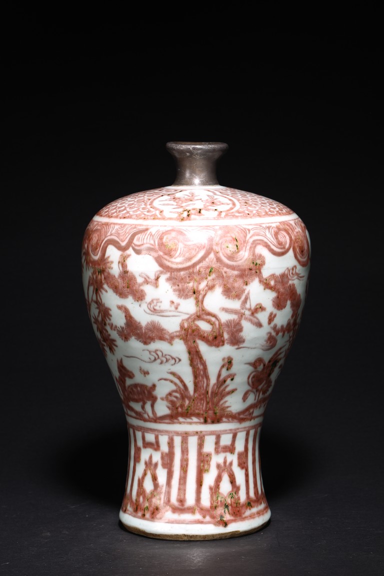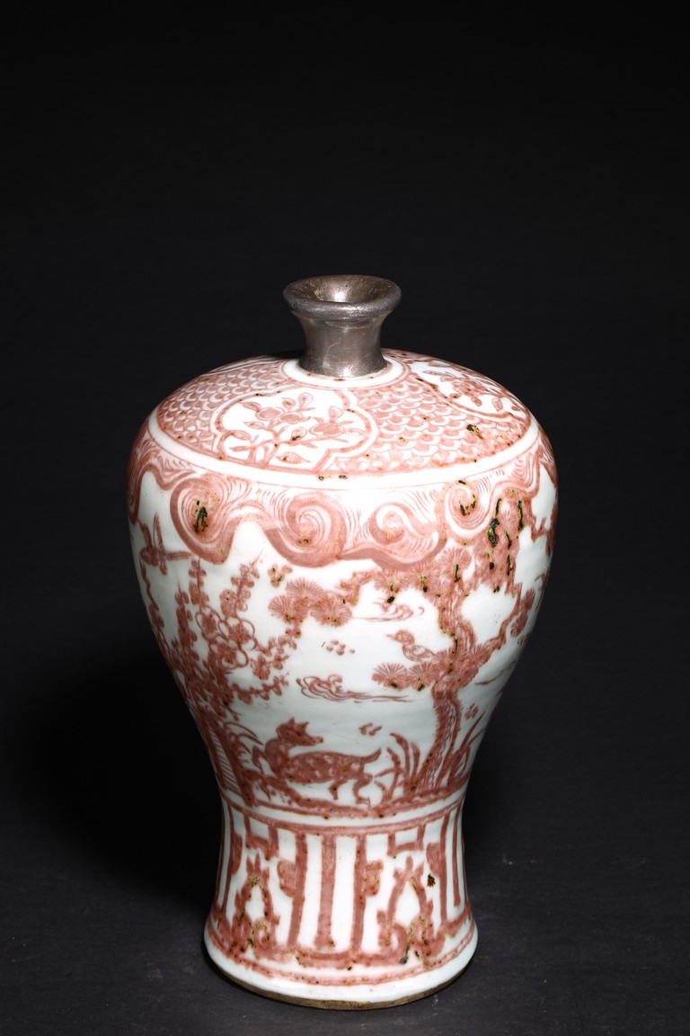 Ming Dynasty period. Of finely potted baluster form rising to a short later replaced waisted metal neck with an everted lip, painted around the body in underglaze red with a broad band enclosing plum blossom, bamboo, and pine trees, with deer, cranes, and magpies in flight included in the scene, all between geometric band at the base and ocean wave bands and four cusped flower-filled panels reserved on a dense diaper ground encircling the neck.