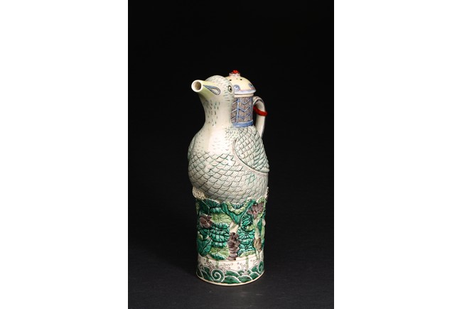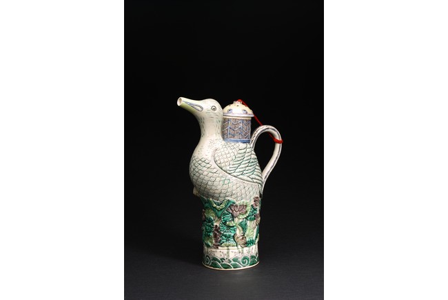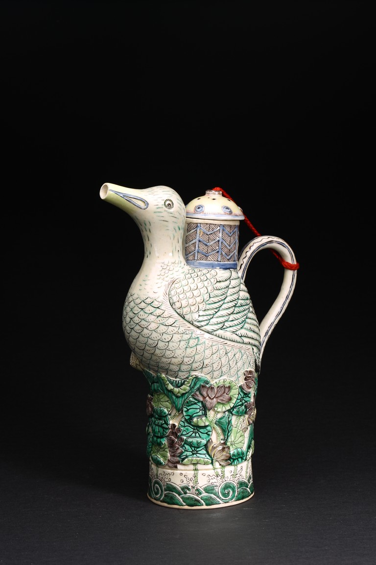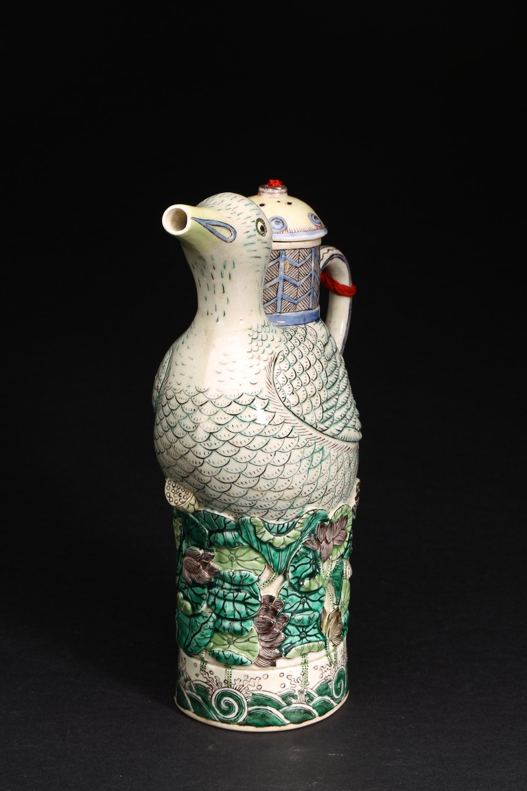 Qing Dynasty period. Modelled in the form of duck swimming in lotus pond, with cover at the back, tail in the form of handle.