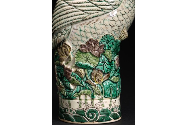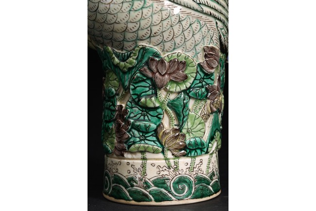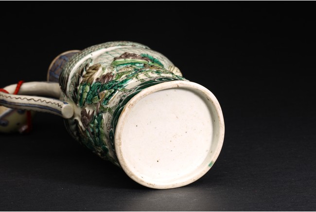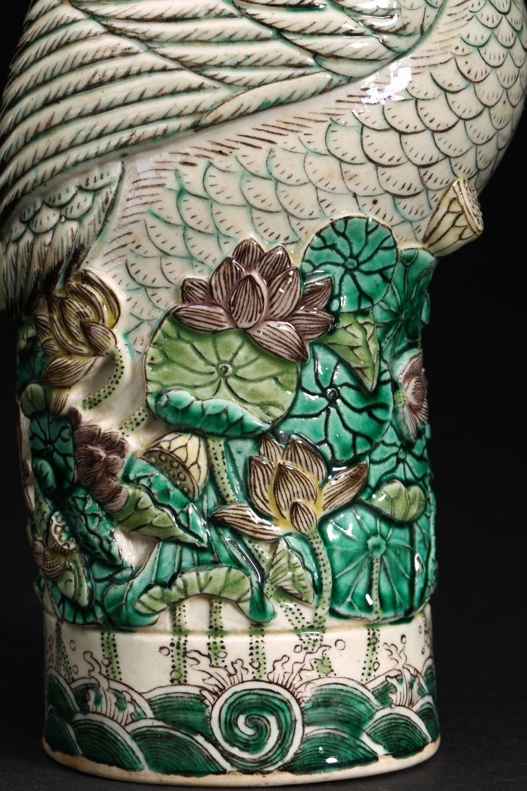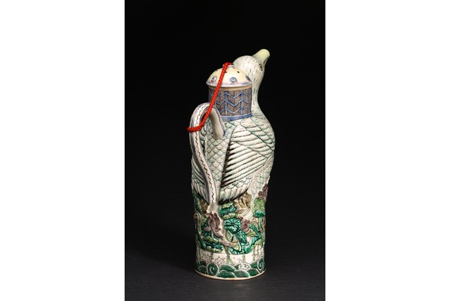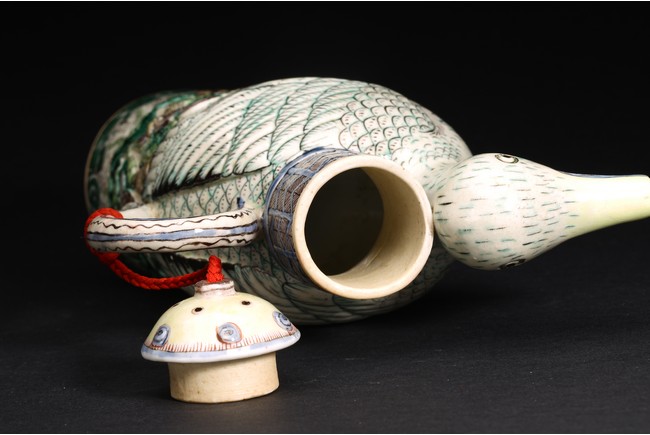 直頸,溜肩,圓腹,平底,鴨首為流,另一端有圓拱形把。器身施三彩,以黃、綠、紫為主要色彩,器型規整,釉色勻凈,典雅別致。鴨首雙目圓瞪,目視前方,身體肥碩,裝飾羽毛紋和翎毛紋,下繪“荷花”“荷葉”,形象生動,活靈活現。