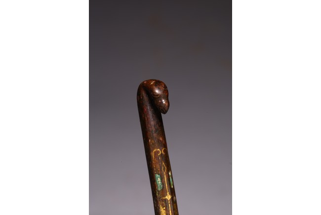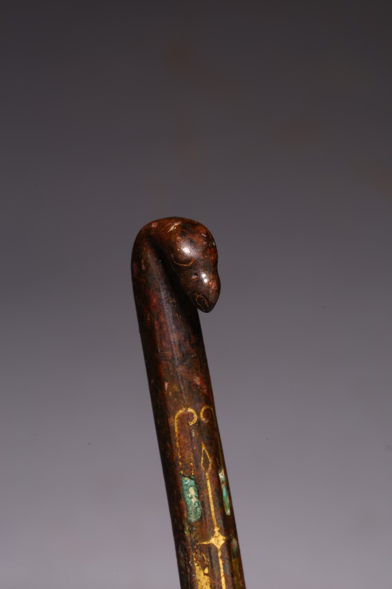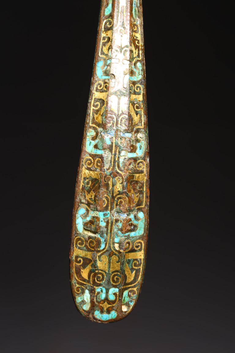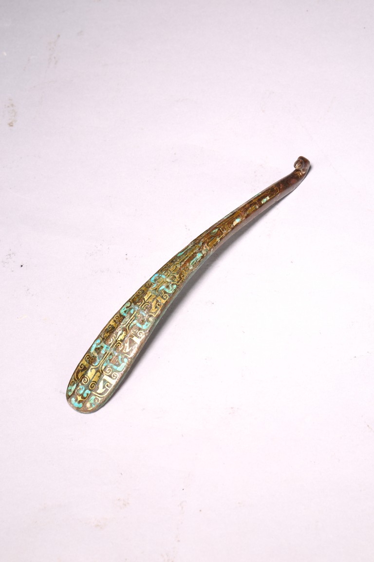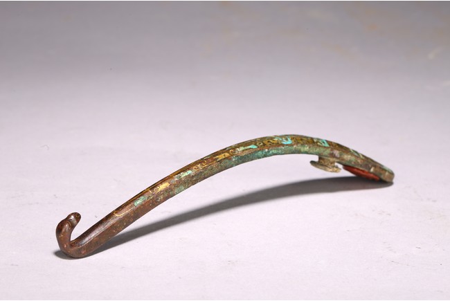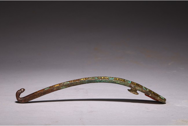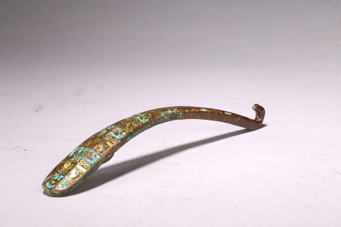 Warring State period. The 'S'-curved body surmounted by a small tiger head with a long slender neck gracefully curving to a widening body with canted sides, finely inlaid with gold and turquoise forming a geometric pattern, the reverse set with a round button for attachment to a garment. For a similar bronze turquoise inset belt hook, please refer to Lot 1529, sold in Christie's New York in Sept. 2020, for $100,000