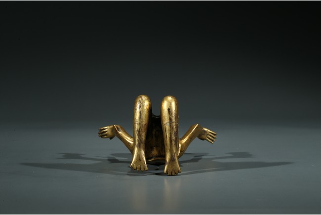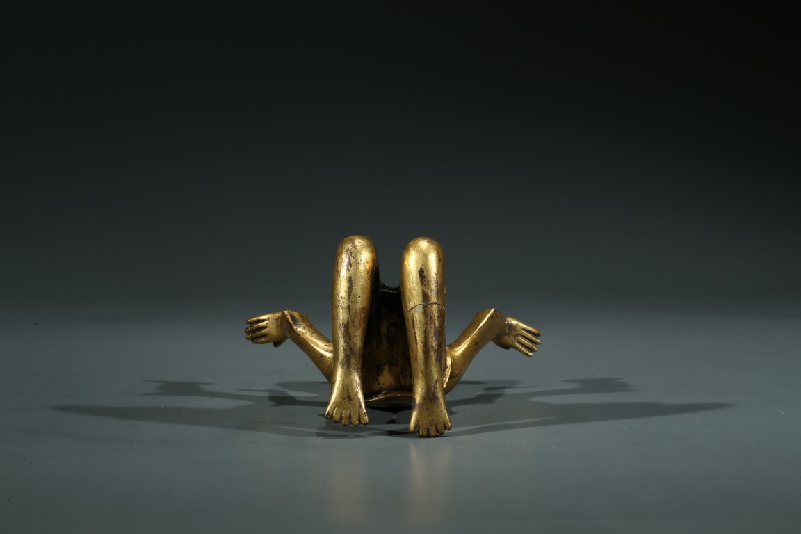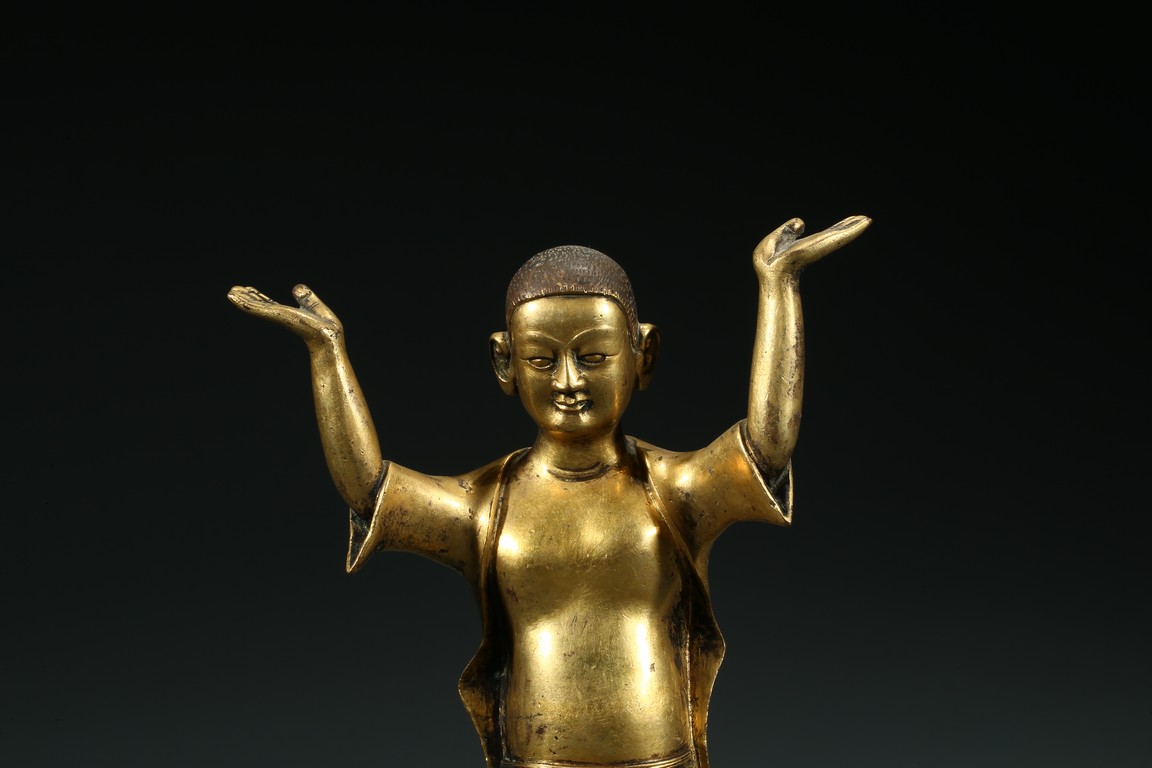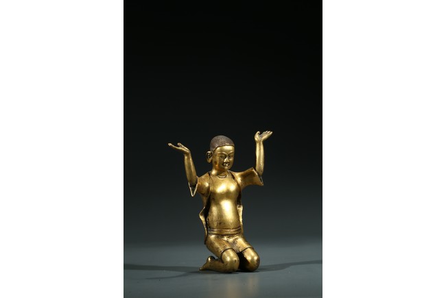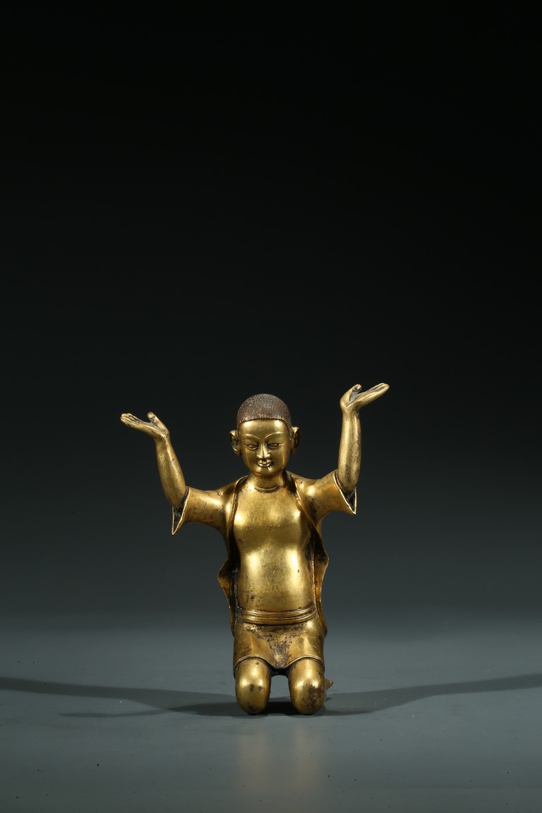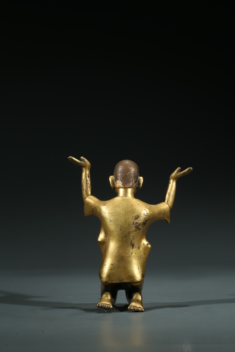Qing Dynasty period. Cast with a kneeling figure wearing robe with hands raised and palms facing upward, face with stern expression, head with short crop hair.