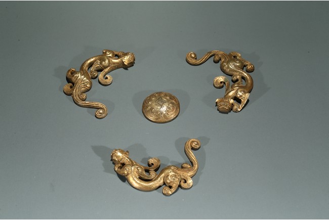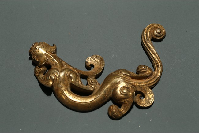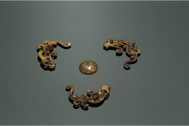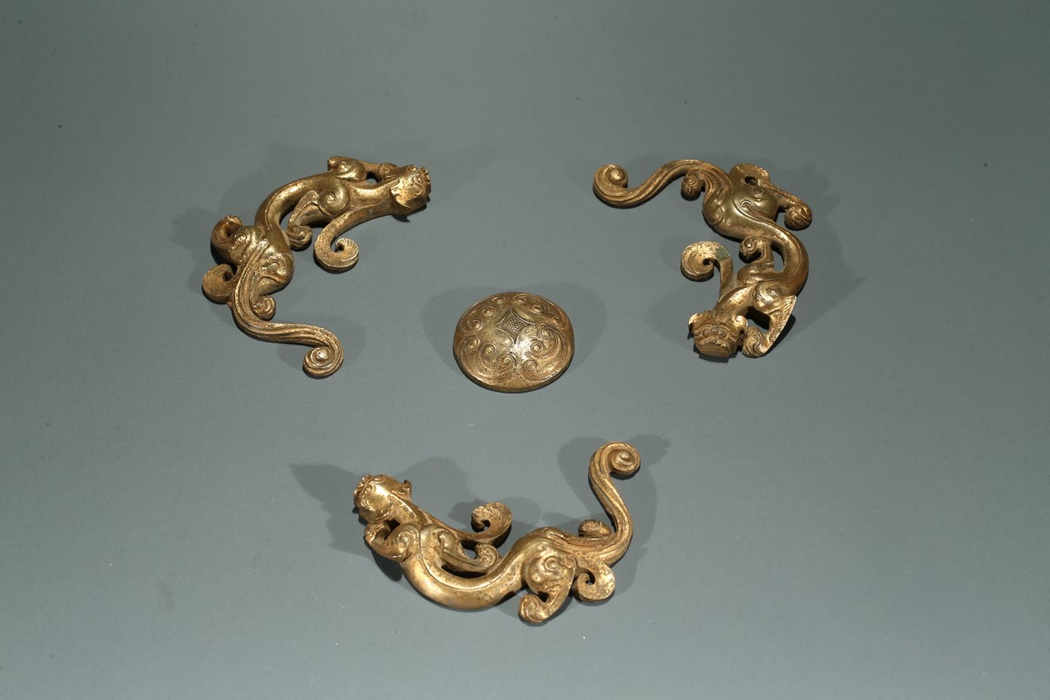 Han Dynasty period. The group consisting of three sinuous chilong dragons and one circular ornament at the center, the gilding with scratches and loss.