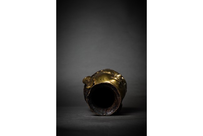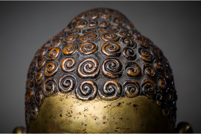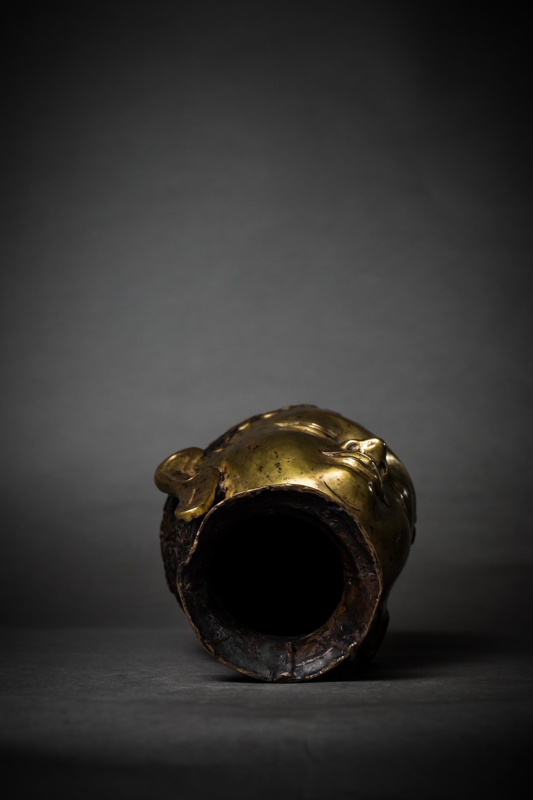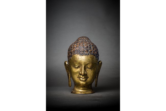 此尊佛頭體型巨大,十分罕見,頂有肉髻,細長的彎眉,雙眼俯視,隆鼻挺秀,雙唇微啟,大耳垂肩,一副慈善、笑意濃濃的面相豁然於眼前。整個佛首保留原裝鎏金,狀態完好,其整體造型典雅,氣韻不凡,端莊大氣,雄渾沉穩,不失為一件空間呈設之藝術上品。佛頭體型巨大,有如此巨大佛頭,可以想像當年完整佛身應是何等壯觀,著實讓人感嘆古人鑄造技藝之高超,敬佛崇聖之心誠。