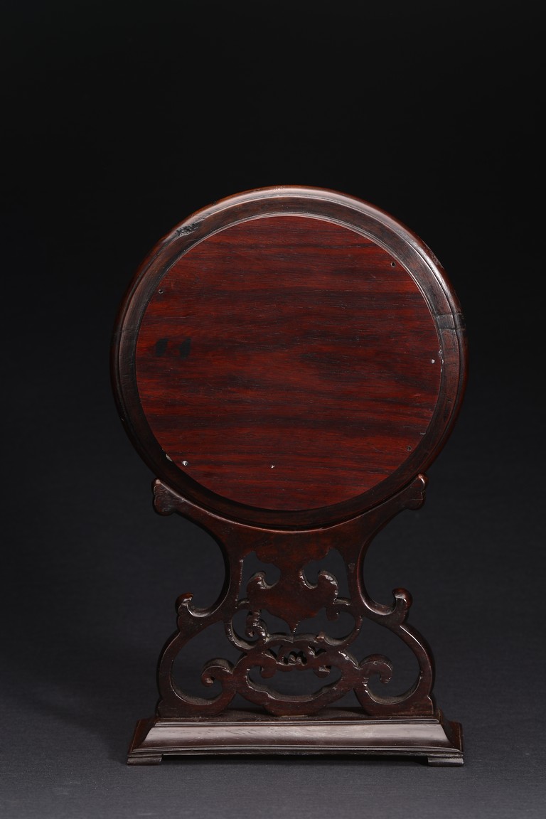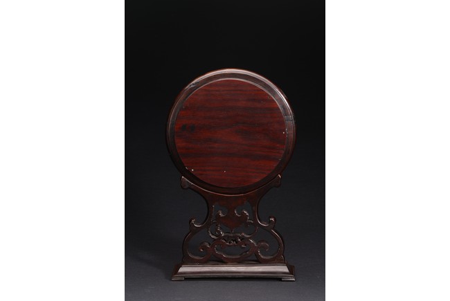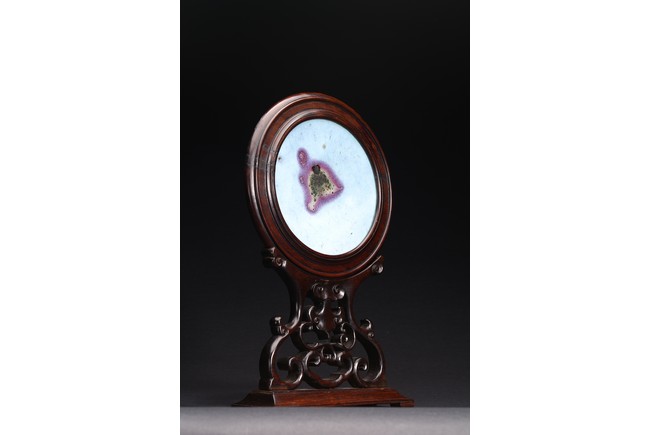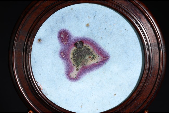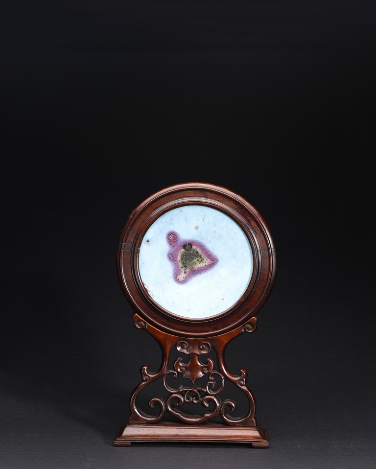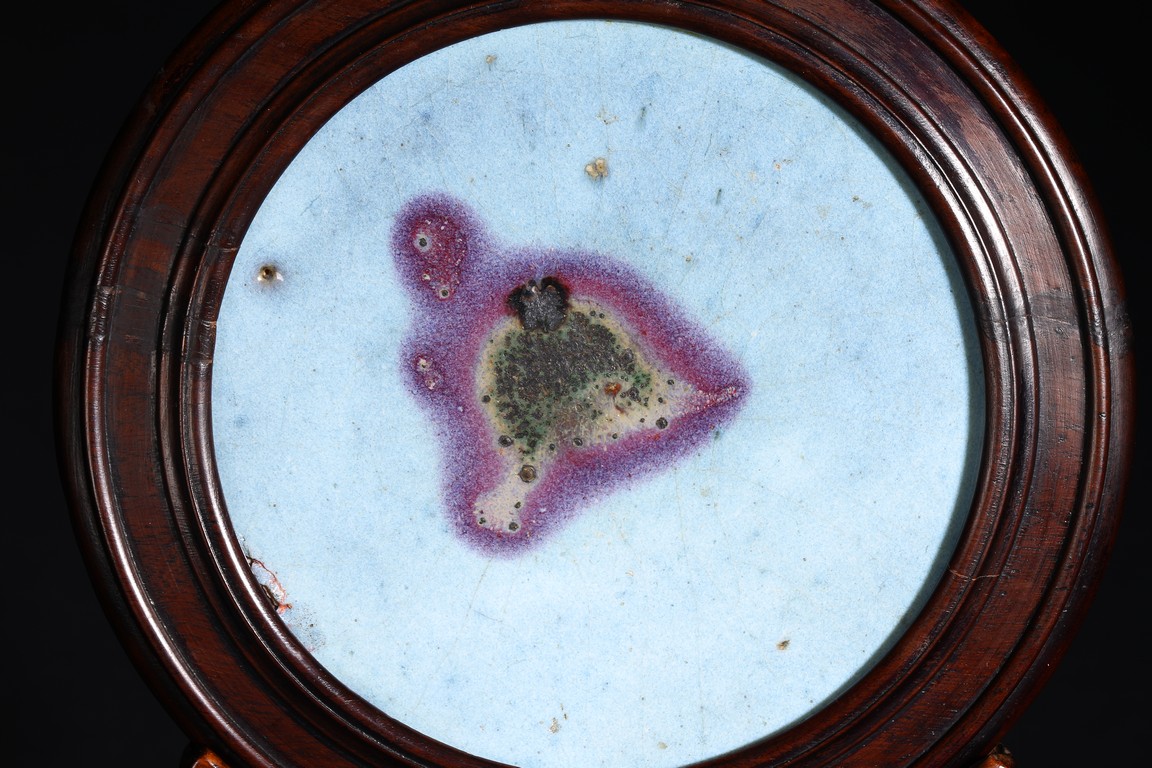 Qing Dynasty period. The circular panel with purple splash on lavender blue, hardwood frame and stand.