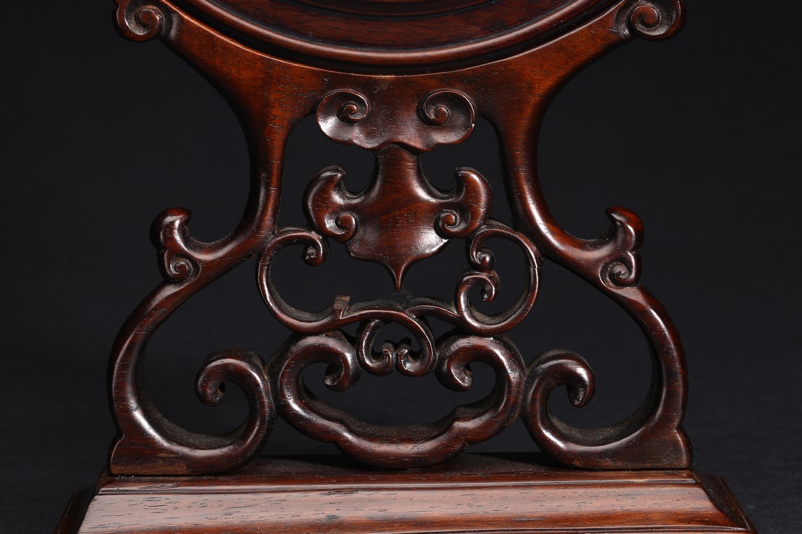 插屏圓形,鈞瓷嵌於圓形紅木屏框,框下連有鏤雕座,質地細膩光滑。鈞瓷之美勝在釉色,以紫鈞最為典雅,釉彩之絢麗燦若晚霞。本品大部分為天青色濃釉,內有玫瑰紫釉,釉彩瑰麗,釉層凝厚滋潤,淡雅的天青色與絢爛的玫瑰紫相得益彰。別見一番古樸典雅之風韻。
