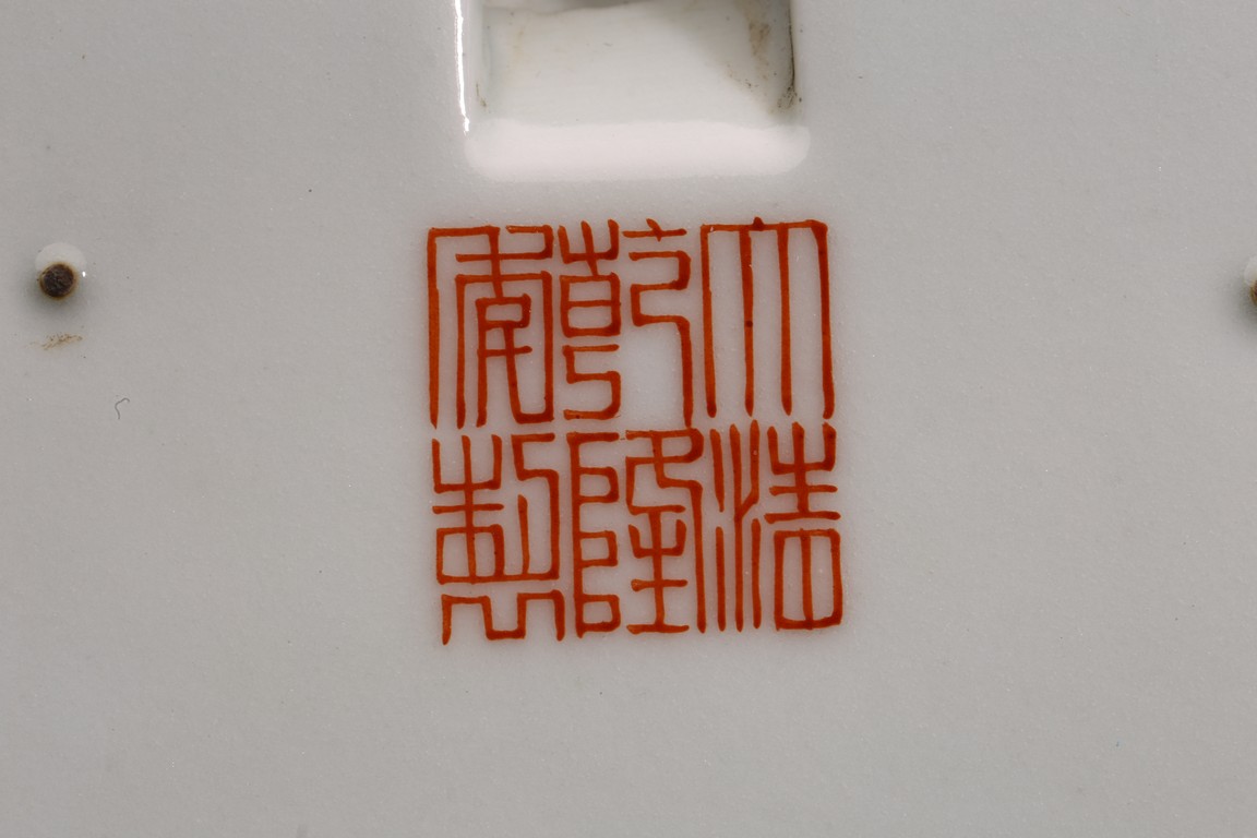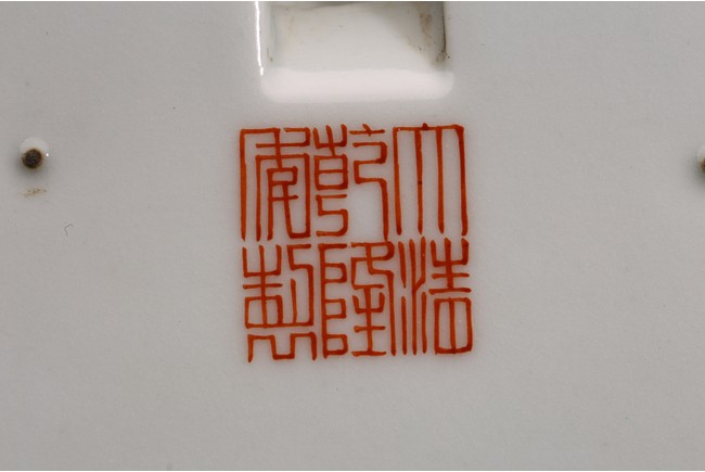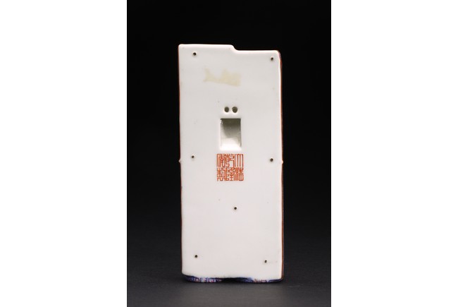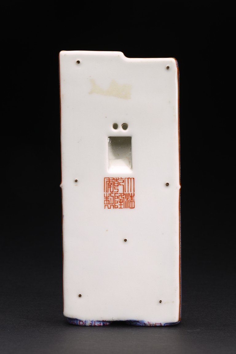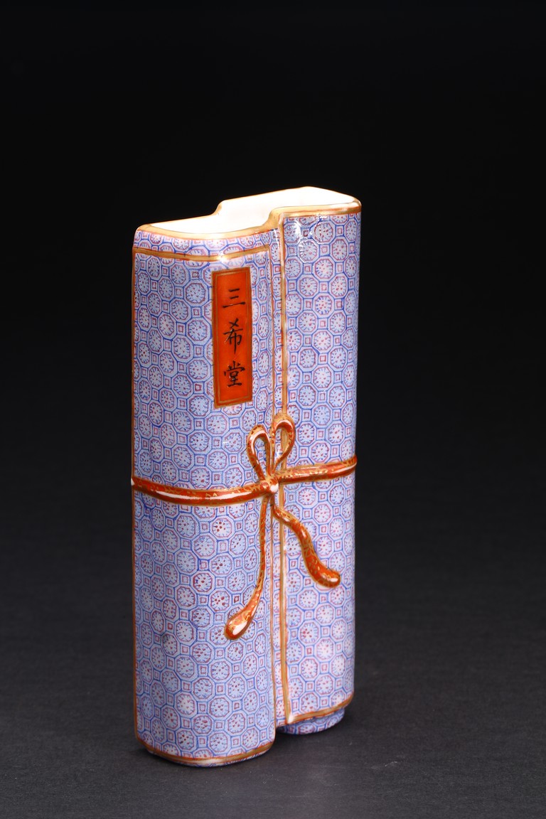 乾隆皇帝特別鐘情於壁瓶,曾將十四式壁瓶掛飾在珍藏稀世法帖的養心殿三希堂的東板墻上。本器為書卷式,帶有系帶,其器形獨特,紋飾優美,粉彩以“花格紋”為地,雖繁覆,但毫不淩亂。正面左上角見垂直的長方形框子,內為紅地,墨彩書“三希堂”三字。字型古雅。反面“大清乾隆年制”款識。