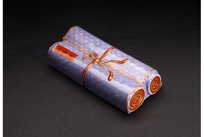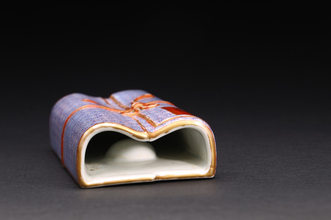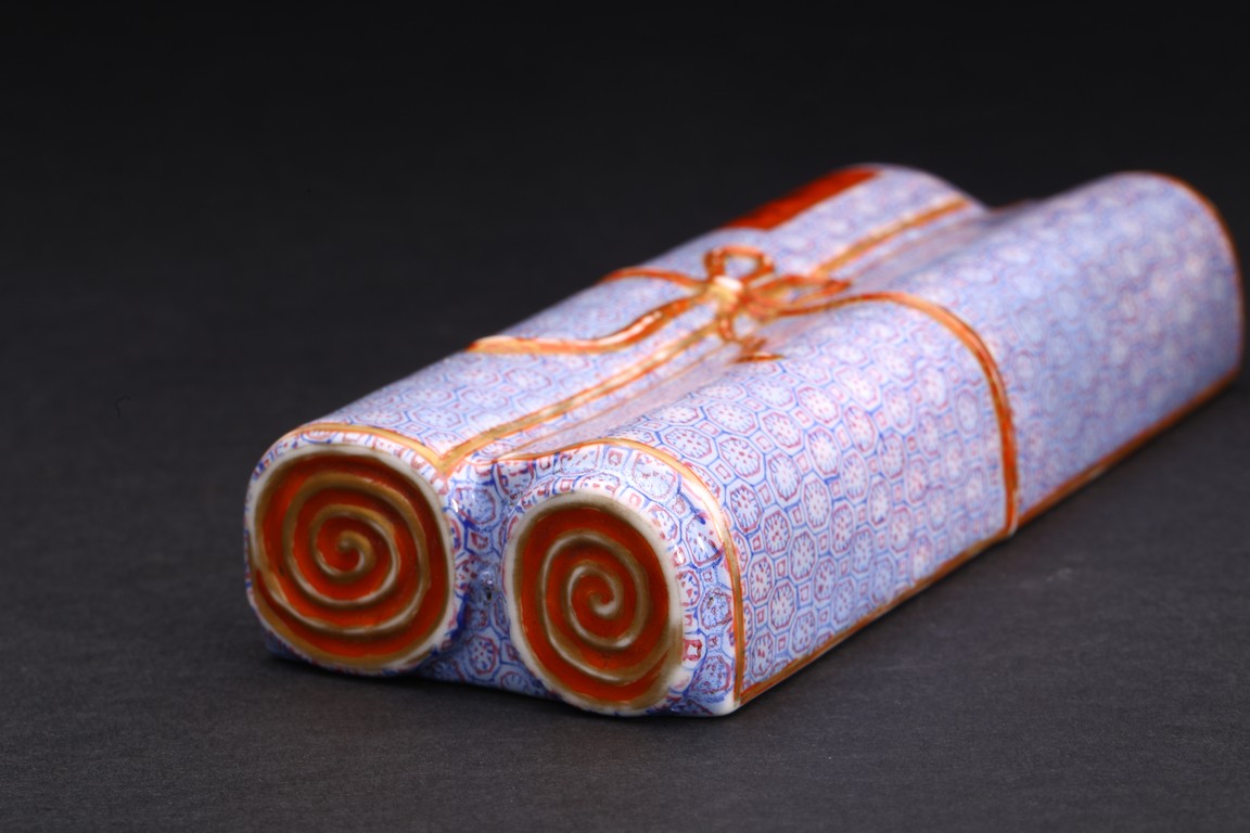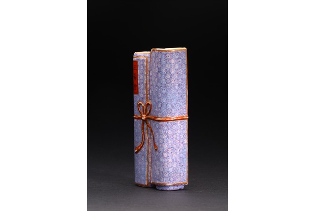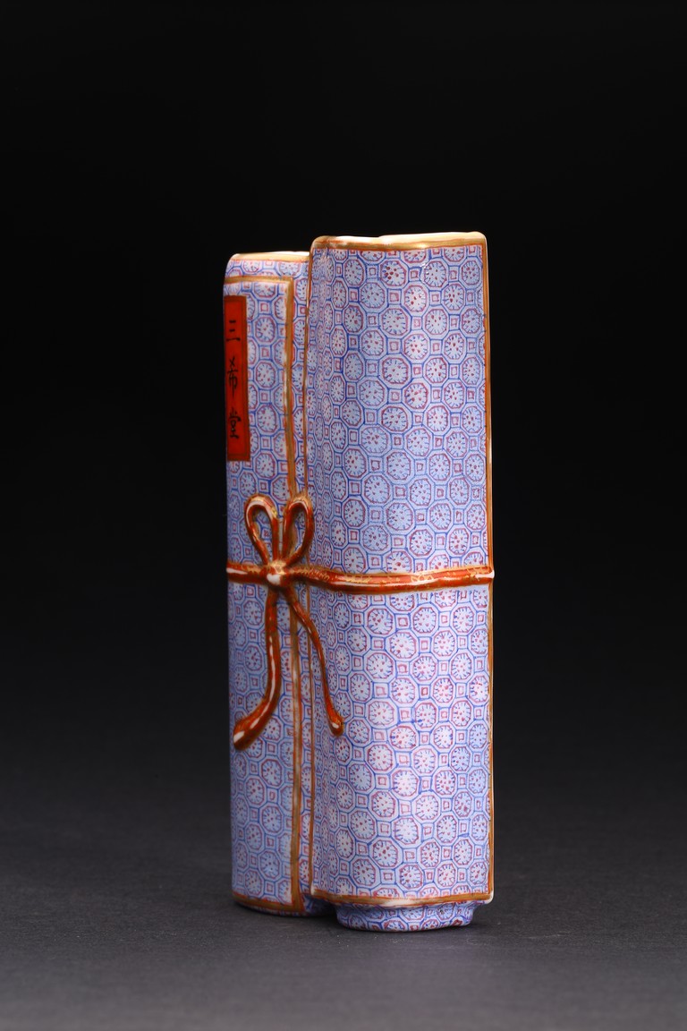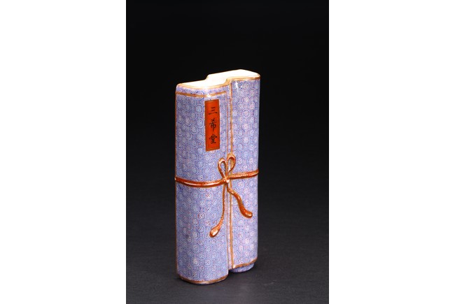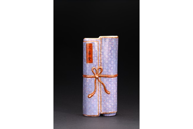 Qing Dynasty period. Modelled in the form of a scroll tied with string at the center, with three character San Xi Tang at top left corner, the back with six character Qian long mark.