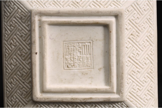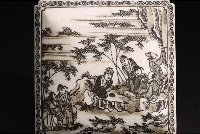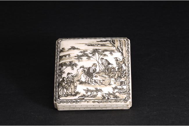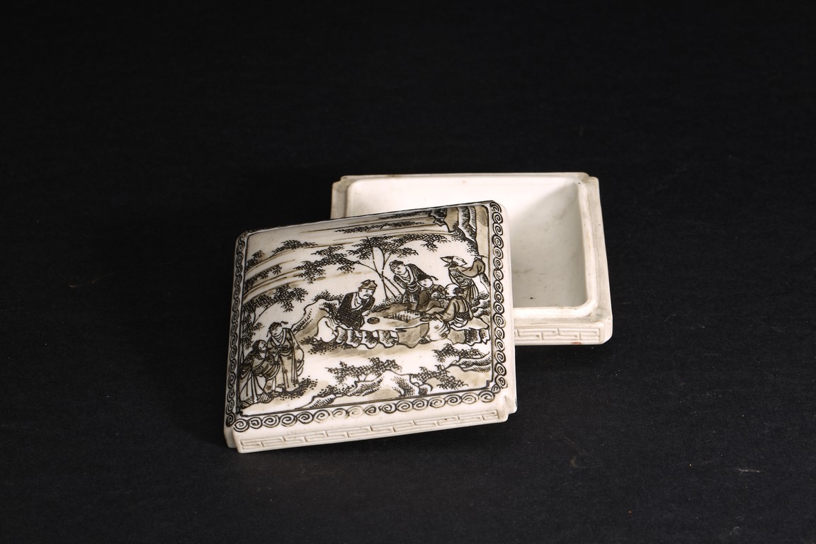 Of square form, the cover painted with scholars engaging in leisures, base with mark.